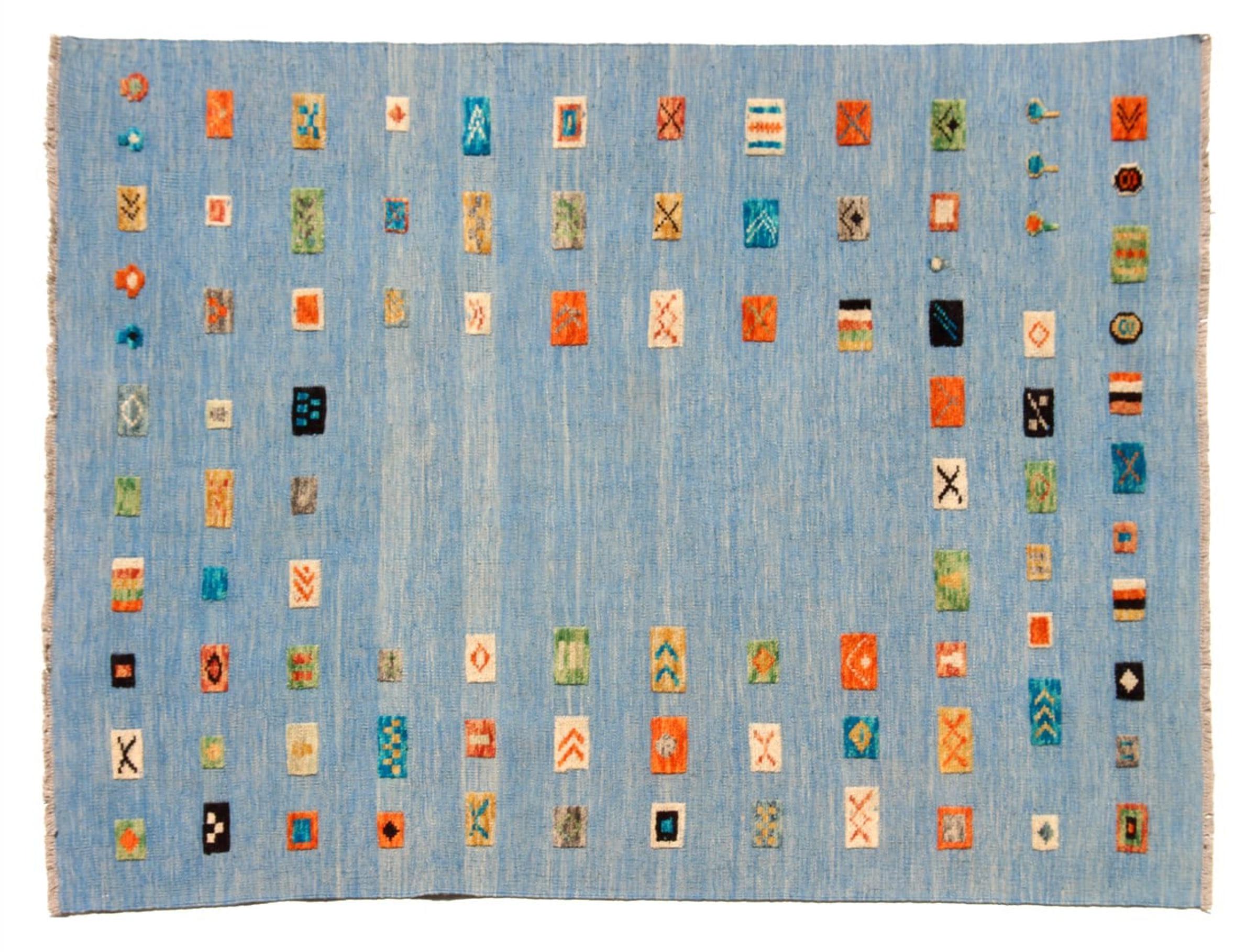 Estas alfombras kilim muestran una diferencia decisiva con las alfombras anudadas a mano - son tejidas a mano. Por lo tanto, no tienen un montón alto de lana y son a menudo más planos y más ásperos que las alfombras de lana anudada. Su fabricación es menos elaborada y por eso suelen ser mucho más baratas. Como ventaja, las alfombras de kilim son también mucho más ligeras y pueden ser colocadas por delante y por detrás. Los kilims tejidos a mano provienen originalmente de la antigua Persia y ahora también se fabrican a menudo en el Afganistán. Tienen patrones bastante simples y directos, que se deben a su técnica de tejido.