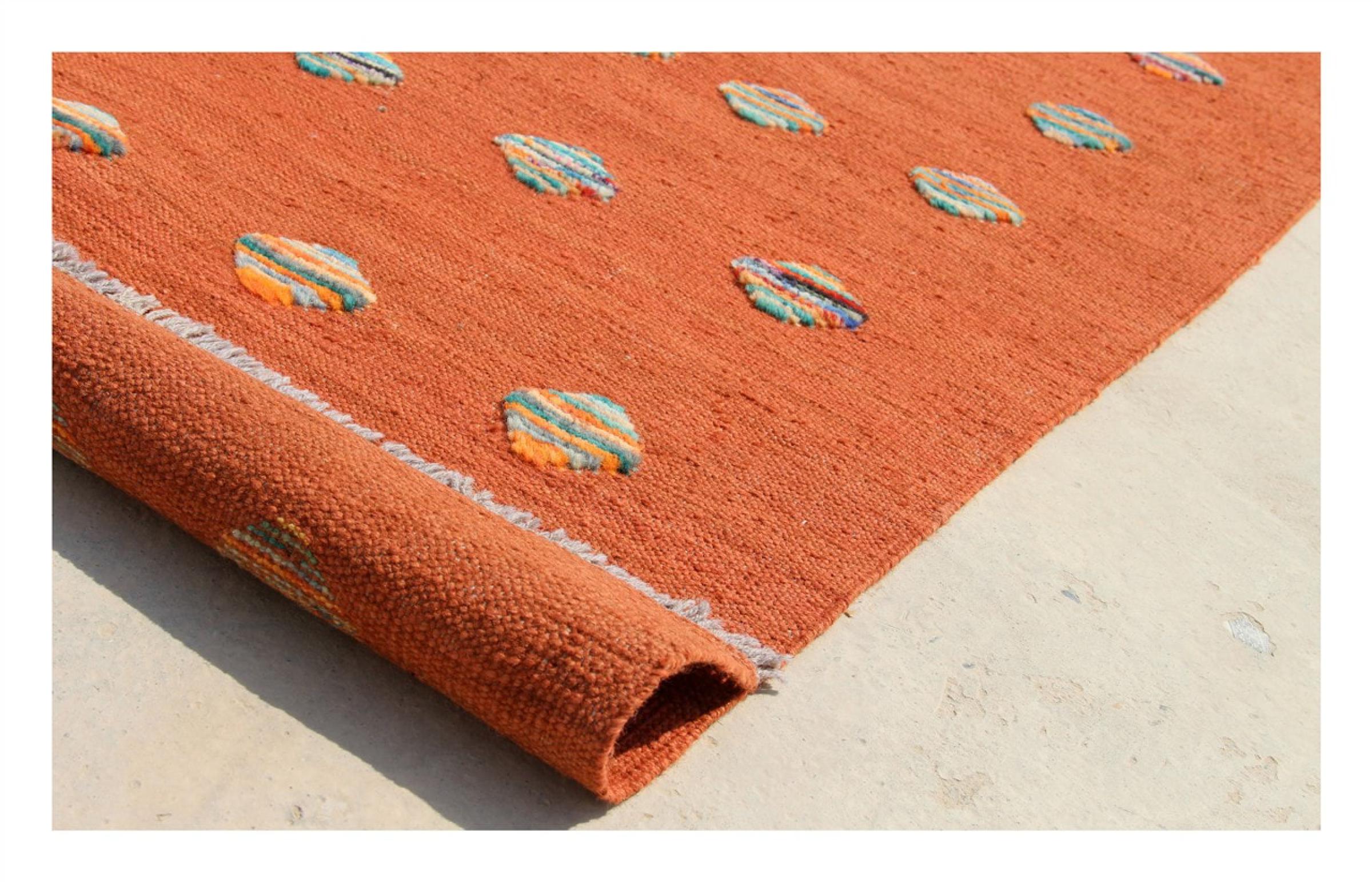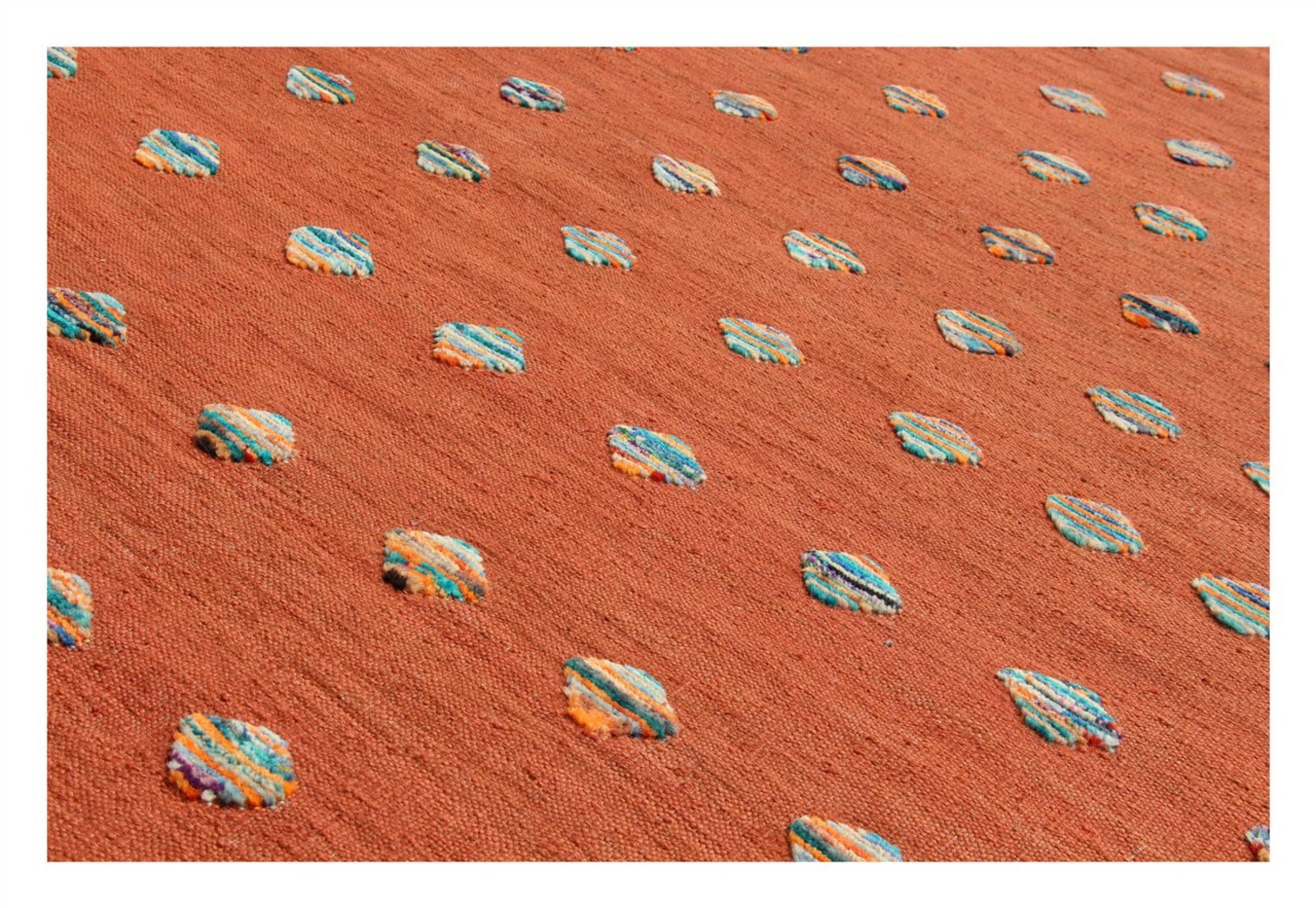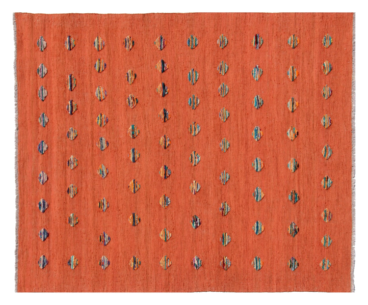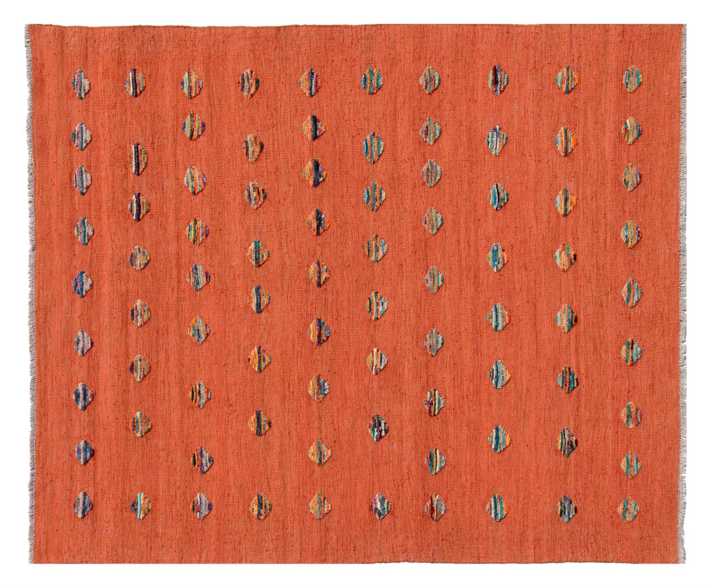 Esta alfombra fue hecha a mano en un telar como un tejido plano. Tejido plano es el término utilizado para describir las alfombras que no tienen pelo. Como el nombre promete, estas alfombras están tejidas y no anudadas. Esto resulta en una alfombra plana con una superficie estructurada. Los tejidos planos no son tan suaves y normalmente más delgados que las alfombras anudadas. Al mismo tiempo, su fabricación es mucho menos compleja y por lo general se pueden disponer por ambos lados (frontal y posterior). Sus patrones suelen ser geométricos, lo cual está determinado por el tejido.
