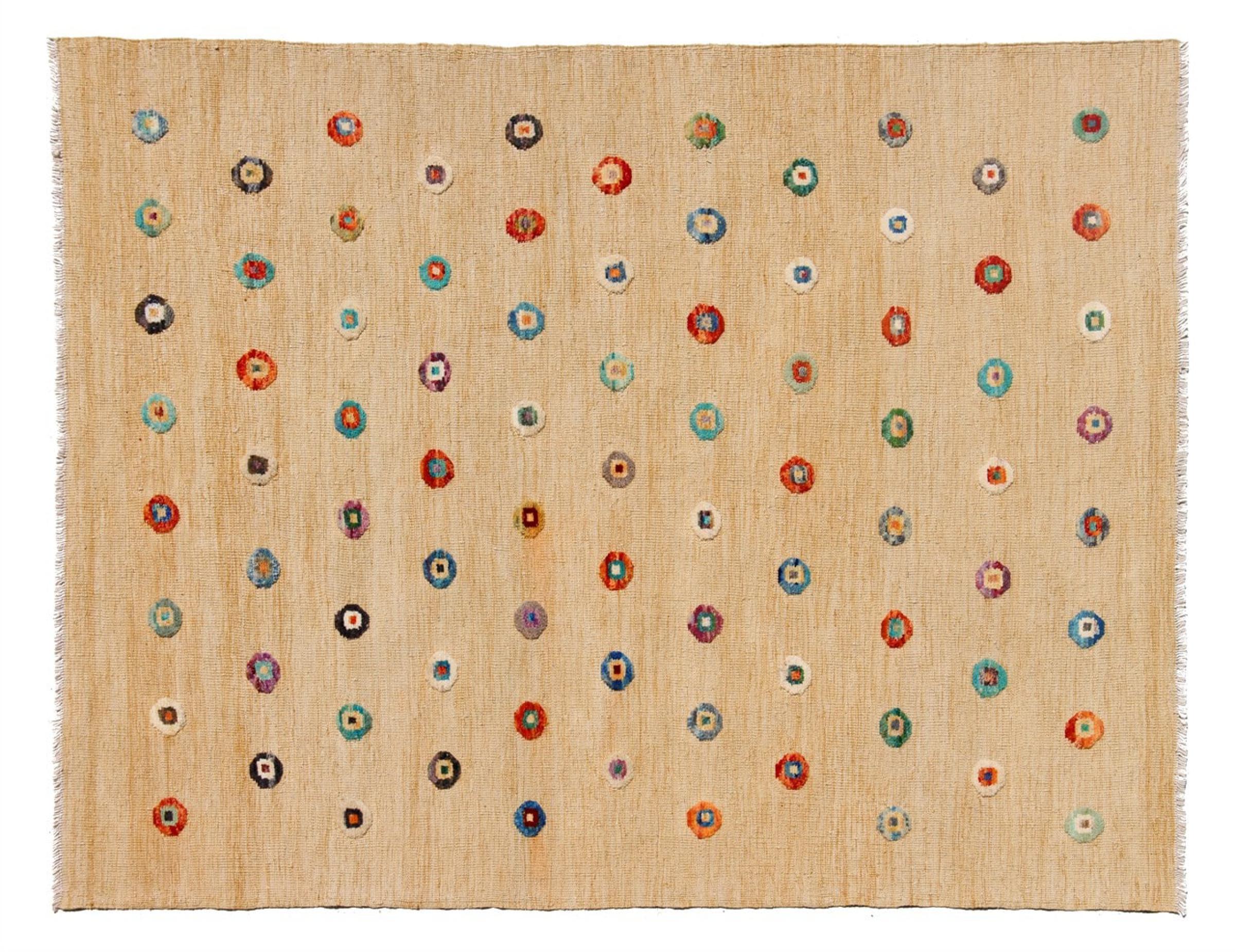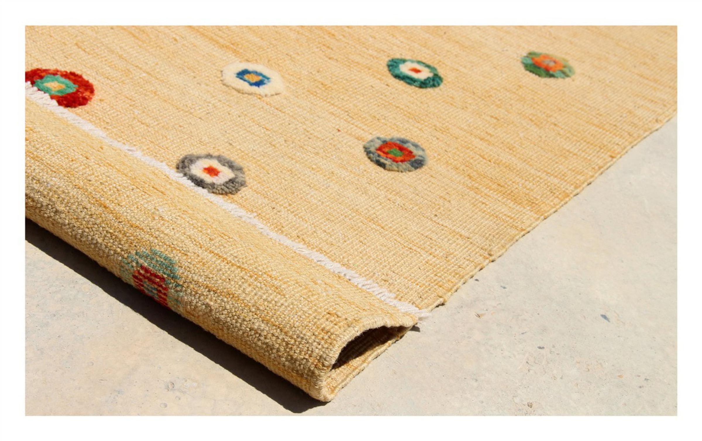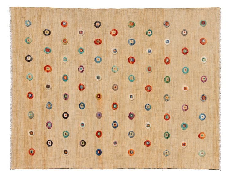 Esta alfombra fue hecha a mano en un telar como un tejido plano. Tejido plano es el término utilizado para describir las alfombras que no tienen pelo. Como el nombre promete, estas alfombras están tejidas y no anudadas. Esto resulta en una alfombra plana con una superficie estructurada. Los tejidos planos no son tan suaves y normalmente más delgados que las alfombras anudadas. Al mismo tiempo, su fabricación es mucho menos compleja y por lo general se pueden disponer por ambos lados (frontal y posterior). Sus patrones suelen ser geométricos, lo cual está determinado por el tejido.