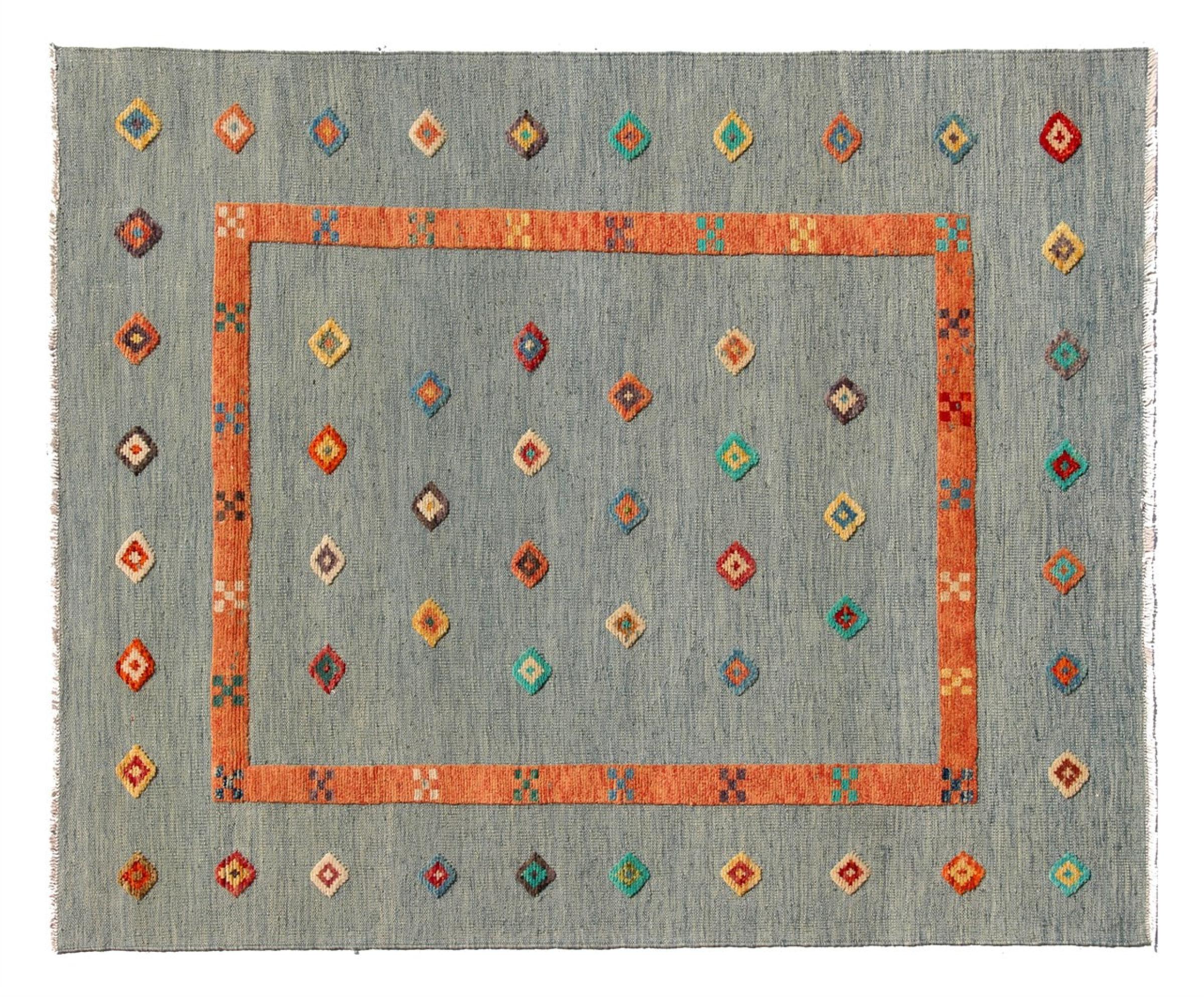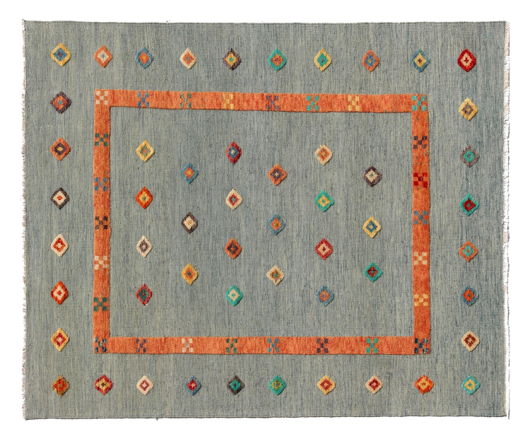 Esta alfombra fue hecha a mano en un telar como un tejido plano. Tejido plano es el término utilizado para describir las alfombras que no tienen pelo. Como el nombre promete, estas alfombras están tejidas y no anudadas. Esto resulta en una alfombra plana con una superficie estructurada. Los tejidos planos no son tan suaves y normalmente más delgados que las alfombras anudadas. Al mismo tiempo, su fabricación es mucho menos compleja y por lo general se pueden disponer por ambos lados (frontal y posterior). Sus patrones suelen ser geométricos, lo cual está determinado por el tejido.