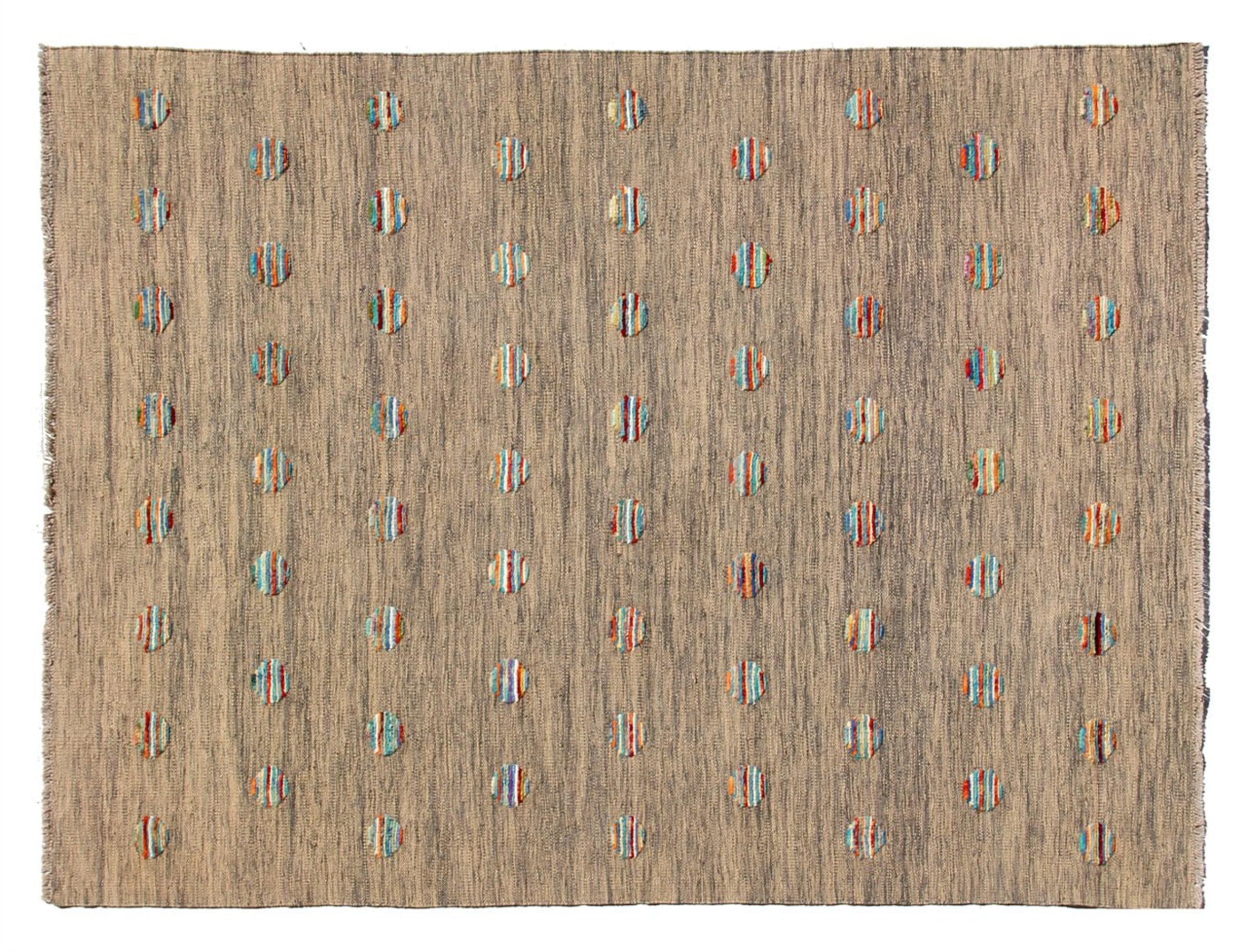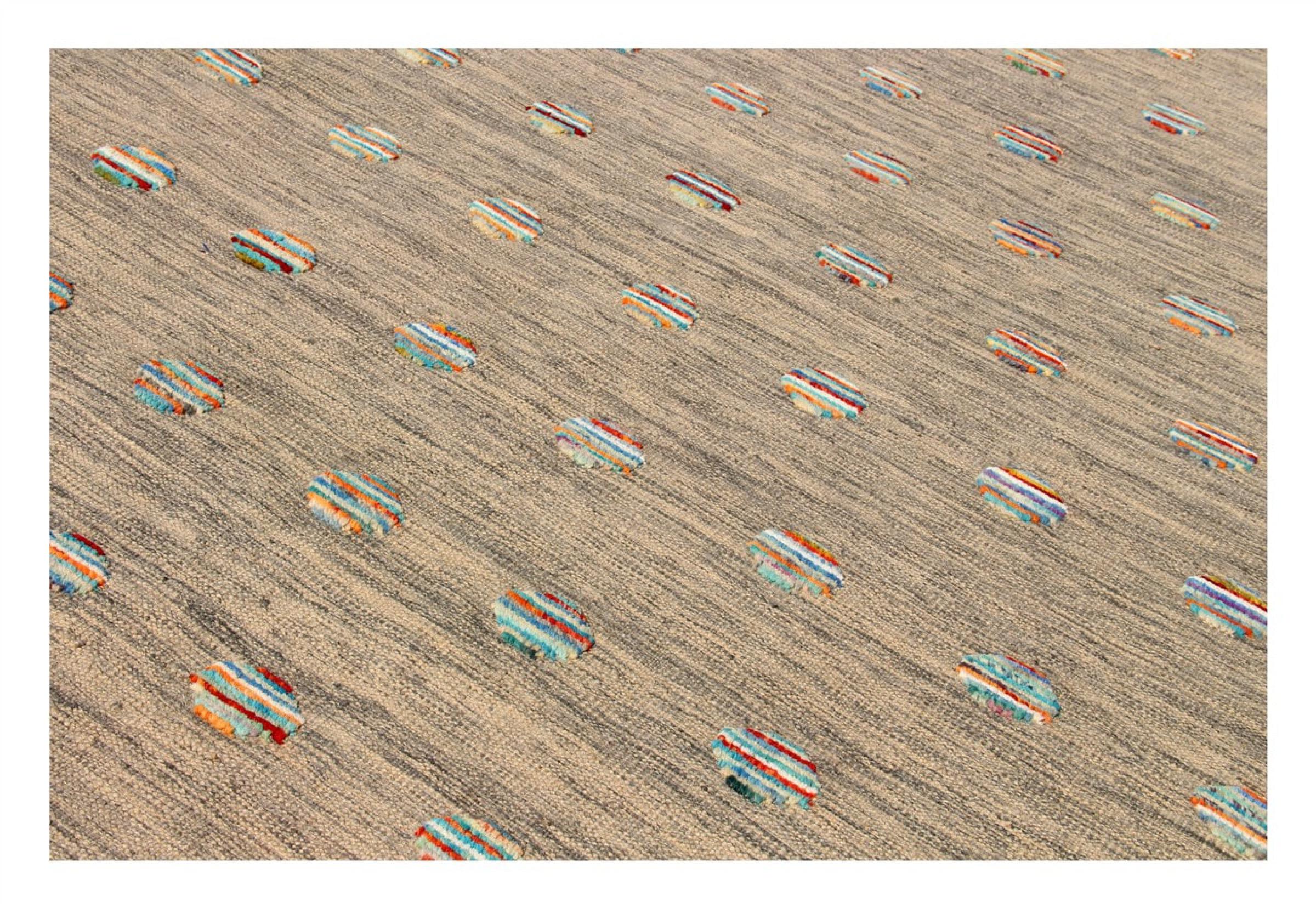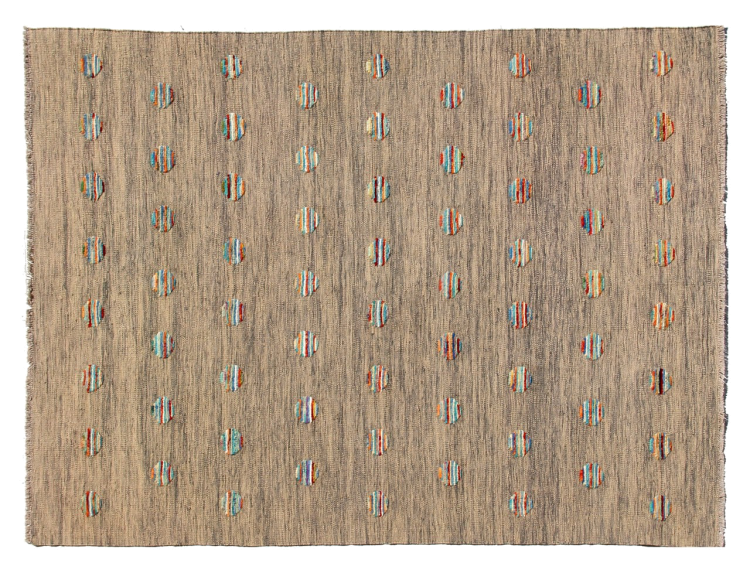 Esta alfombra fue hecha a mano en un telar como un tejido plano. Tejido plano es el término utilizado para describir las alfombras que no tienen pelo. Como el nombre promete, estas alfombras están tejidas y no anudadas. Esto resulta en una alfombra plana con una superficie estructurada. Los tejidos planos no son tan suaves y normalmente más delgados que las alfombras anudadas. Al mismo tiempo, su fabricación es mucho menos compleja y por lo general se pueden disponer por ambos lados (frontal y posterior). Sus patrones suelen ser geométricos, lo cual está determinado por el tejido.