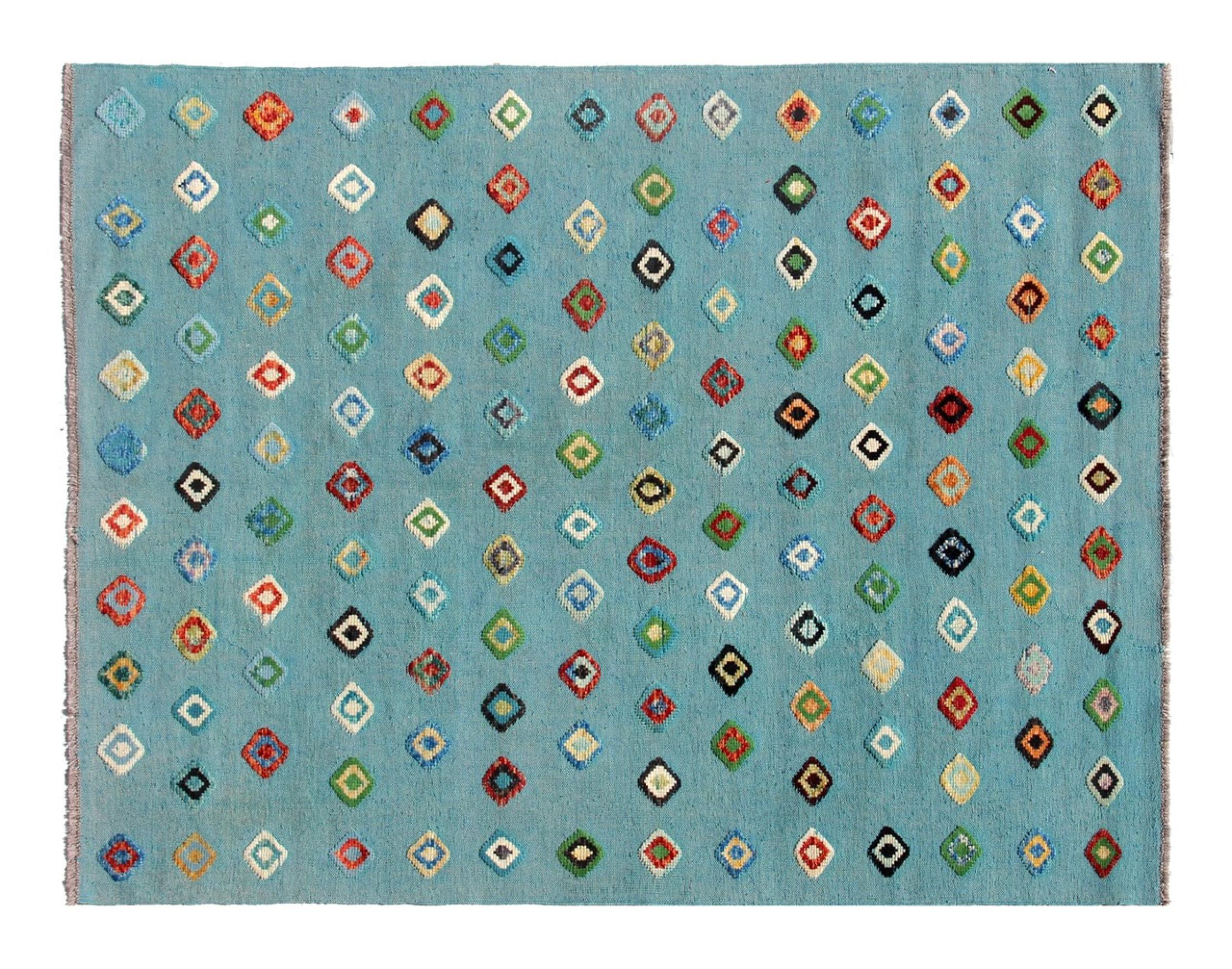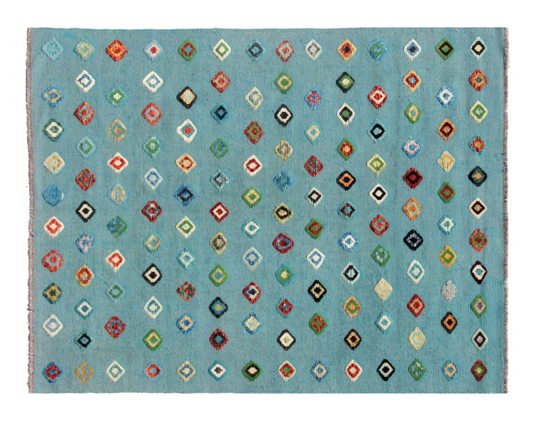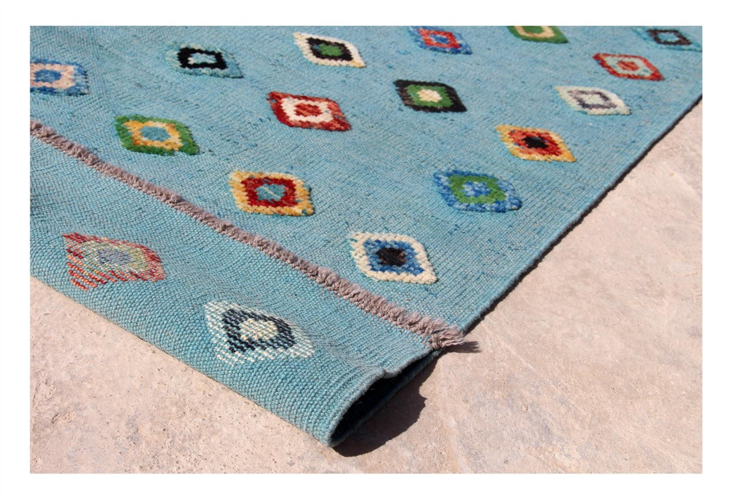 Esta alfombra fue hecha a mano en un telar como un tejido plano. Tejido plano es el término utilizado para describir las alfombras que no tienen pelo. Como el nombre promete, estas alfombras están tejidas y no anudadas. Esto resulta en una alfombra plana con una superficie estructurada. Los tejidos planos no son tan suaves y normalmente más delgados que las alfombras anudadas. Al mismo tiempo, su fabricación es mucho menos compleja y por lo general se pueden disponer por ambos lados (frontal y posterior). Sus patrones suelen ser geométricos, lo cual está determinado por el tejido.