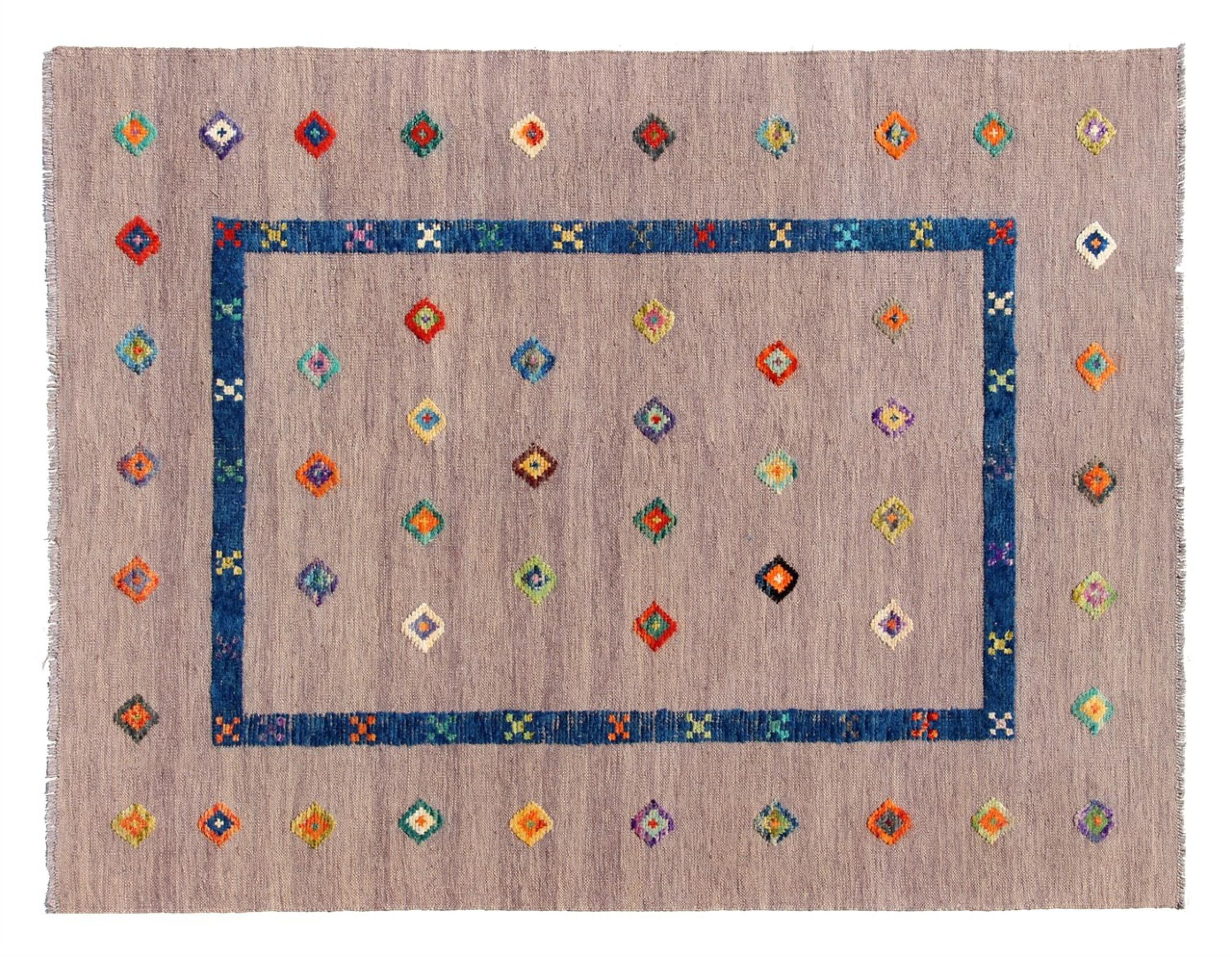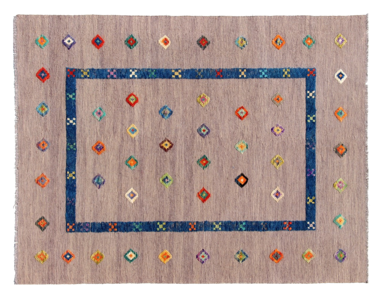 Esta alfombra fue hecha a mano en un telar como un tejido plano. Tejido plano es el término utilizado para describir las alfombras que no tienen pelo. Como el nombre promete, estas alfombras están tejidas y no anudadas. Esto resulta en una alfombra plana con una superficie estructurada. Los tejidos planos no son tan suaves y normalmente más delgados que las alfombras anudadas. Al mismo tiempo, su fabricación es mucho menos compleja y por lo general se pueden disponer por ambos lados (frontal y posterior). Sus patrones suelen ser geométricos, lo cual está determinado por el tejido.