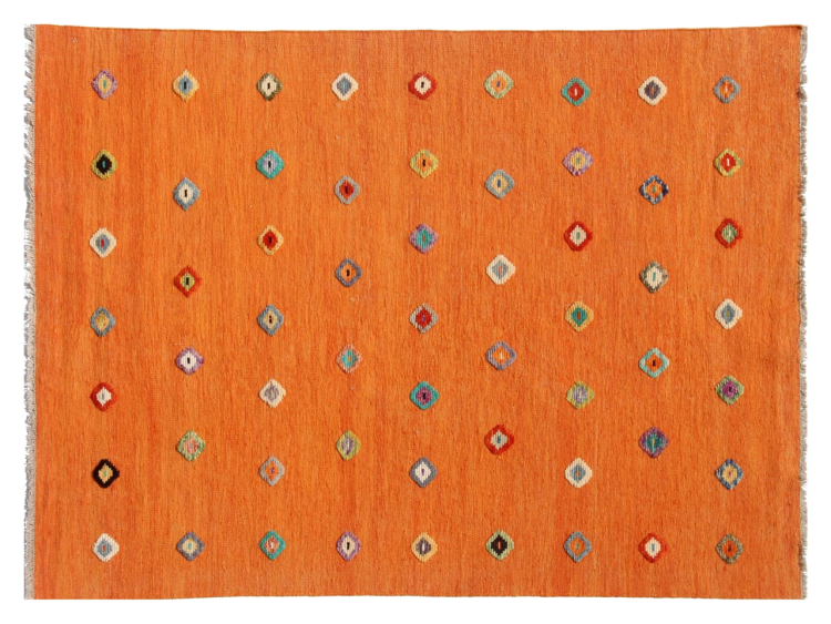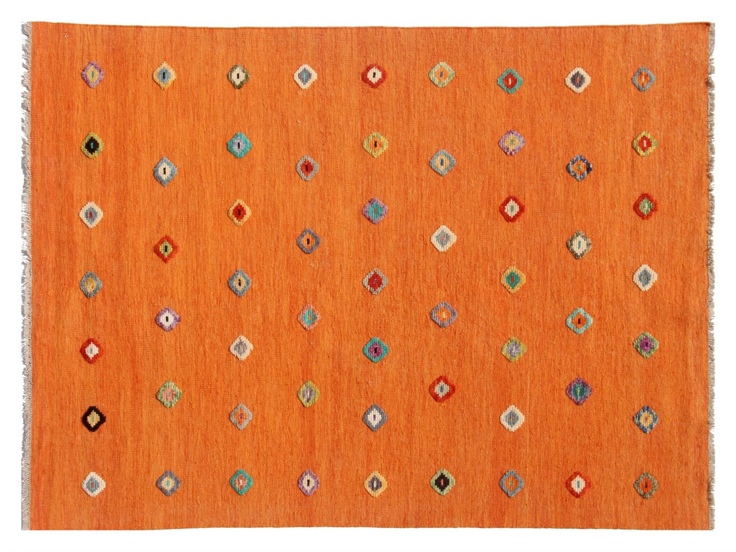 Esta alfombra fue hecha a mano en un telar como un tejido plano. Tejido plano es el término utilizado para describir las alfombras que no tienen pelo. Como el nombre promete, estas alfombras están tejidas y no anudadas. Esto resulta en una alfombra plana con una superficie estructurada. Los tejidos planos no son tan suaves y normalmente más delgados que las alfombras anudadas. Al mismo tiempo, su fabricación es mucho menos compleja y por lo general se pueden disponer por ambos lados (frontal y posterior). Sus patrones suelen ser geométricos, lo cual está determinado por el tejido.