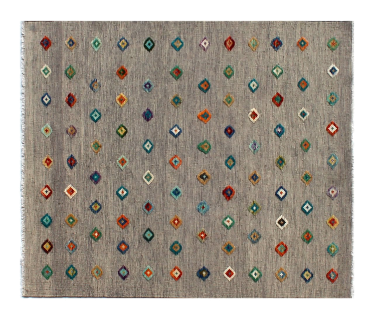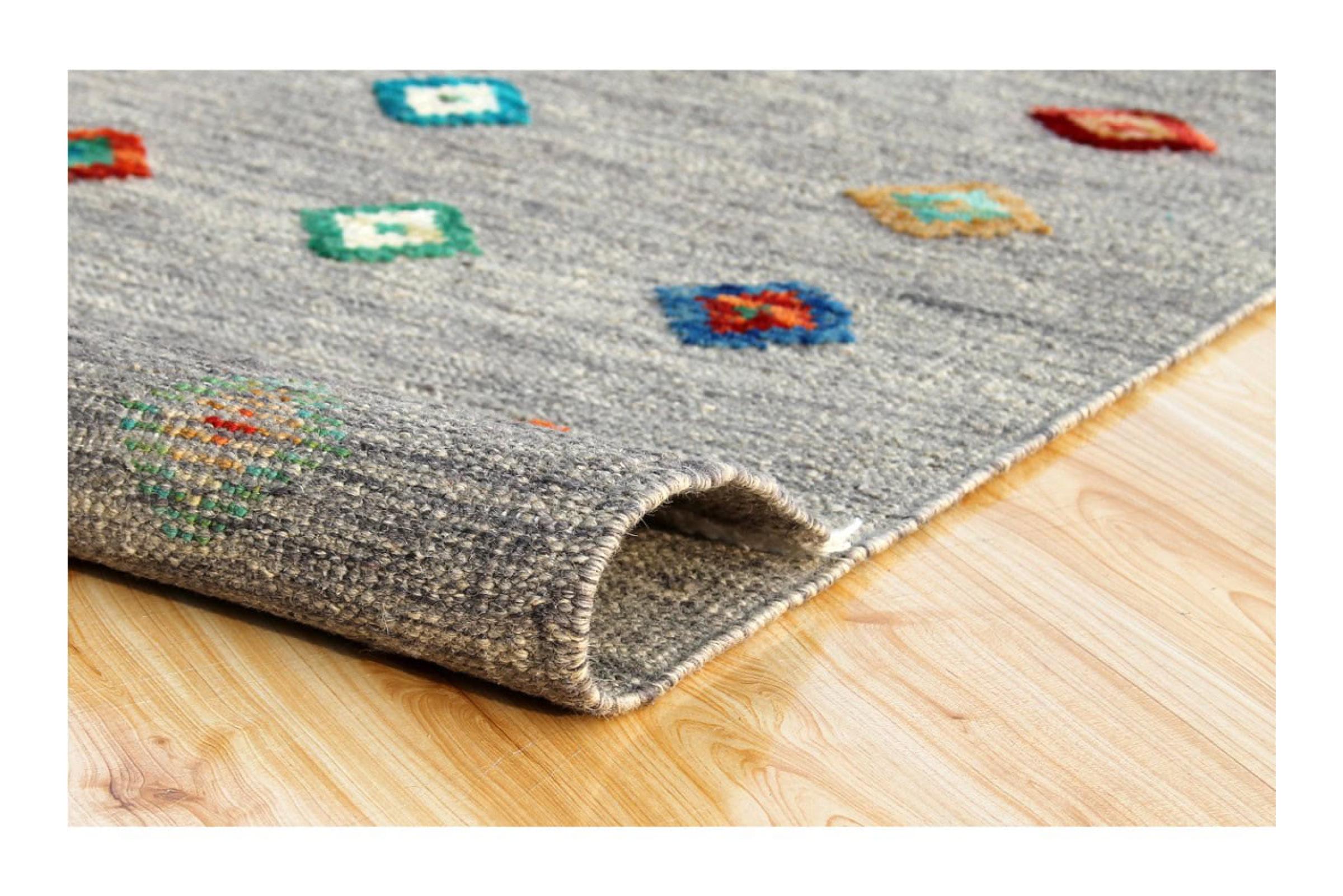 Esta alfombra fue hecha a mano en un telar como un tejido plano. Tejido plano es el término utilizado para describir las alfombras que no tienen pelo. Como el nombre promete, estas alfombras están tejidas y no anudadas. Esto resulta en una alfombra plana con una superficie estructurada. Los tejidos planos no son tan suaves y normalmente más delgados que las alfombras anudadas. Al mismo tiempo, su fabricación es mucho menos compleja y por lo general se pueden disponer por ambos lados (frontal y posterior). Sus patrones suelen ser geométricos, lo cual está determinado por el tejido.