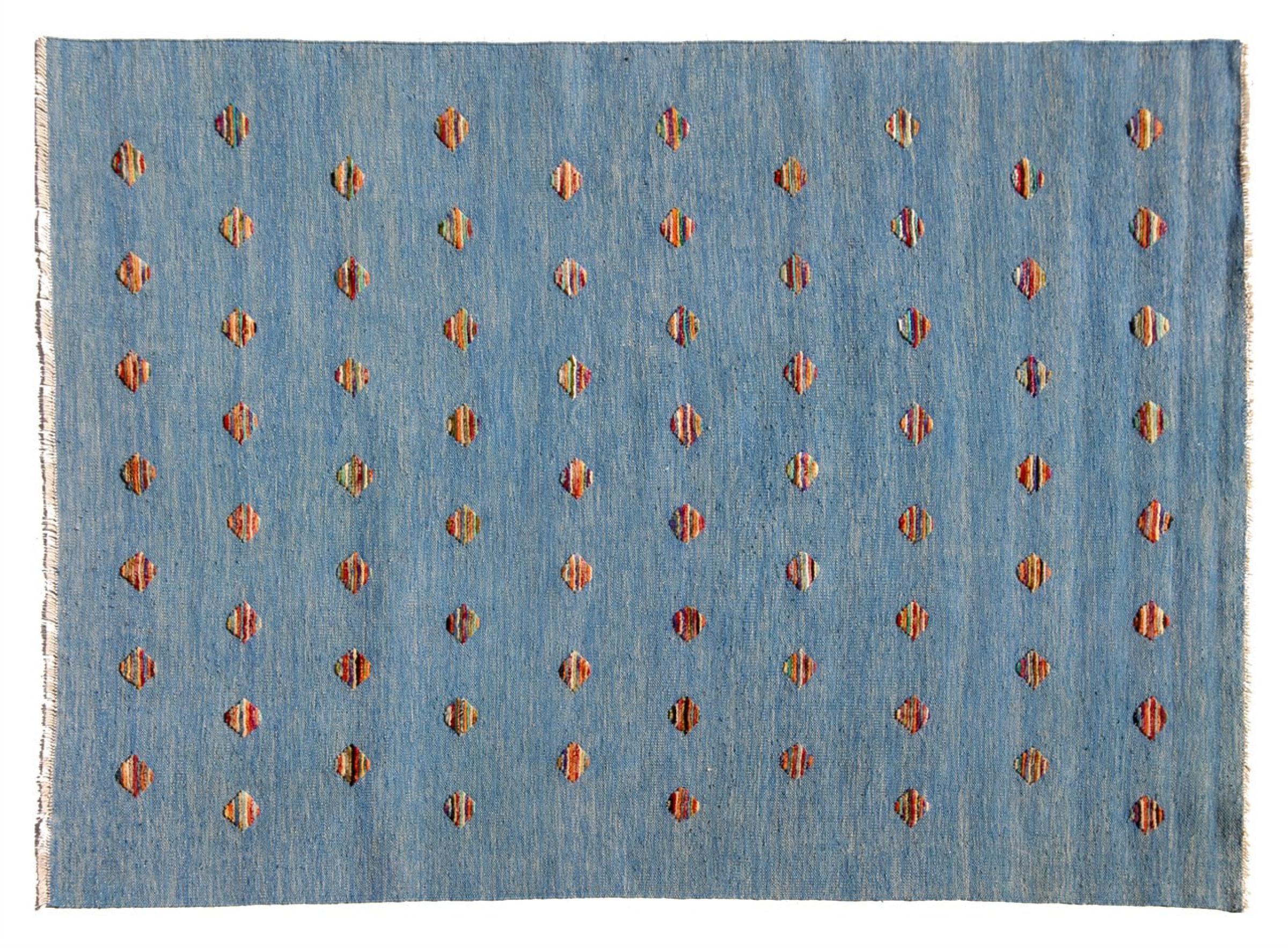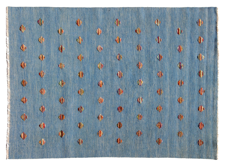 Esta alfombra fue hecha a mano en un telar como un tejido plano. Tejido plano es el término utilizado para describir las alfombras que no tienen pelo. Como el nombre promete, estas alfombras están tejidas y no anudadas. Esto resulta en una alfombra plana con una superficie estructurada. Los tejidos planos no son tan suaves y normalmente más delgados que las alfombras anudadas. Al mismo tiempo, su fabricación es mucho menos compleja y por lo general se pueden disponer por ambos lados (frontal y posterior). Sus patrones suelen ser geométricos, lo cual está determinado por el tejido.