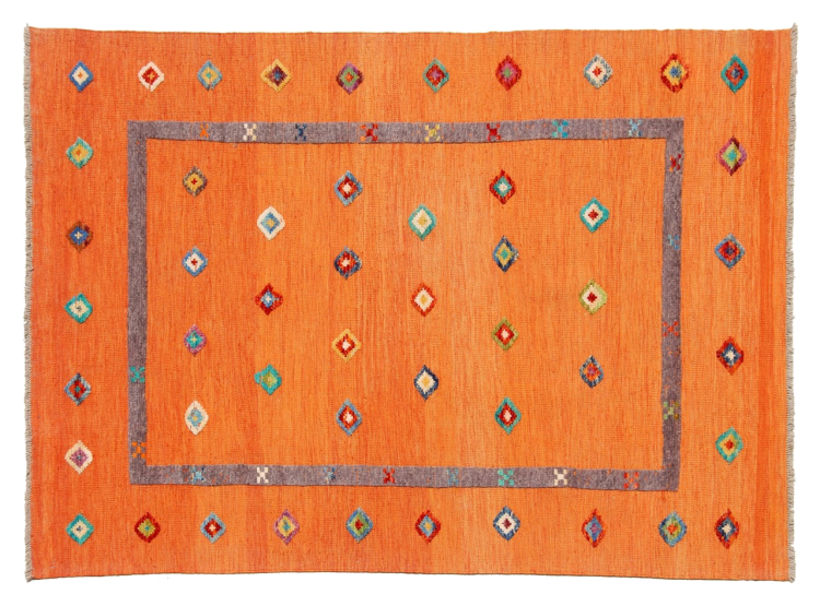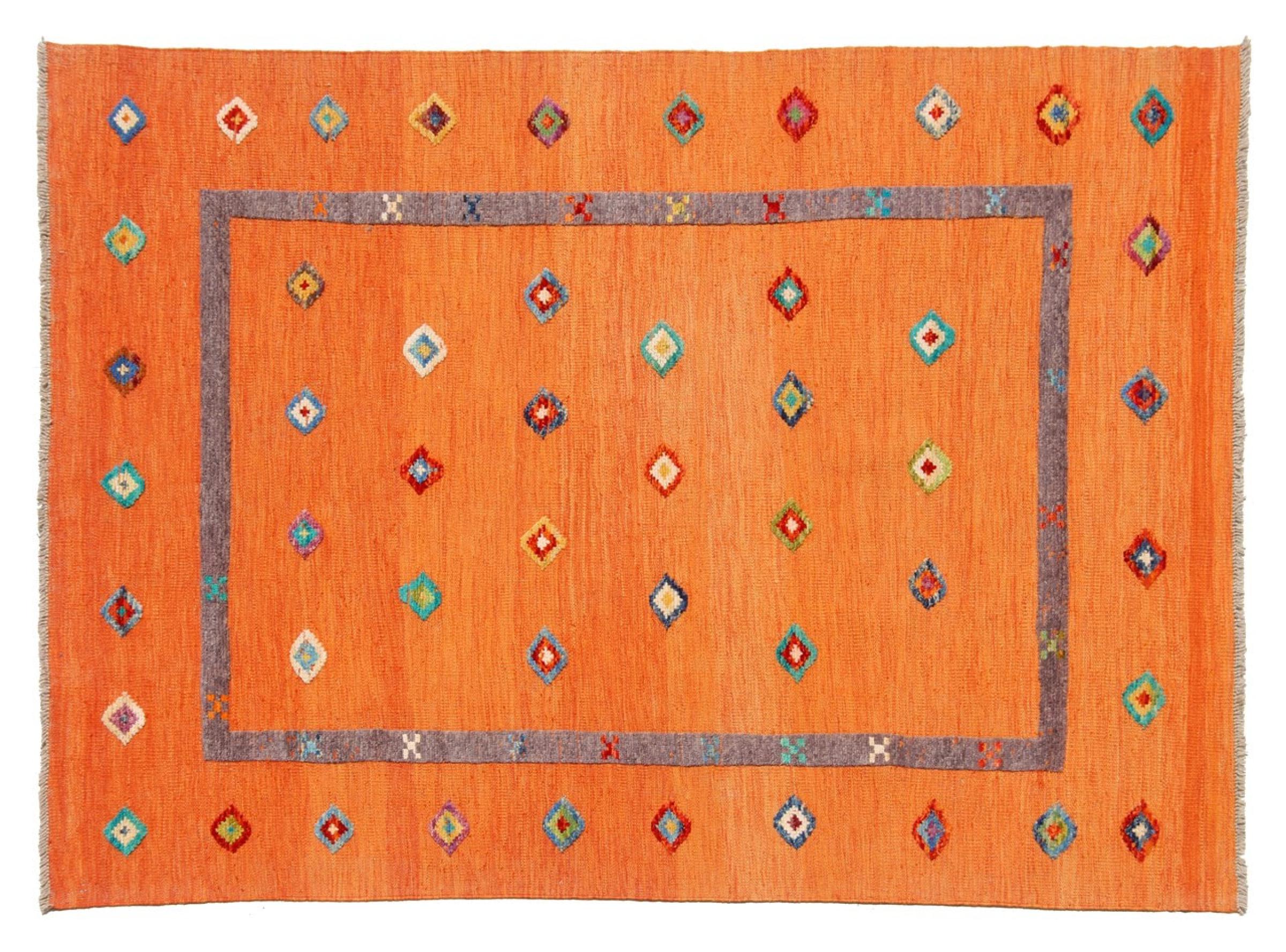 Esta alfombra fue hecha a mano en un telar como un tejido plano. Tejido plano es el término utilizado para describir las alfombras que no tienen pelo. Como el nombre promete, estas alfombras están tejidas y no anudadas. Esto resulta en una alfombra plana con una superficie estructurada. Los tejidos planos no son tan suaves y normalmente más delgados que las alfombras anudadas. Al mismo tiempo, su fabricación es mucho menos compleja y por lo general se pueden disponer por ambos lados (frontal y posterior). Sus patrones suelen ser geométricos, lo cual está determinado por el tejido.