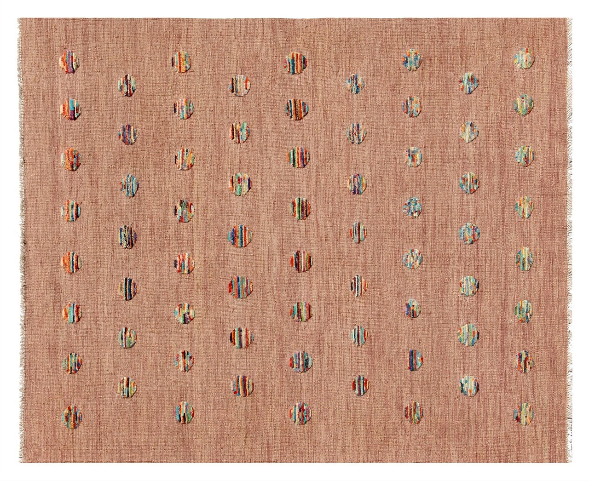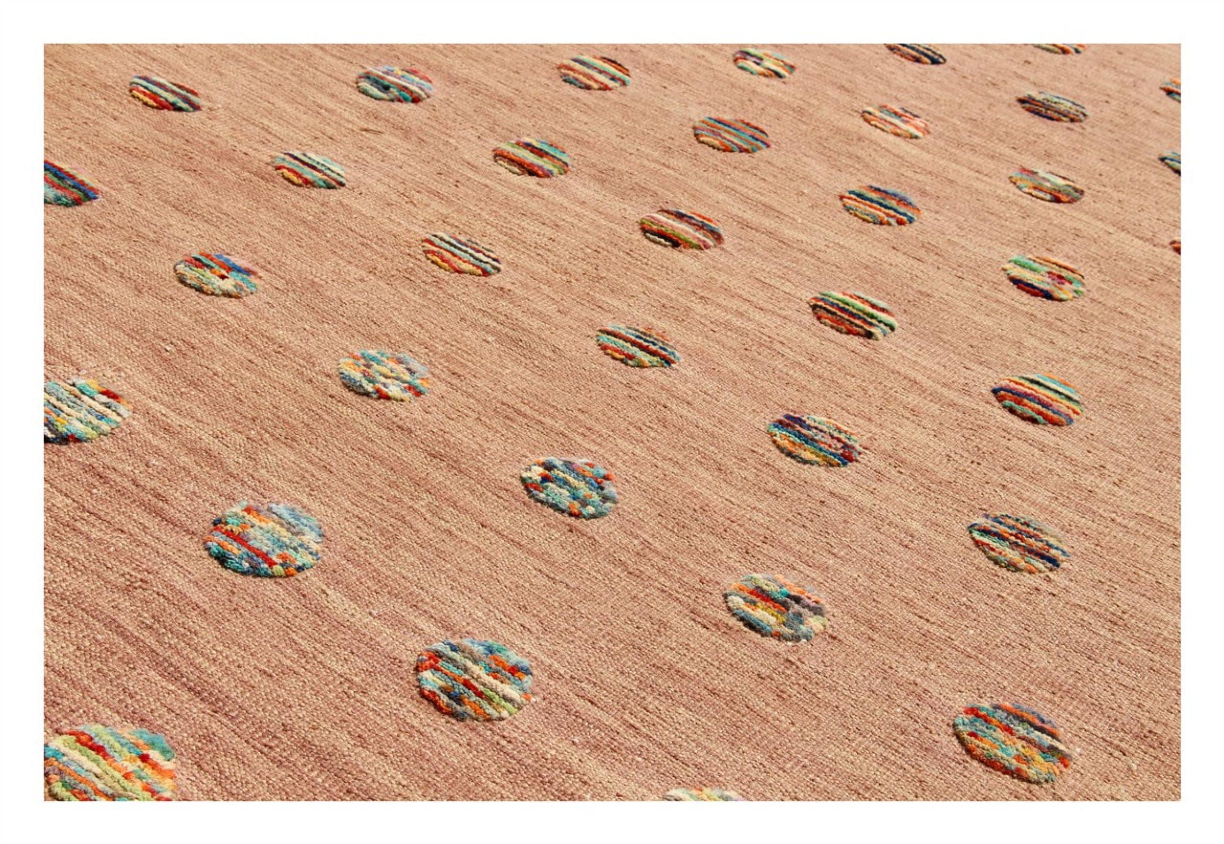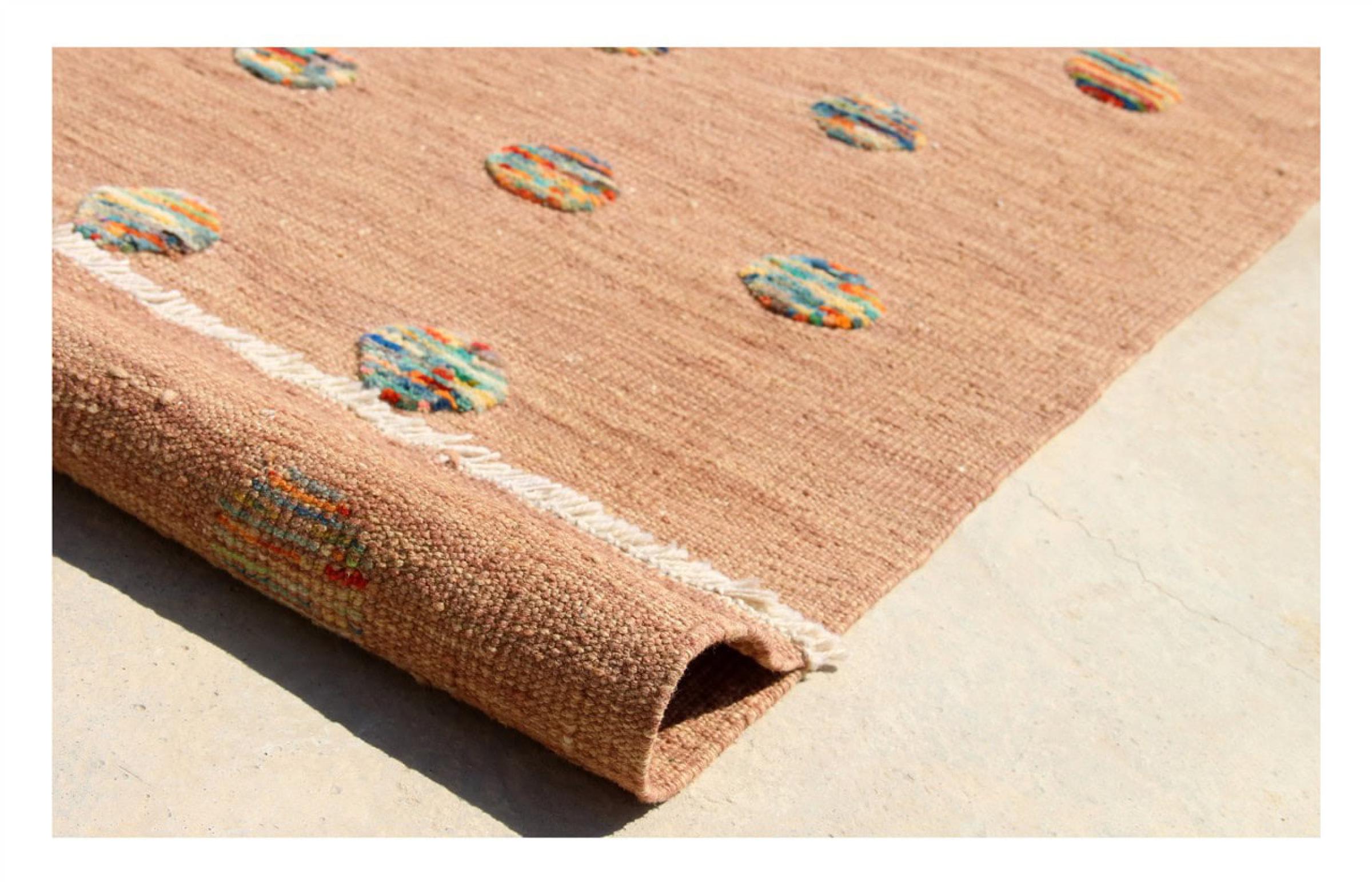 Esta alfombra fue hecha a mano en un telar como un tejido plano. Tejido plano es el término utilizado para describir las alfombras que no tienen pelo. Como el nombre promete, estas alfombras están tejidas y no anudadas. Esto resulta en una alfombra plana con una superficie estructurada. Los tejidos planos no son tan suaves y normalmente más delgados que las alfombras anudadas. Al mismo tiempo, su fabricación es mucho menos compleja y por lo general se pueden disponer por ambos lados (frontal y posterior). Sus patrones suelen ser geométricos, lo cual está determinado por el tejido.