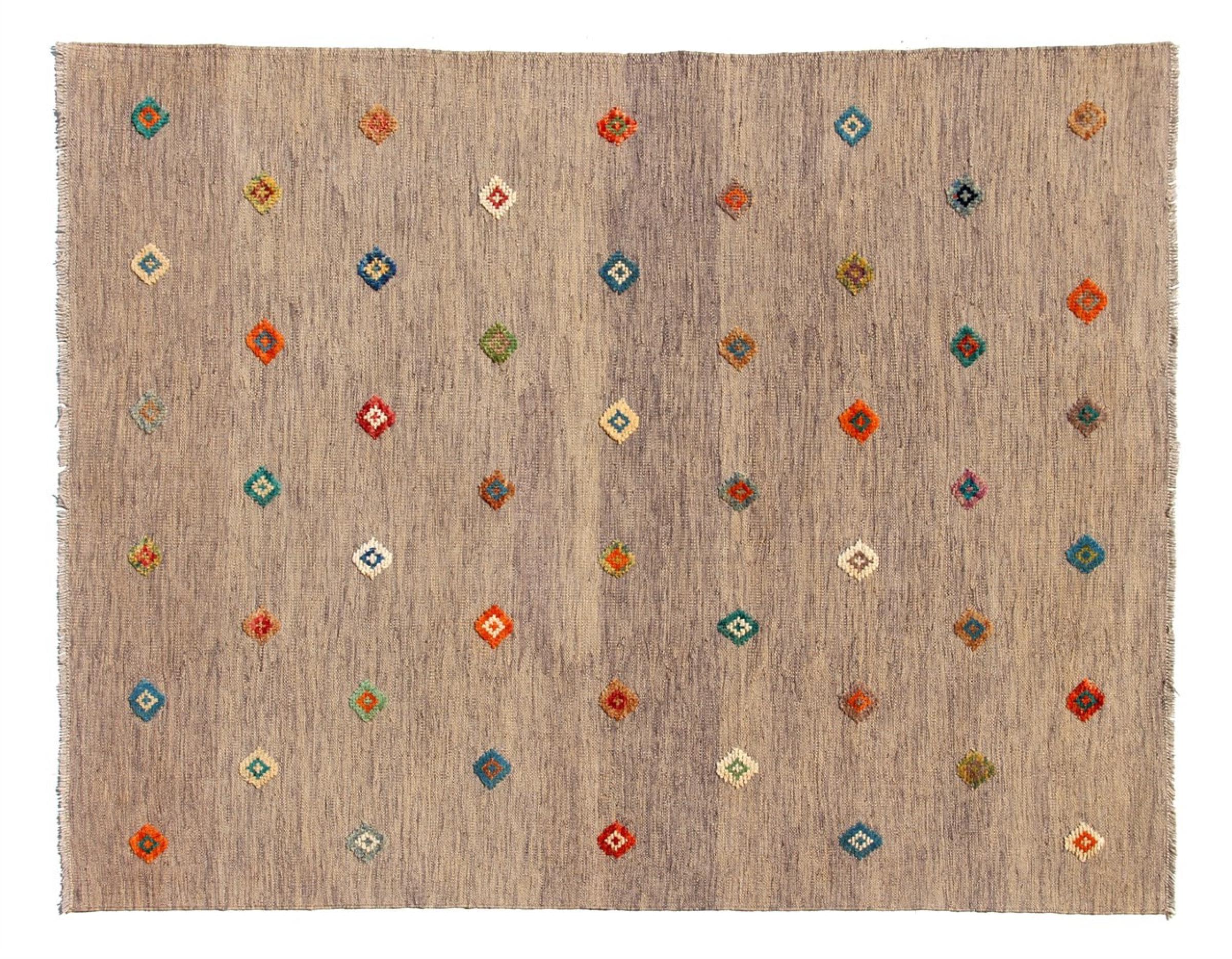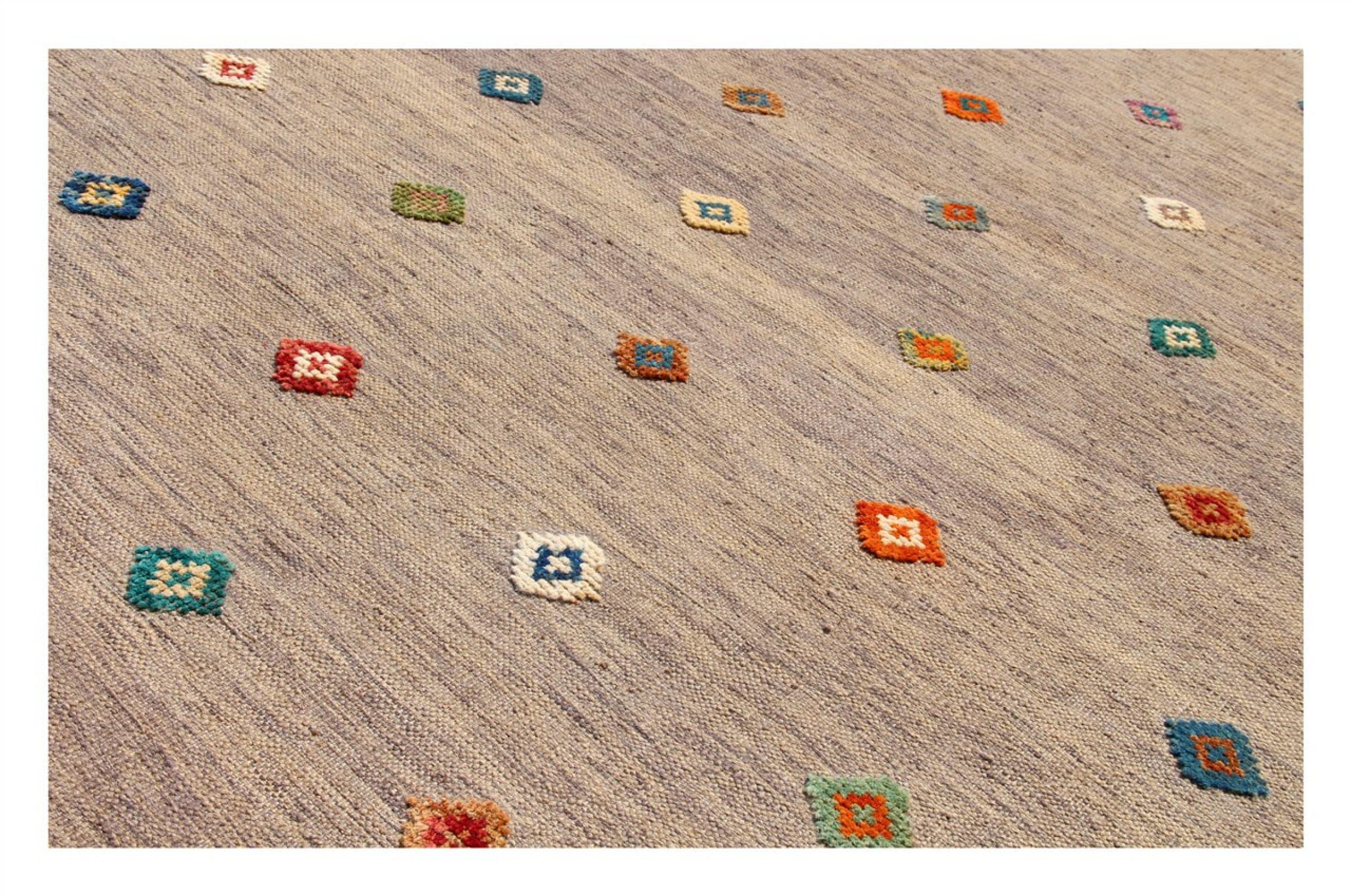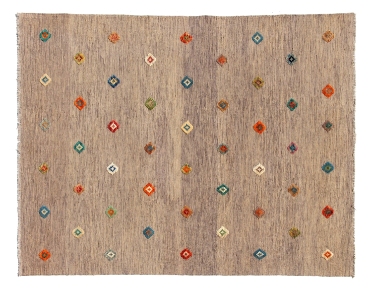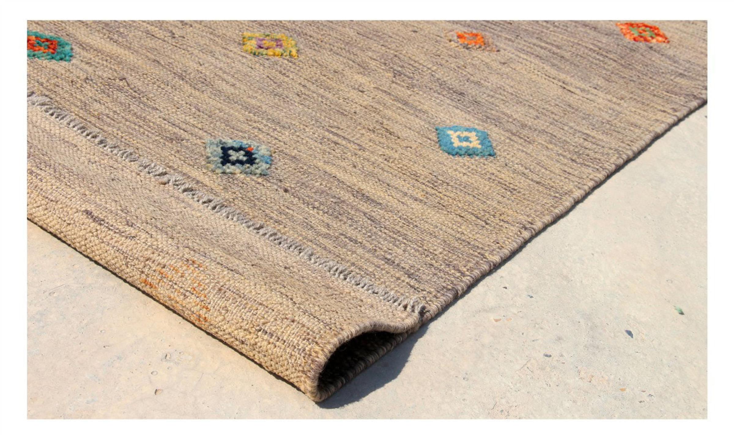 Esta alfombra fue hecha a mano en un telar como un tejido plano. Tejido plano es el término utilizado para describir las alfombras que no tienen pelo. Como el nombre promete, estas alfombras están tejidas y no anudadas. Esto resulta en una alfombra plana con una superficie estructurada. Los tejidos planos no son tan suaves y normalmente más delgados que las alfombras anudadas. Al mismo tiempo, su fabricación es mucho menos compleja y por lo general se pueden disponer por ambos lados (frontal y posterior). Sus patrones suelen ser geométricos, lo cual está determinado por el tejido.