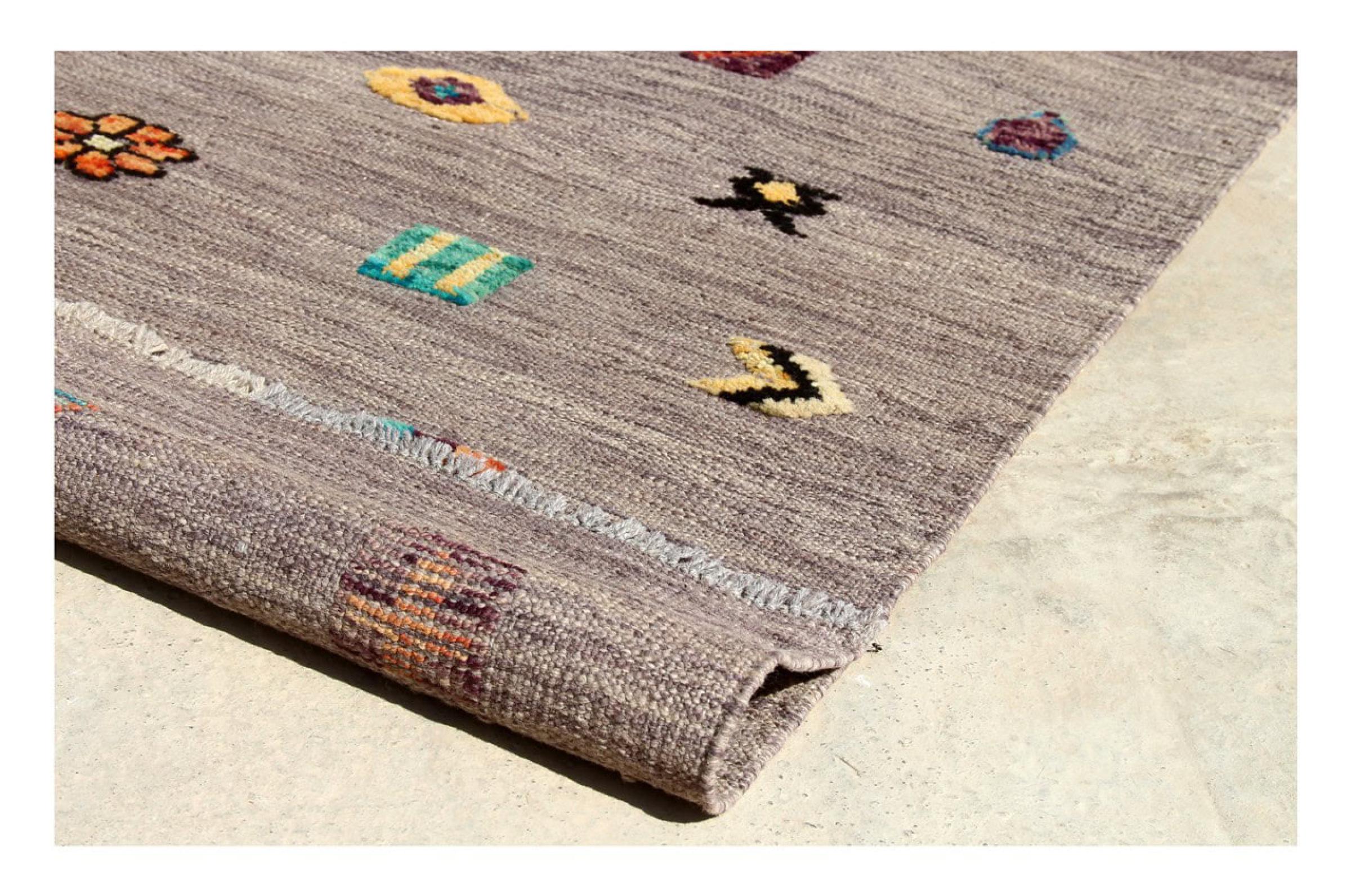 Esta alfombra fue hecha a mano en un telar como un tejido plano. Tejido plano es el término utilizado para describir las alfombras que no tienen pelo. Como el nombre promete, estas alfombras están tejidas y no anudadas. Esto resulta en una alfombra plana con una superficie estructurada. Los tejidos planos no son tan suaves y normalmente más delgados que las alfombras anudadas. Al mismo tiempo, su fabricación es mucho menos compleja y por lo general se pueden disponer por ambos lados (frontal y posterior). Sus patrones suelen ser geométricos, lo cual está determinado por el tejido.