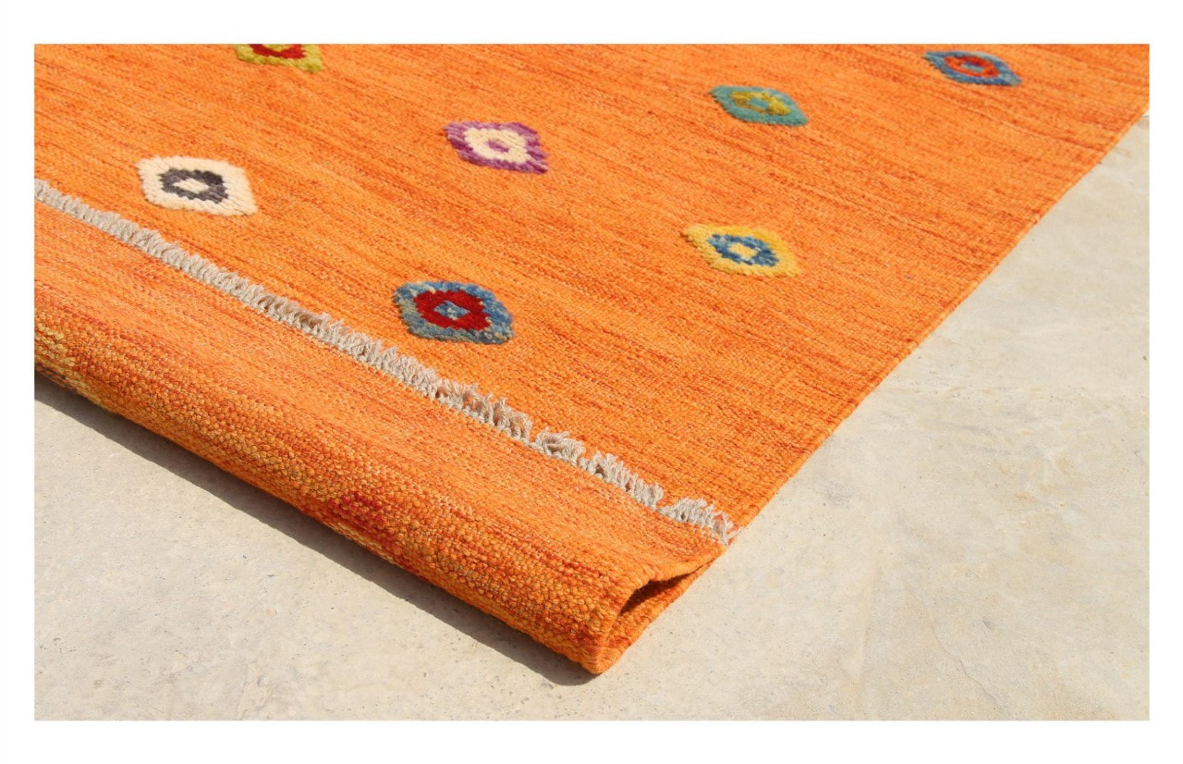 Esta alfombra fue hecha a mano en un telar como un tejido plano. Tejido plano es el término utilizado para describir las alfombras que no tienen pelo. Como el nombre promete, estas alfombras están tejidas y no anudadas. Esto resulta en una alfombra plana con una superficie estructurada. Los tejidos planos no son tan suaves y normalmente más delgados que las alfombras anudadas. Al mismo tiempo, su fabricación es mucho menos compleja y por lo general se pueden disponer por ambos lados (frontal y posterior). Sus patrones suelen ser geométricos, lo cual está determinado por el tejido.