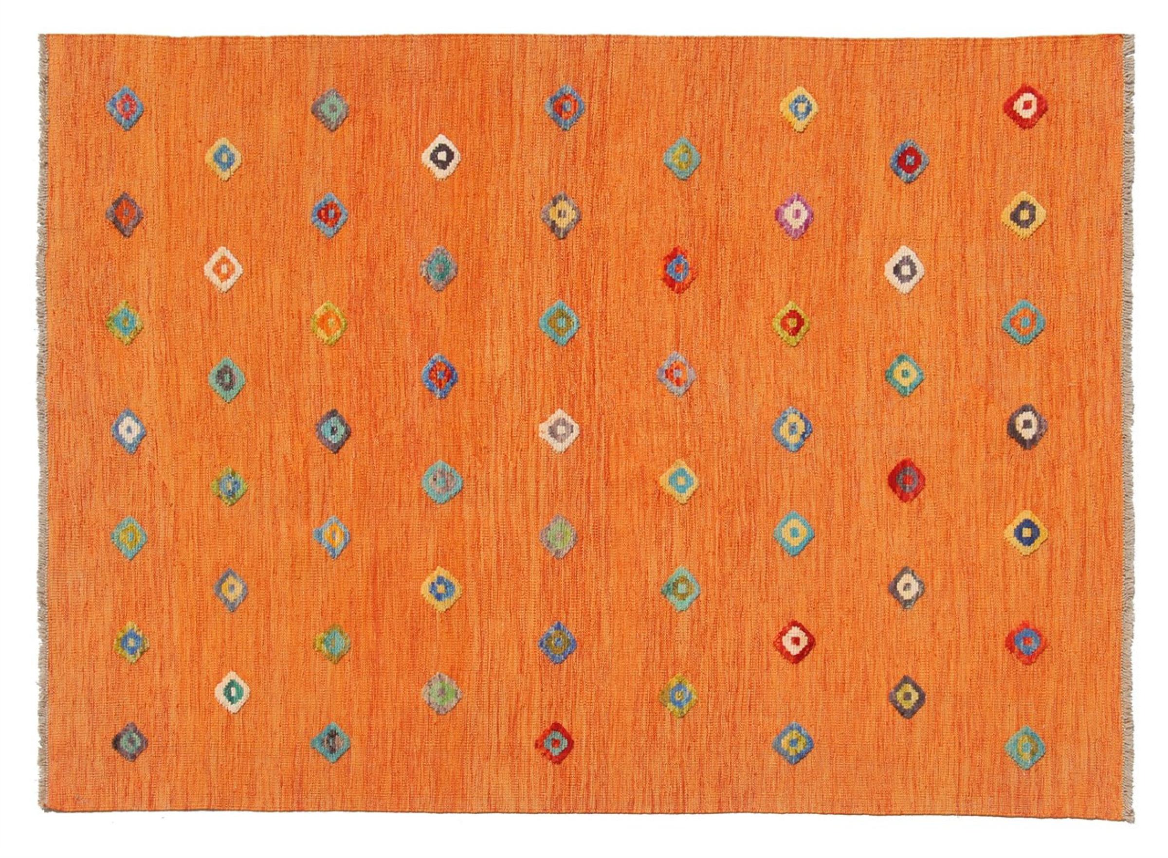 Estas alfombras kilim muestran una diferencia decisiva con las alfombras anudadas a mano - son tejidas a mano. Por lo tanto, no tienen un montón alto de lana y son a menudo más planos y más ásperos que las alfombras de lana anudada. Su fabricación es menos elaborada y por eso suelen ser mucho más baratas. Como ventaja, las alfombras de kilim son también mucho más ligeras y pueden ser colocadas por delante y por detrás. Los kilims tejidos a mano provienen originalmente de la antigua Persia y ahora también se fabrican a menudo en el Afganistán. Tienen patrones bastante simples y directos, que se deben a su técnica de tejido.