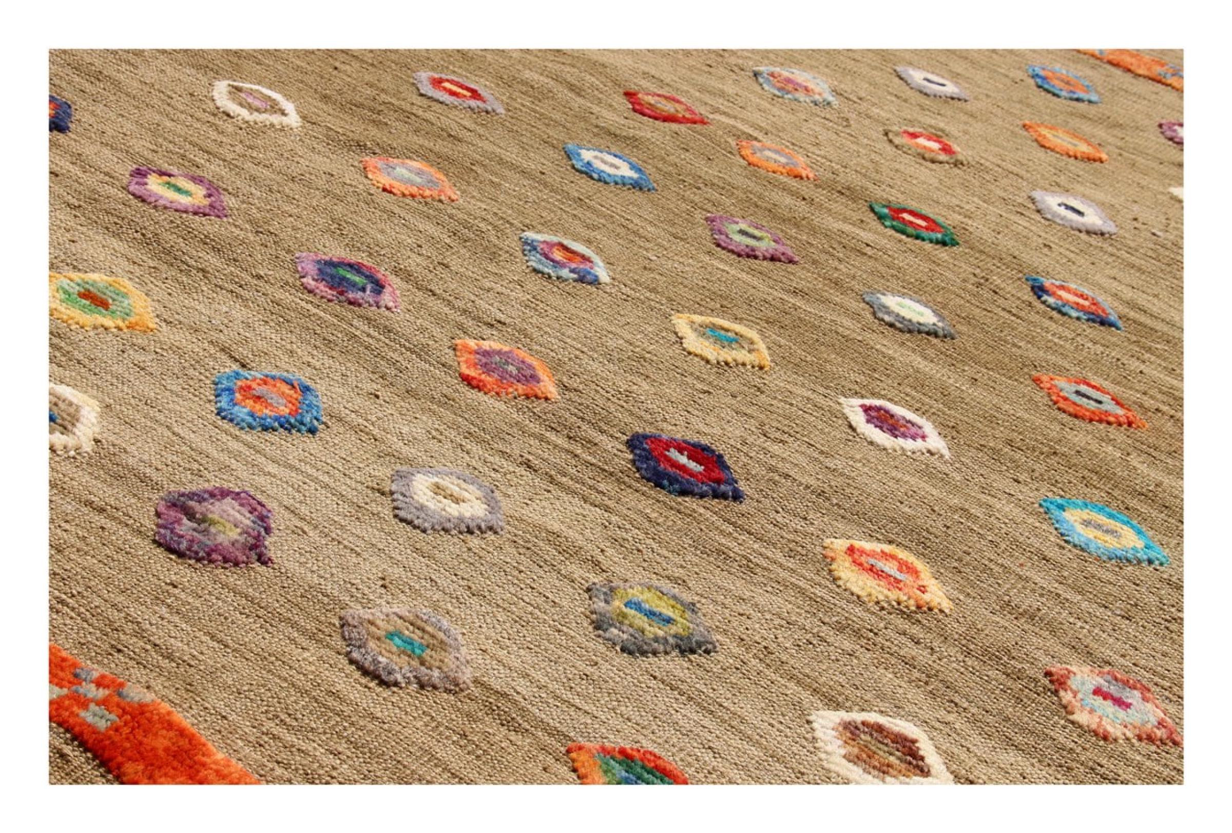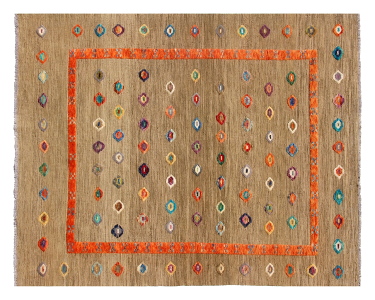 Esta alfombra fue hecha a mano en un telar como un tejido plano. Tejido plano es el término utilizado para describir las alfombras que no tienen pelo. Como el nombre promete, estas alfombras están tejidas y no anudadas. Esto resulta en una alfombra plana con una superficie estructurada. Los tejidos planos no son tan suaves y normalmente más delgados que las alfombras anudadas. Al mismo tiempo, su fabricación es mucho menos compleja y por lo general se pueden disponer por ambos lados (frontal y posterior). Sus patrones suelen ser geométricos, lo cual está determinado por el tejido.