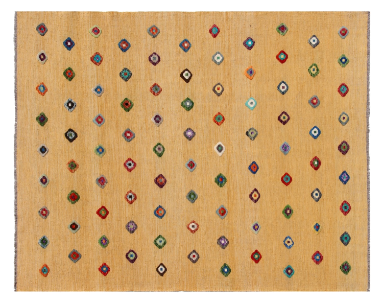 Esta alfombra fue hecha a mano en un telar como un tejido plano. Tejido plano es el término utilizado para describir las alfombras que no tienen pelo. Como el nombre promete, estas alfombras están tejidas y no anudadas. Esto resulta en una alfombra plana con una superficie estructurada. Los tejidos planos no son tan suaves y normalmente más delgados que las alfombras anudadas. Al mismo tiempo, su fabricación es mucho menos compleja y por lo general se pueden disponer por ambos lados (frontal y posterior). Sus patrones suelen ser geométricos, lo cual está determinado por el tejido.