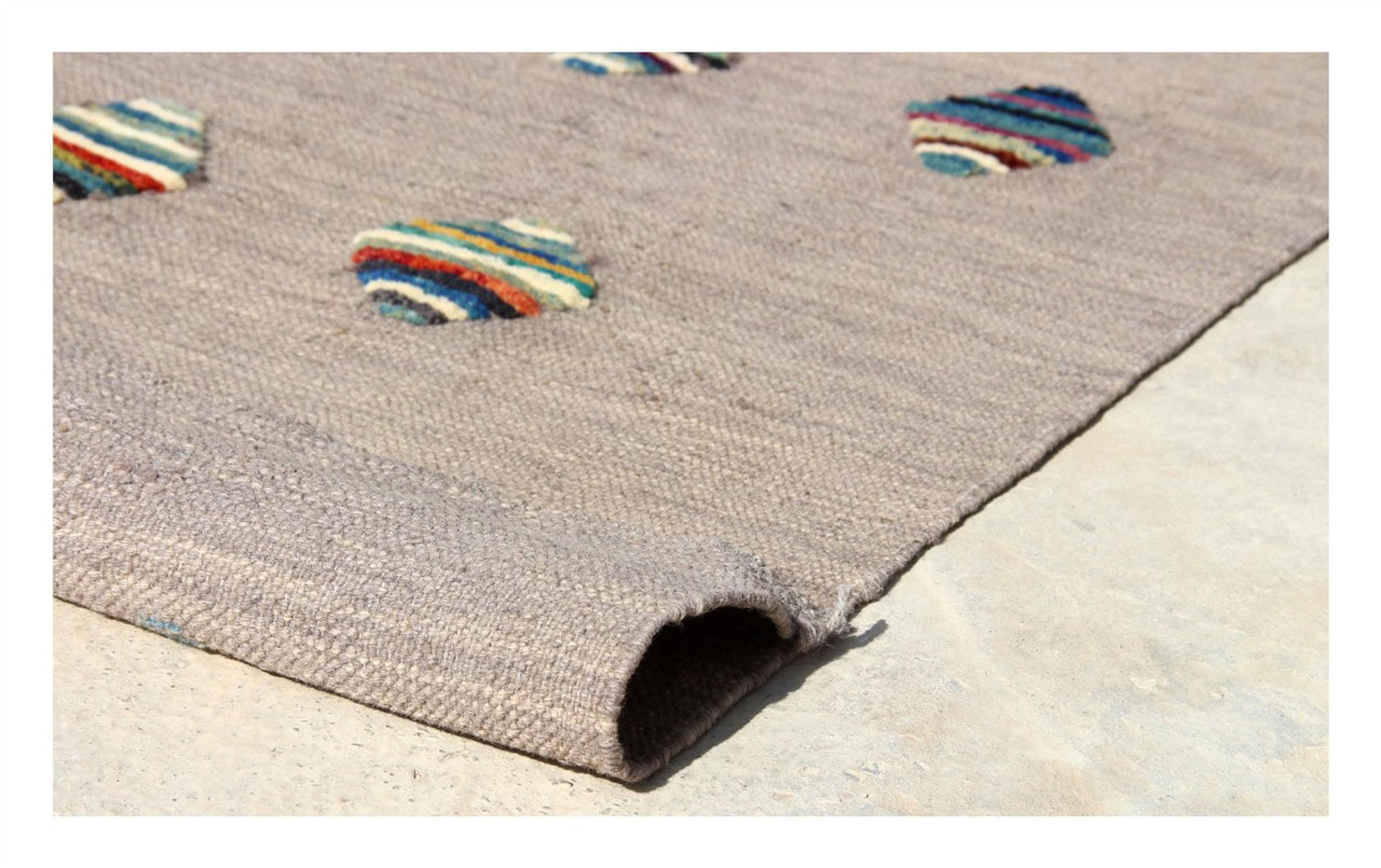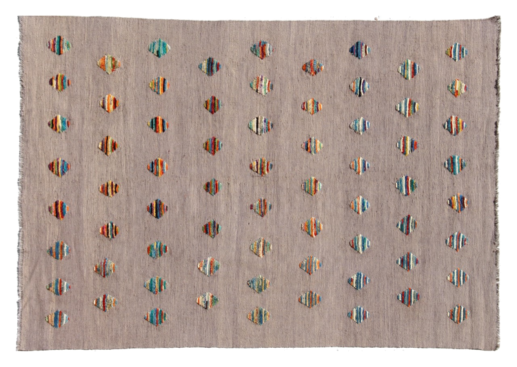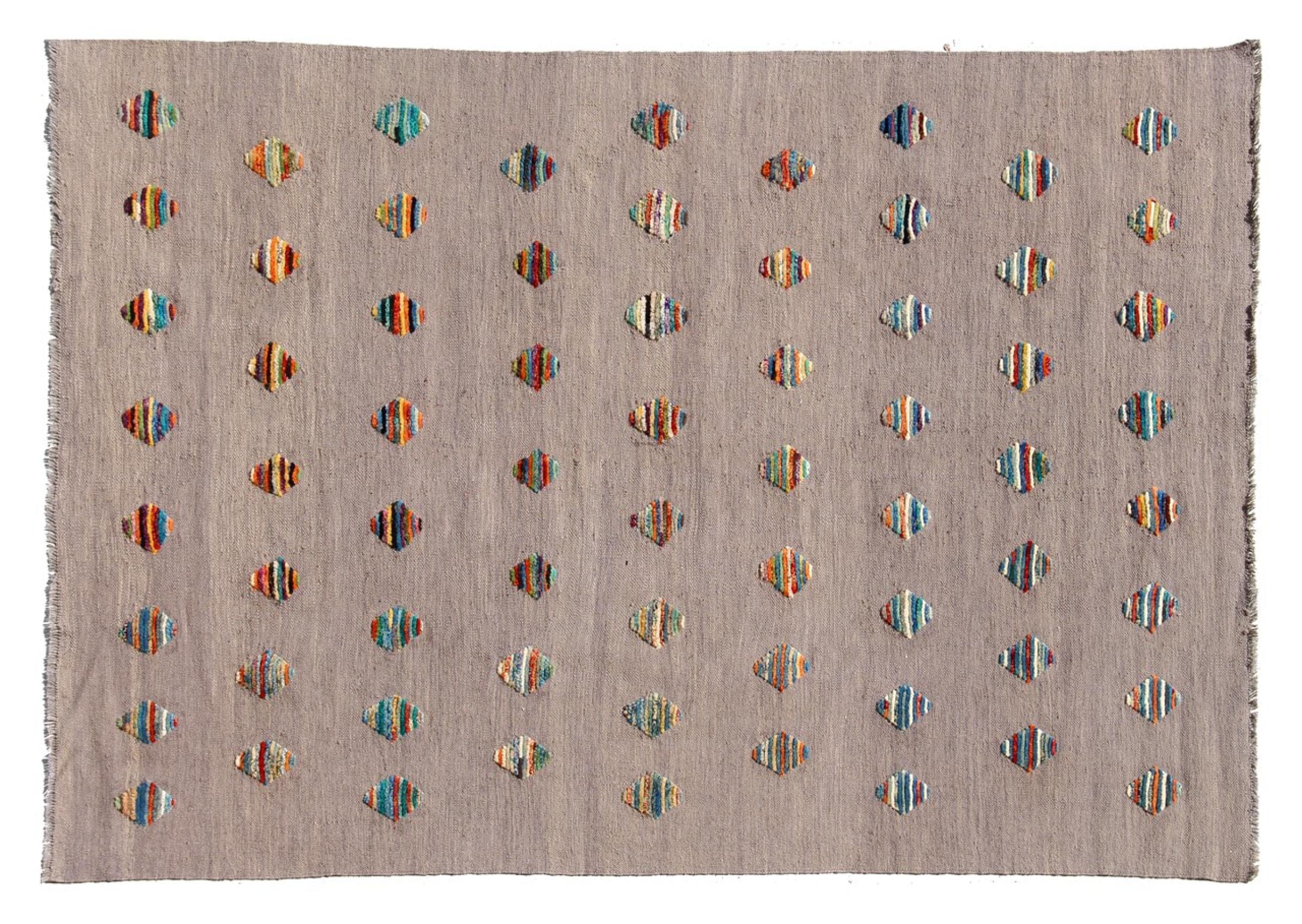 Esta alfombra fue hecha a mano en un telar como un tejido plano. Tejido plano es el término utilizado para describir las alfombras que no tienen pelo. Como el nombre promete, estas alfombras están tejidas y no anudadas. Esto resulta en una alfombra plana con una superficie estructurada. Los tejidos planos no son tan suaves y normalmente más delgados que las alfombras anudadas. Al mismo tiempo, su fabricación es mucho menos compleja y por lo general se pueden disponer por ambos lados (frontal y posterior). Sus patrones suelen ser geométricos, lo cual está determinado por el tejido.