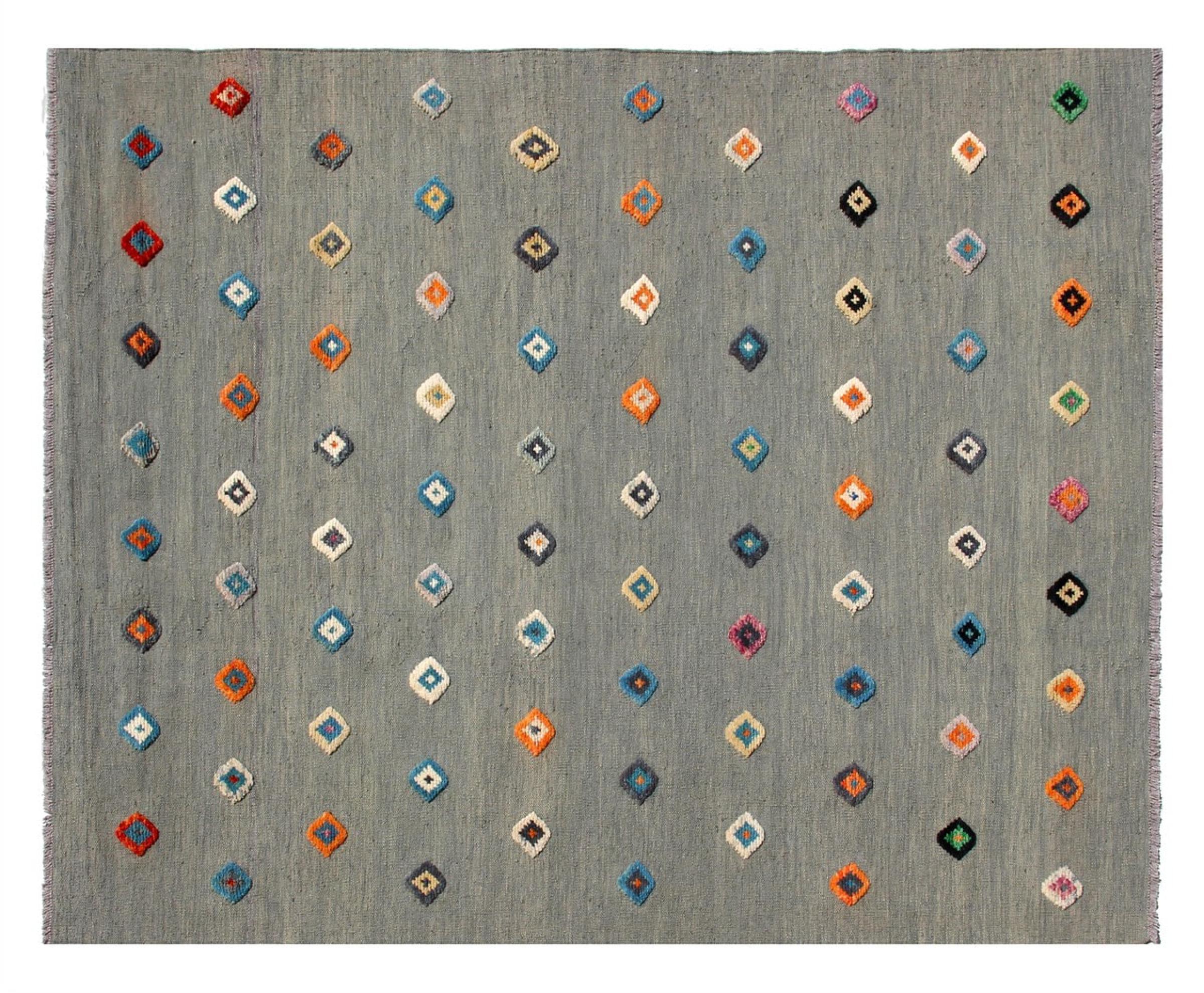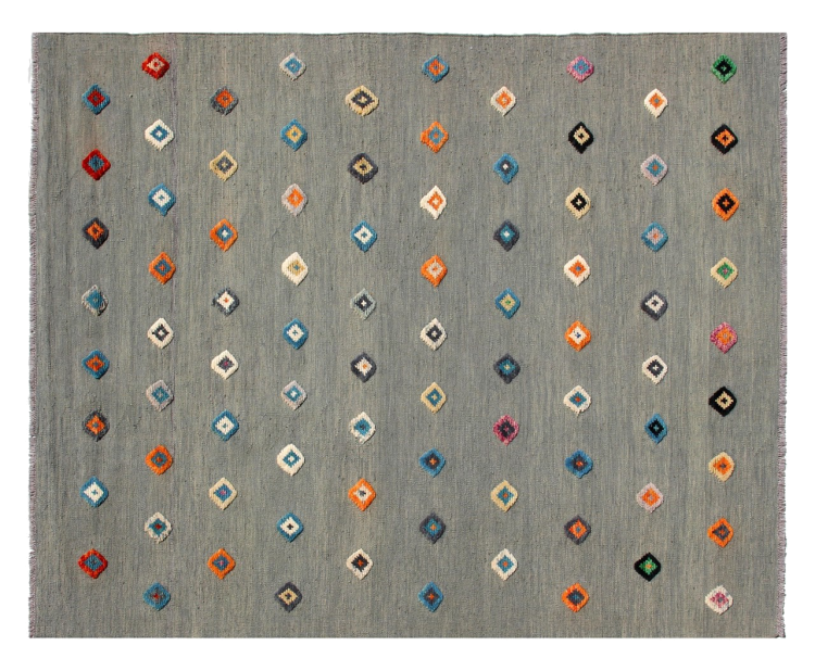 Esta alfombra fue hecha a mano en un telar como un tejido plano. Tejido plano es el término utilizado para describir las alfombras que no tienen pelo. Como el nombre promete, estas alfombras están tejidas y no anudadas. Esto resulta en una alfombra plana con una superficie estructurada. Los tejidos planos no son tan suaves y normalmente más delgados que las alfombras anudadas. Al mismo tiempo, su fabricación es mucho menos compleja y por lo general se pueden disponer por ambos lados (frontal y posterior). Sus patrones suelen ser geométricos, lo cual está determinado por el tejido.