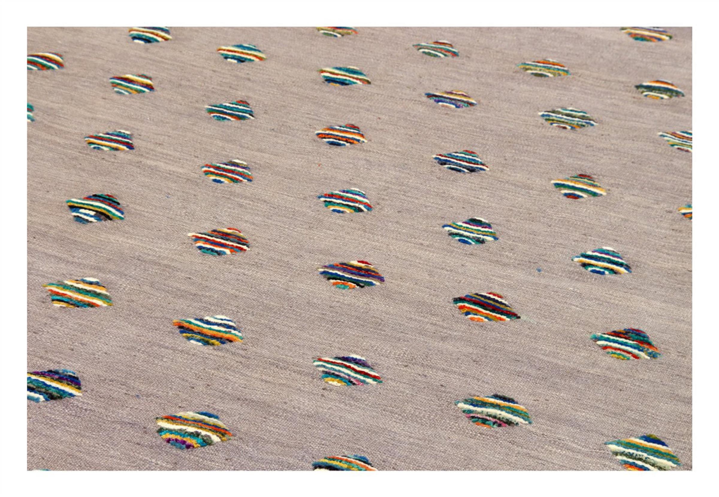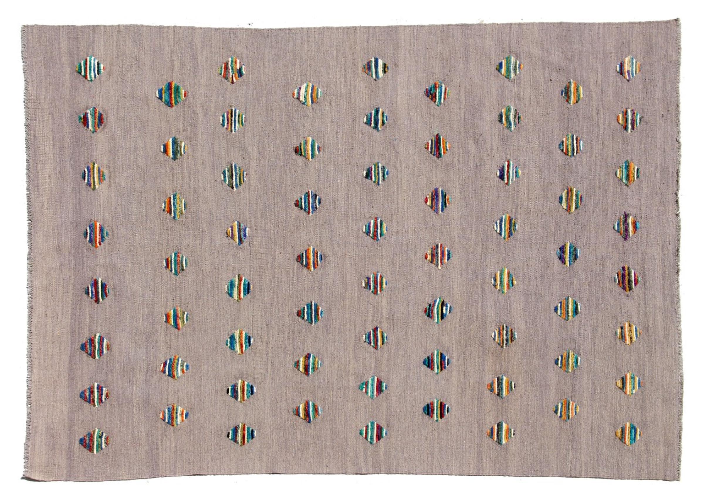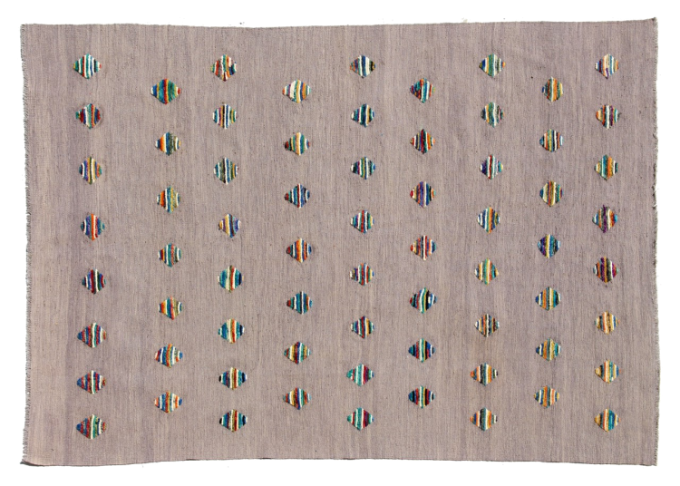 Esta alfombra fue hecha a mano en un telar como un tejido plano. Tejido plano es el término utilizado para describir las alfombras que no tienen pelo. Como el nombre promete, estas alfombras están tejidas y no anudadas. Esto resulta en una alfombra plana con una superficie estructurada. Los tejidos planos no son tan suaves y normalmente más delgados que las alfombras anudadas. Al mismo tiempo, su fabricación es mucho menos compleja y por lo general se pueden disponer por ambos lados (frontal y posterior). Sus patrones suelen ser geométricos, lo cual está determinado por el tejido.