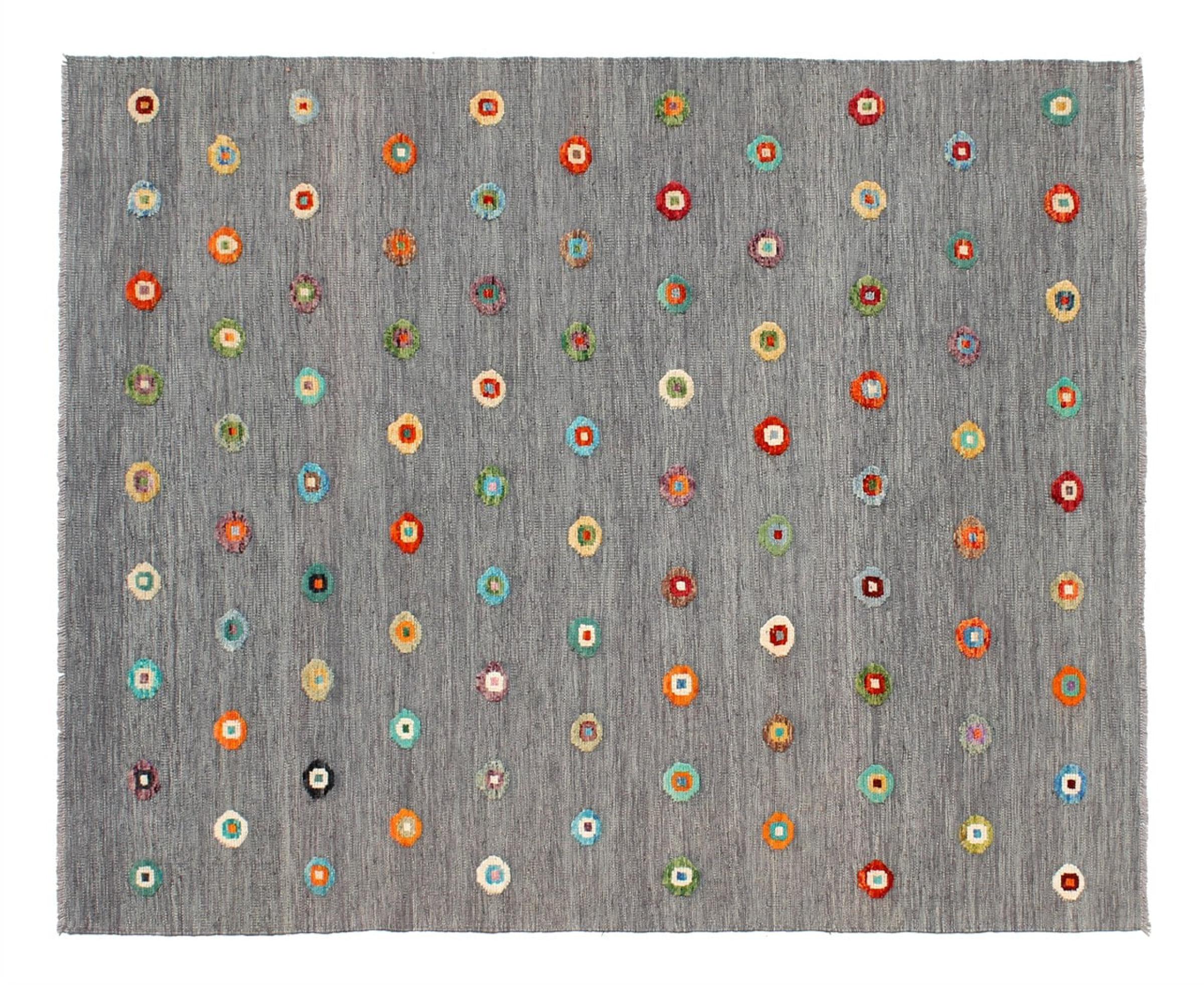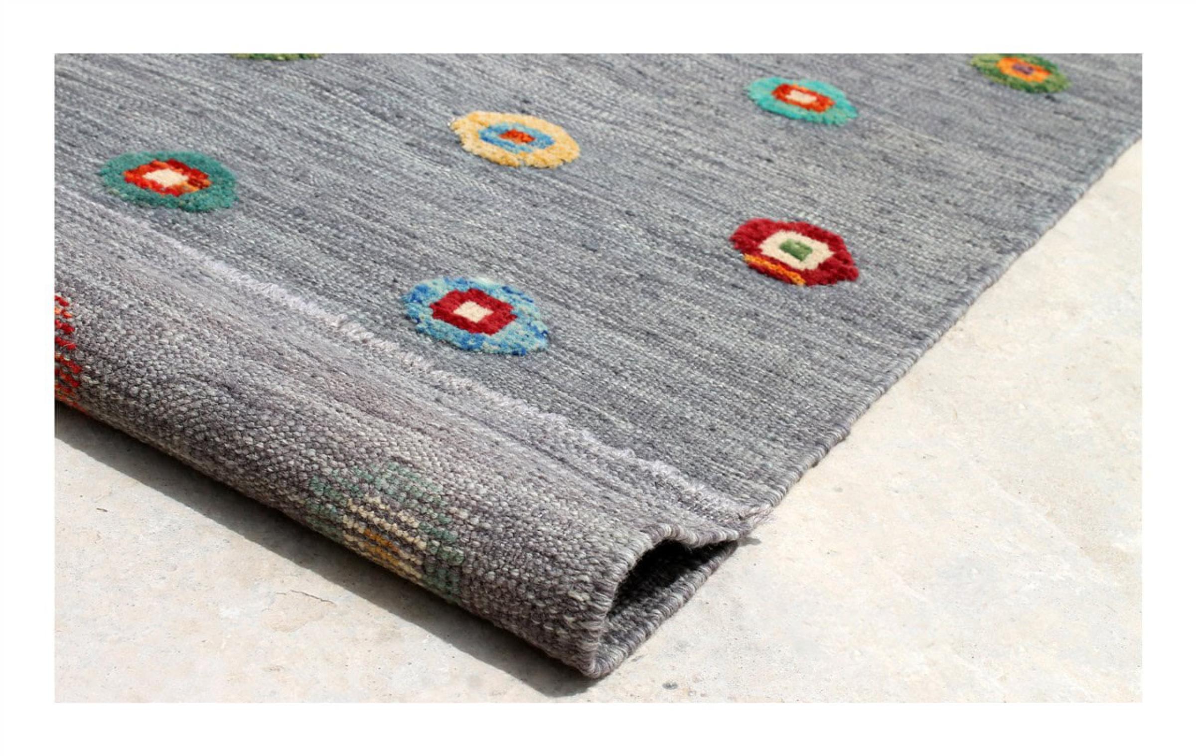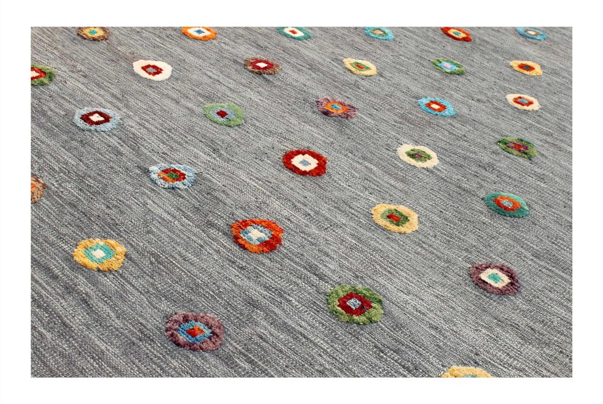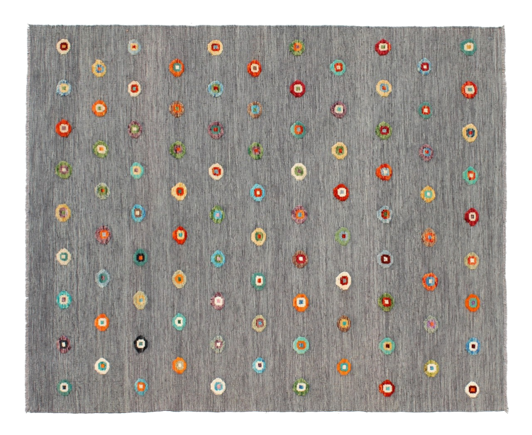 Esta alfombra fue hecha a mano en un telar como un tejido plano. Tejido plano es el término utilizado para describir las alfombras que no tienen pelo. Como el nombre promete, estas alfombras están tejidas y no anudadas. Esto resulta en una alfombra plana con una superficie estructurada. Los tejidos planos no son tan suaves y normalmente más delgados que las alfombras anudadas. Al mismo tiempo, su fabricación es mucho menos compleja y por lo general se pueden disponer por ambos lados (frontal y posterior). Sus patrones suelen ser geométricos, lo cual está determinado por el tejido.