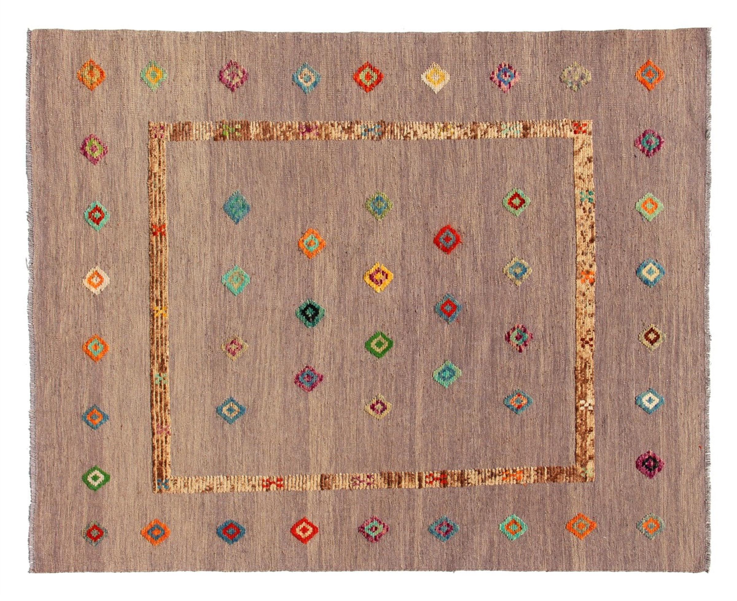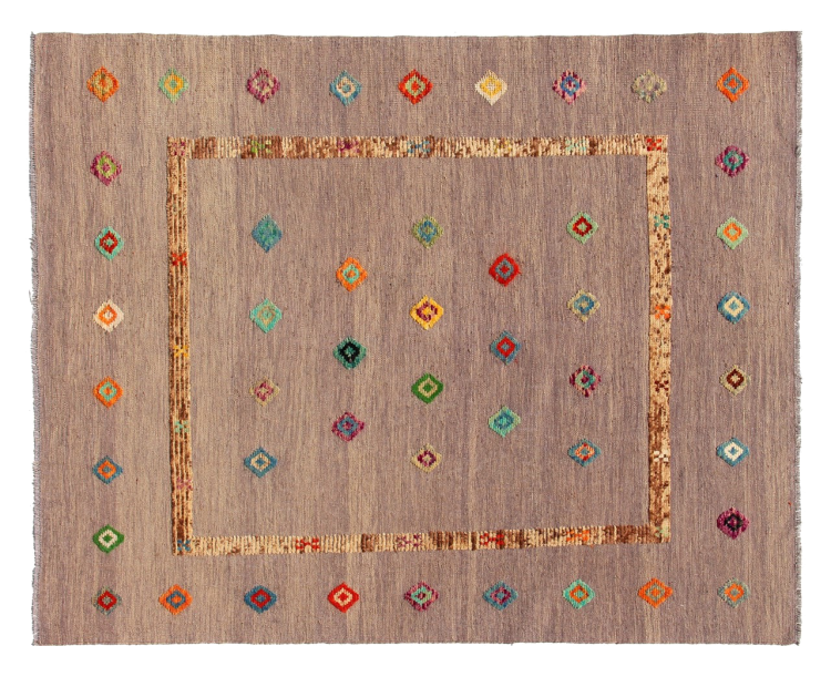 Esta alfombra fue hecha a mano en un telar como un tejido plano. Tejido plano es el término utilizado para describir las alfombras que no tienen pelo. Como el nombre promete, estas alfombras están tejidas y no anudadas. Esto resulta en una alfombra plana con una superficie estructurada. Los tejidos planos no son tan suaves y normalmente más delgados que las alfombras anudadas. Al mismo tiempo, su fabricación es mucho menos compleja y por lo general se pueden disponer por ambos lados (frontal y posterior). Sus patrones suelen ser geométricos, lo cual está determinado por el tejido.