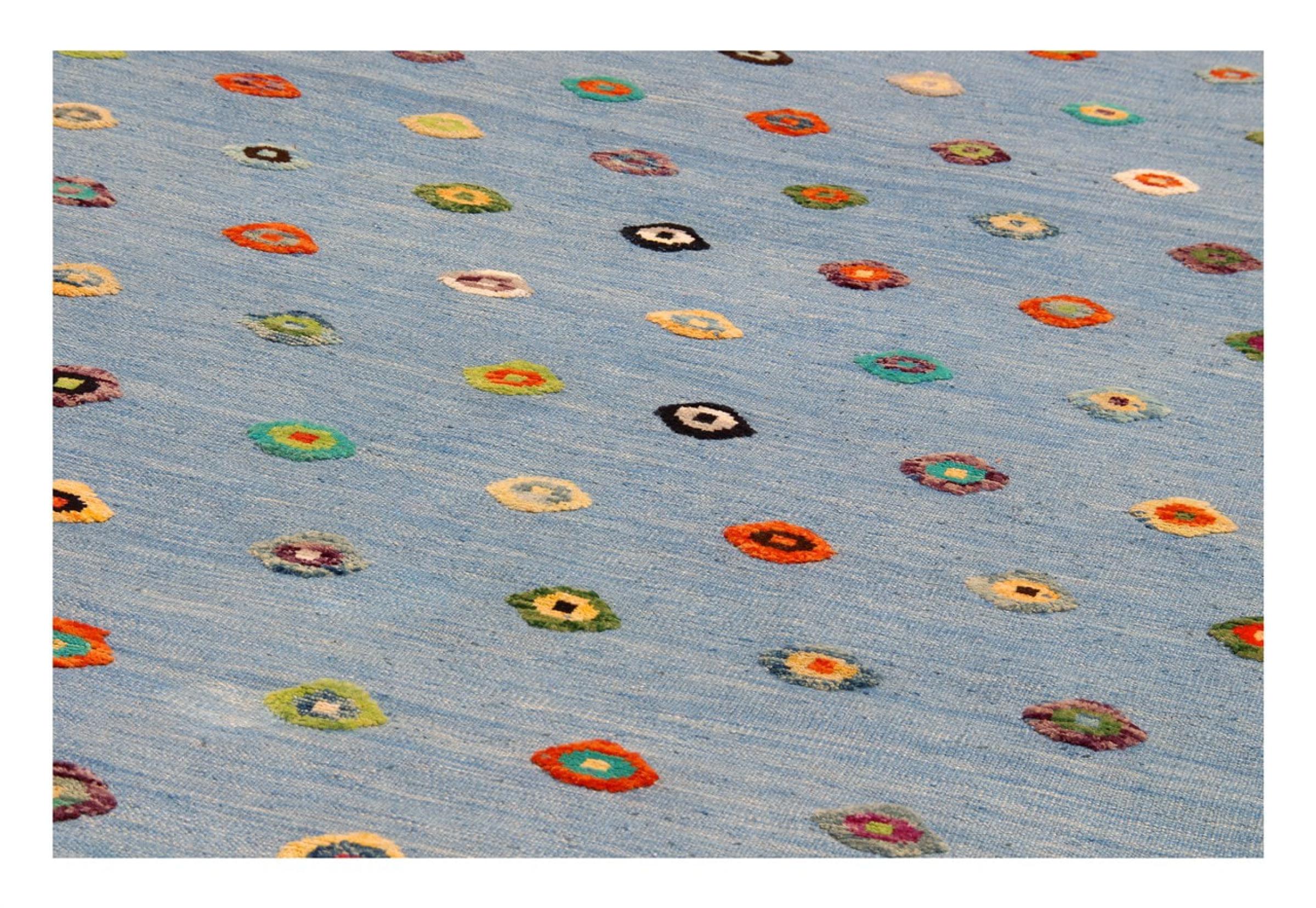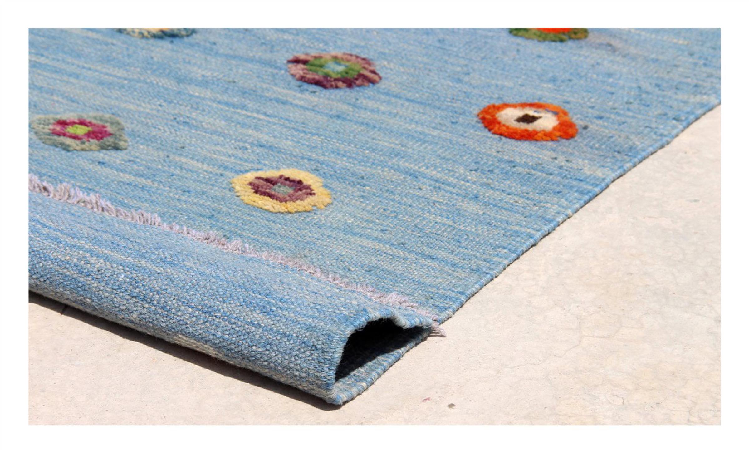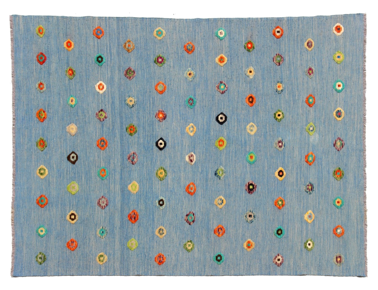 Esta alfombra fue hecha a mano en un telar como un tejido plano. Tejido plano es el término utilizado para describir las alfombras que no tienen pelo. Como el nombre promete, estas alfombras están tejidas y no anudadas. Esto resulta en una alfombra plana con una superficie estructurada. Los tejidos planos no son tan suaves y normalmente más delgados que las alfombras anudadas. Al mismo tiempo, su fabricación es mucho menos compleja y por lo general se pueden disponer por ambos lados (frontal y posterior). Sus patrones suelen ser geométricos, lo cual está determinado por el tejido.