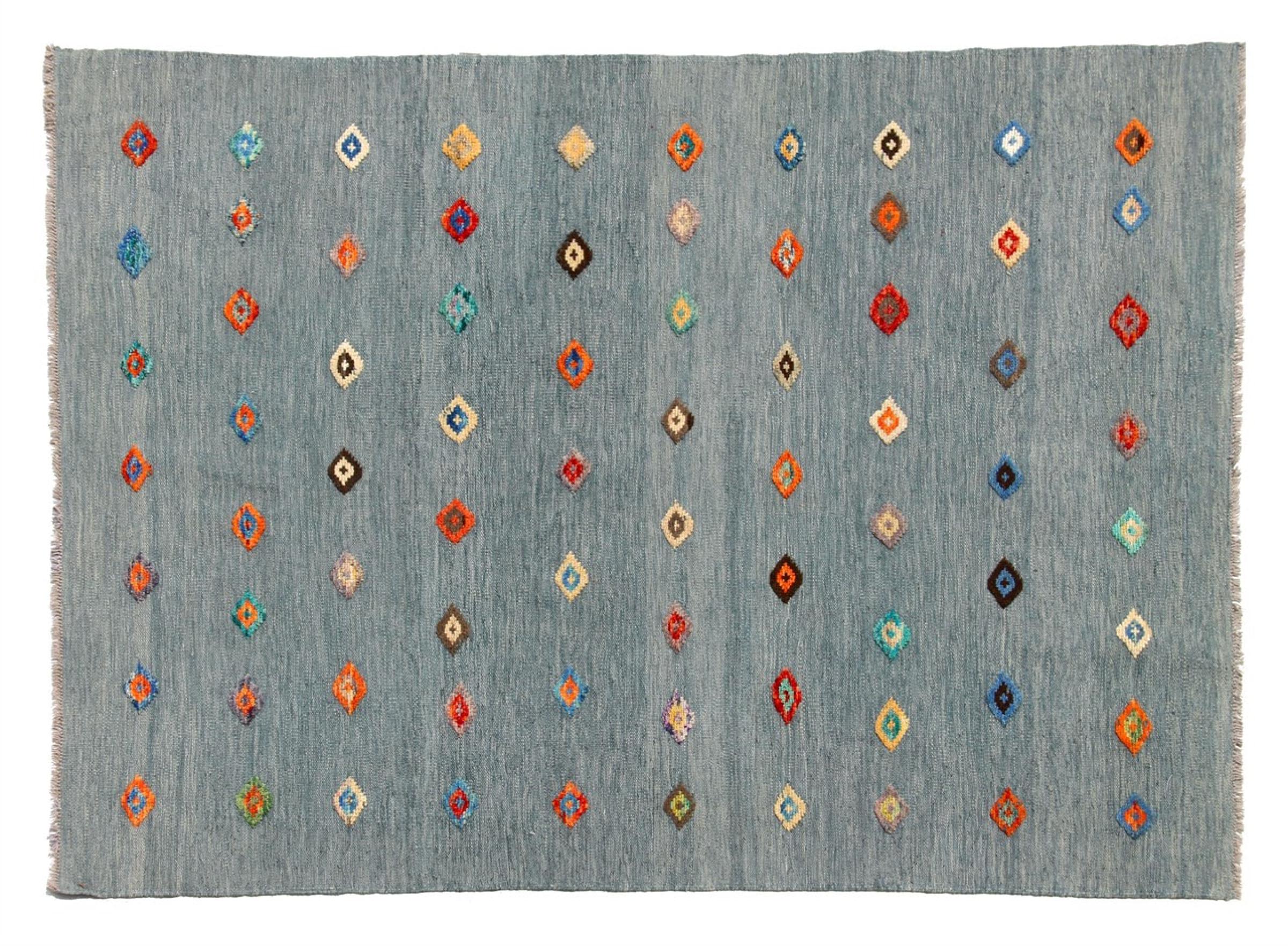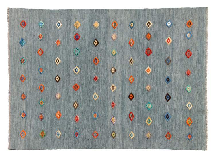 Esta alfombra fue hecha a mano en un telar como un tejido plano. Tejido plano es el término utilizado para describir las alfombras que no tienen pelo. Como el nombre promete, estas alfombras están tejidas y no anudadas. Esto resulta en una alfombra plana con una superficie estructurada. Los tejidos planos no son tan suaves y normalmente más delgados que las alfombras anudadas. Al mismo tiempo, su fabricación es mucho menos compleja y por lo general se pueden disponer por ambos lados (frontal y posterior). Sus patrones suelen ser geométricos, lo cual está determinado por el tejido.