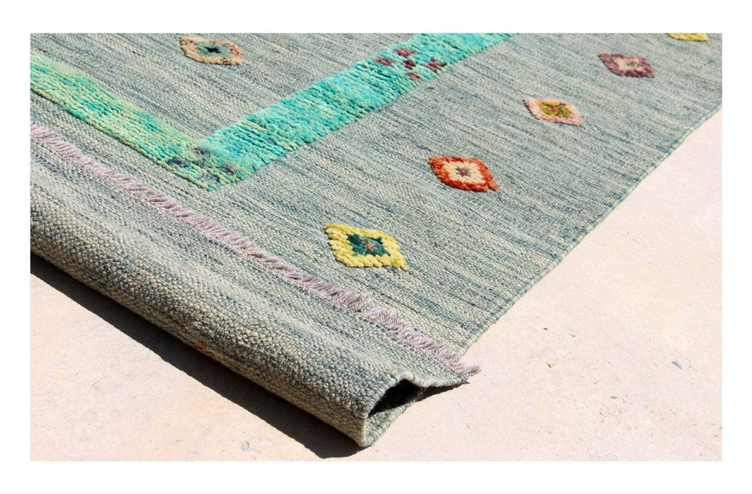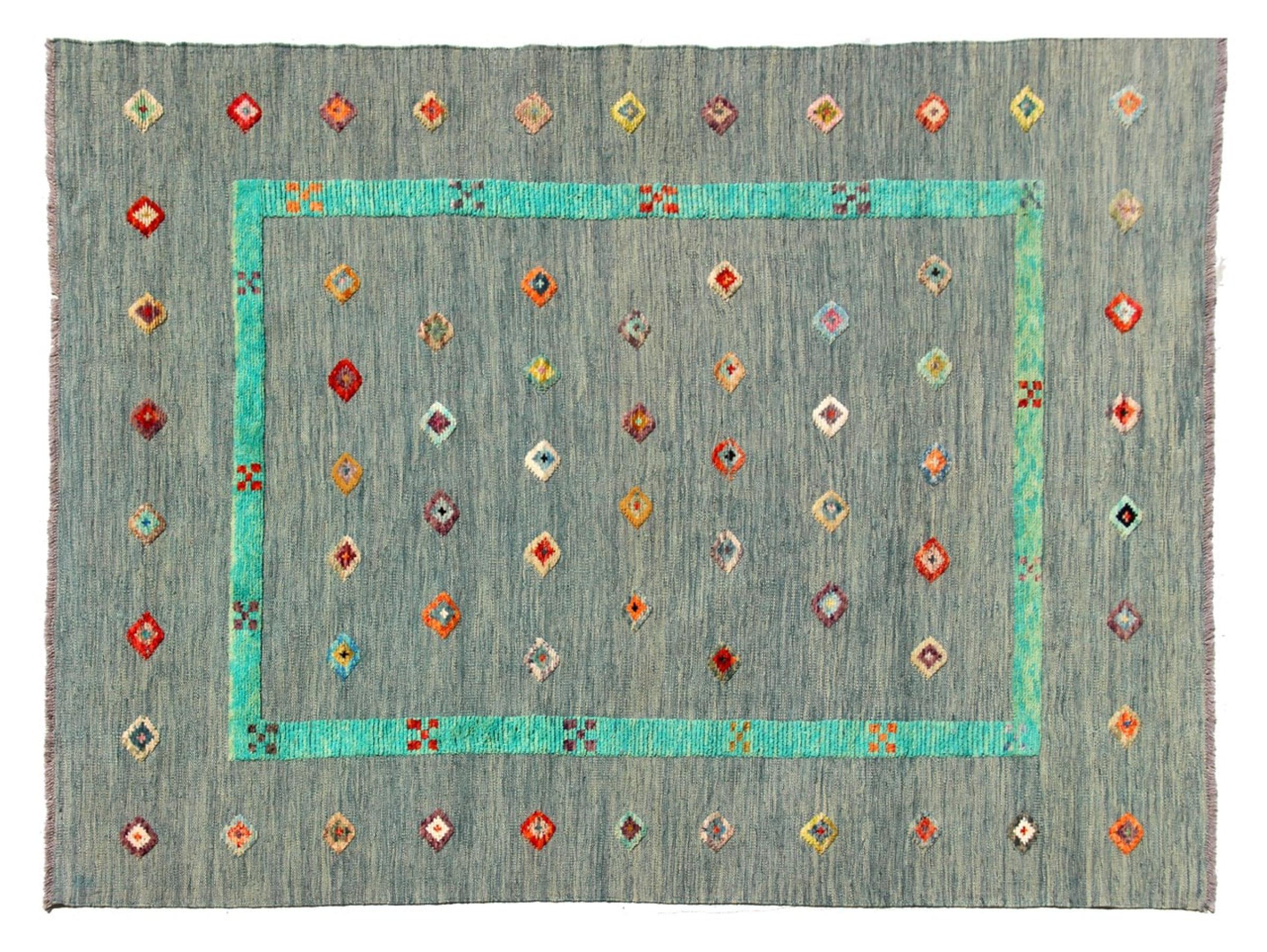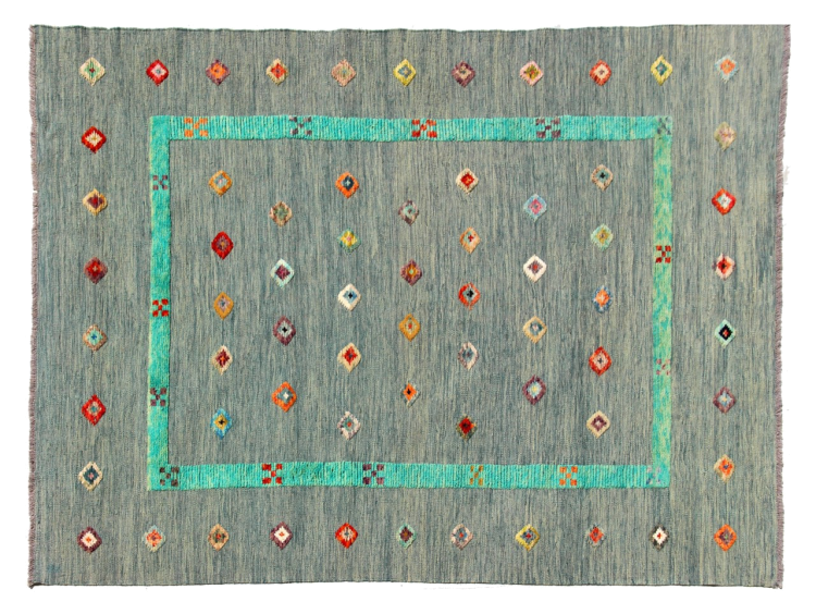 Esta alfombra fue hecha a mano en un telar como un tejido plano. Tejido plano es el término utilizado para describir las alfombras que no tienen pelo. Como el nombre promete, estas alfombras están tejidas y no anudadas. Esto resulta en una alfombra plana con una superficie estructurada. Los tejidos planos no son tan suaves y normalmente más delgados que las alfombras anudadas. Al mismo tiempo, su fabricación es mucho menos compleja y por lo general se pueden disponer por ambos lados (frontal y posterior). Sus patrones suelen ser geométricos, lo cual está determinado por el tejido.