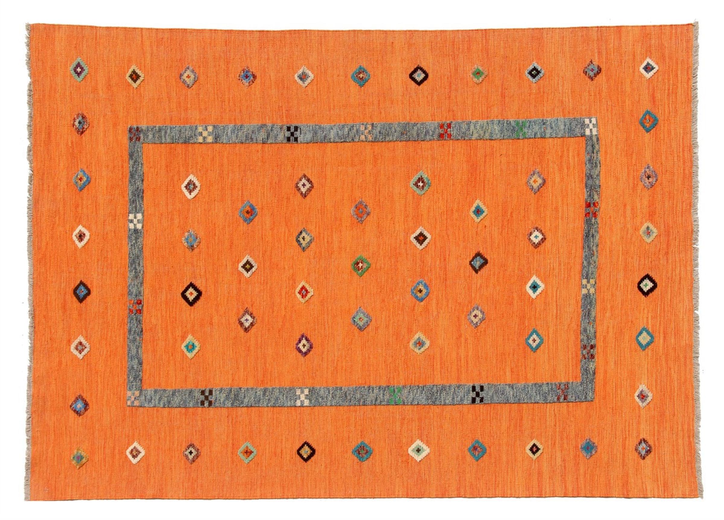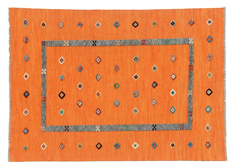 Esta alfombra fue hecha a mano en un telar como un tejido plano. Tejido plano es el término utilizado para describir las alfombras que no tienen pelo. Como el nombre promete, estas alfombras están tejidas y no anudadas. Esto resulta en una alfombra plana con una superficie estructurada. Los tejidos planos no son tan suaves y normalmente más delgados que las alfombras anudadas. Al mismo tiempo, su fabricación es mucho menos compleja y por lo general se pueden disponer por ambos lados (frontal y posterior). Sus patrones suelen ser geométricos, lo cual está determinado por el tejido.