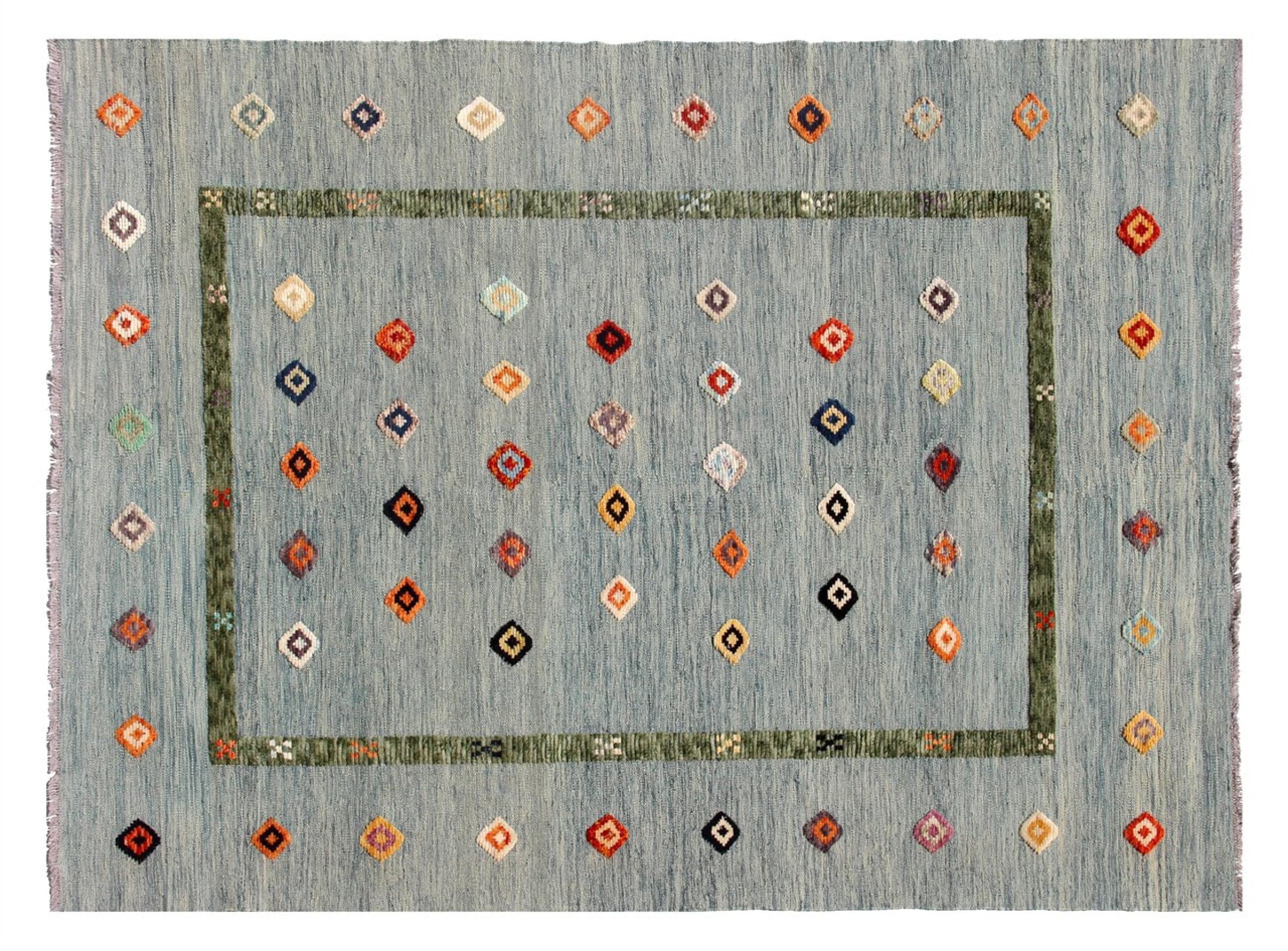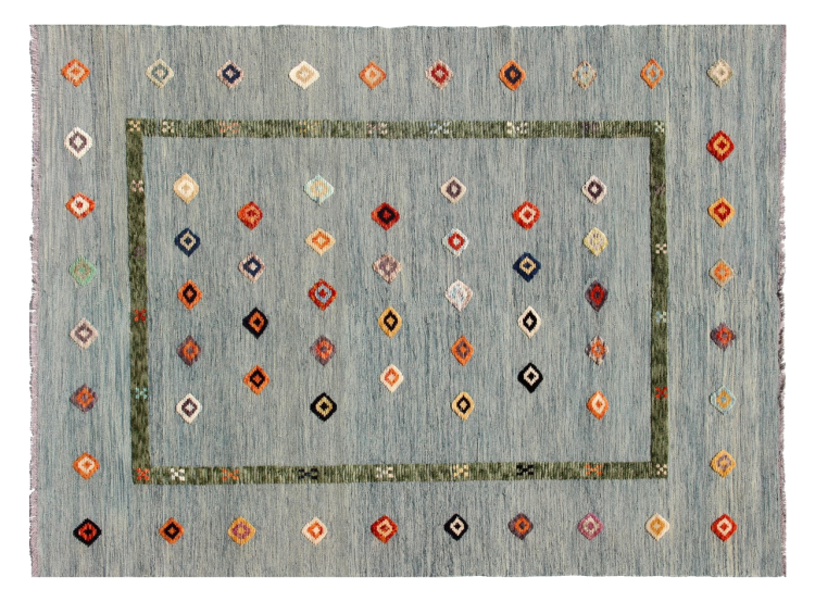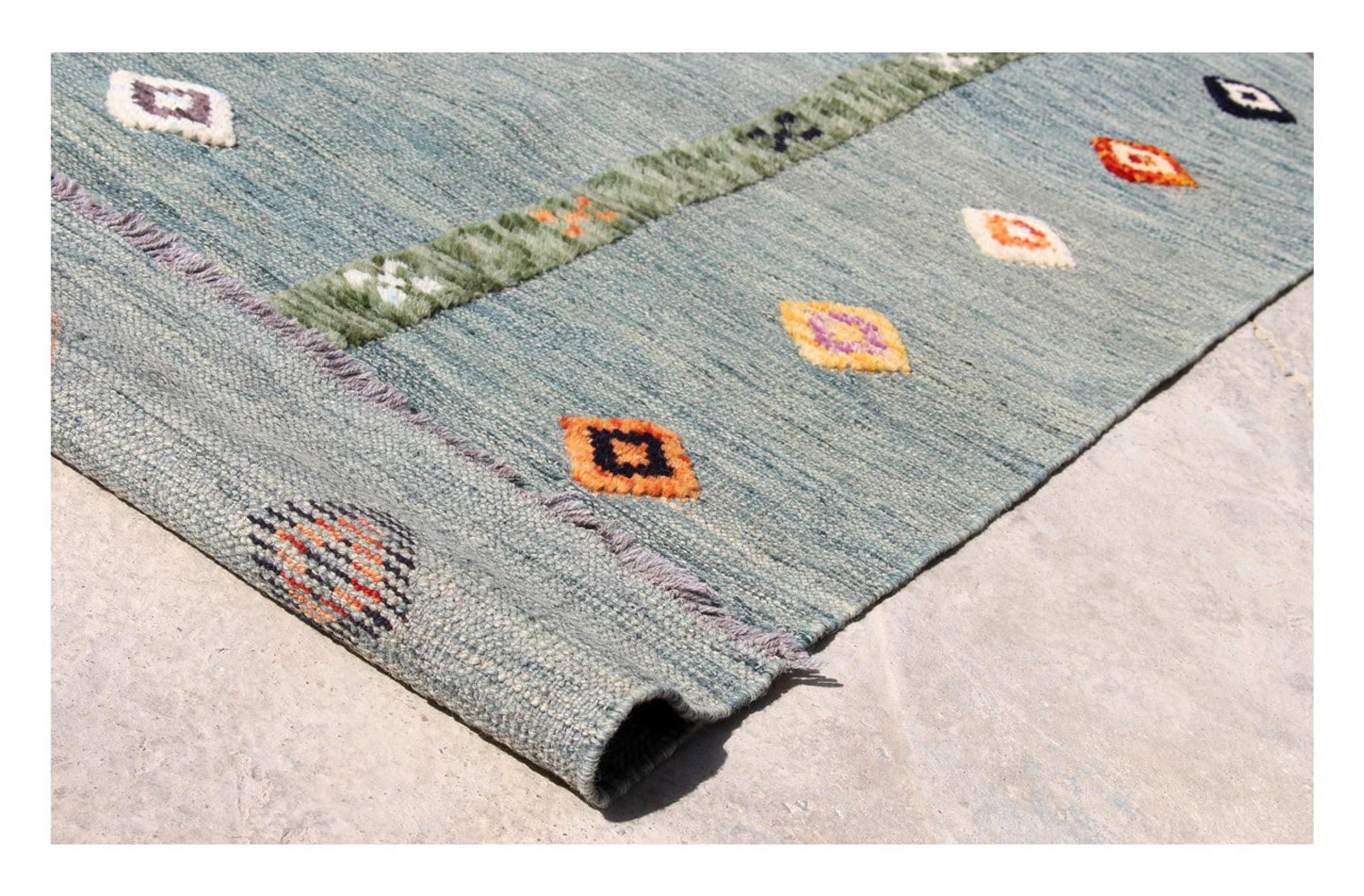 Esta alfombra fue hecha a mano en un telar como un tejido plano. Tejido plano es el término utilizado para describir las alfombras que no tienen pelo. Como el nombre promete, estas alfombras están tejidas y no anudadas. Esto resulta en una alfombra plana con una superficie estructurada. Los tejidos planos no son tan suaves y normalmente más delgados que las alfombras anudadas. Al mismo tiempo, su fabricación es mucho menos compleja y por lo general se pueden disponer por ambos lados (frontal y posterior). Sus patrones suelen ser geométricos, lo cual está determinado por el tejido.