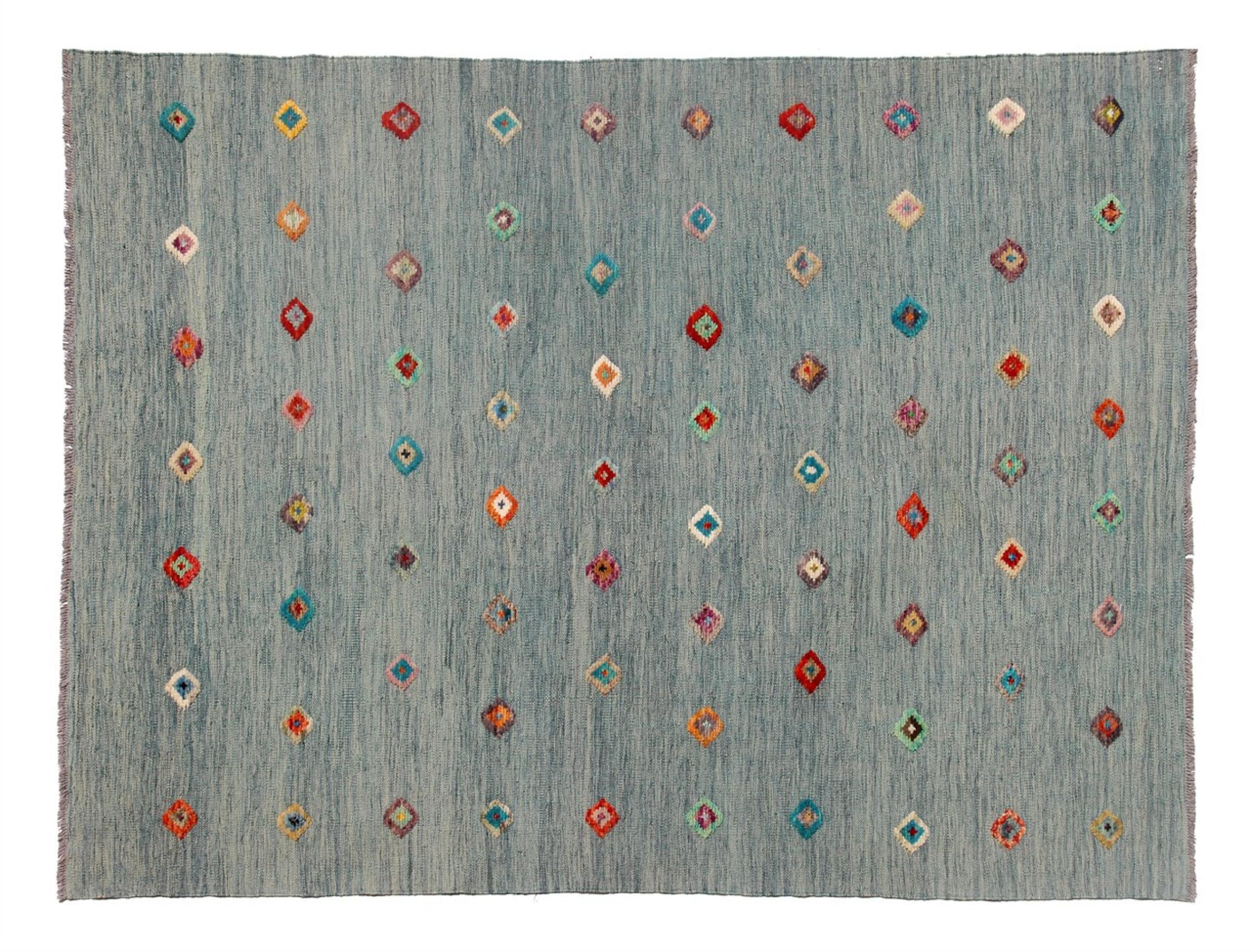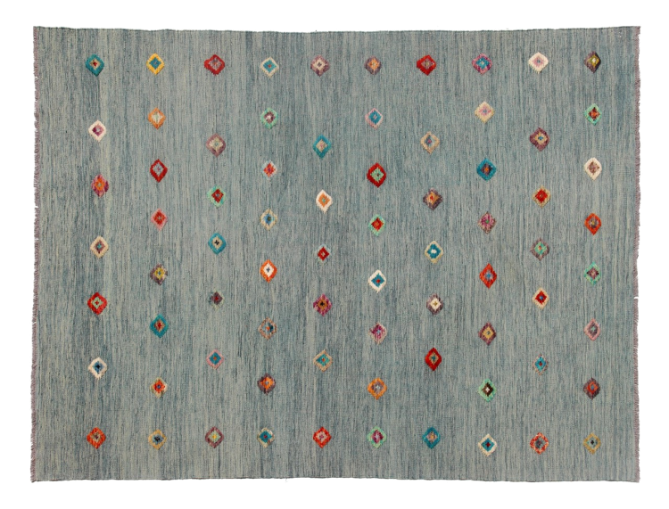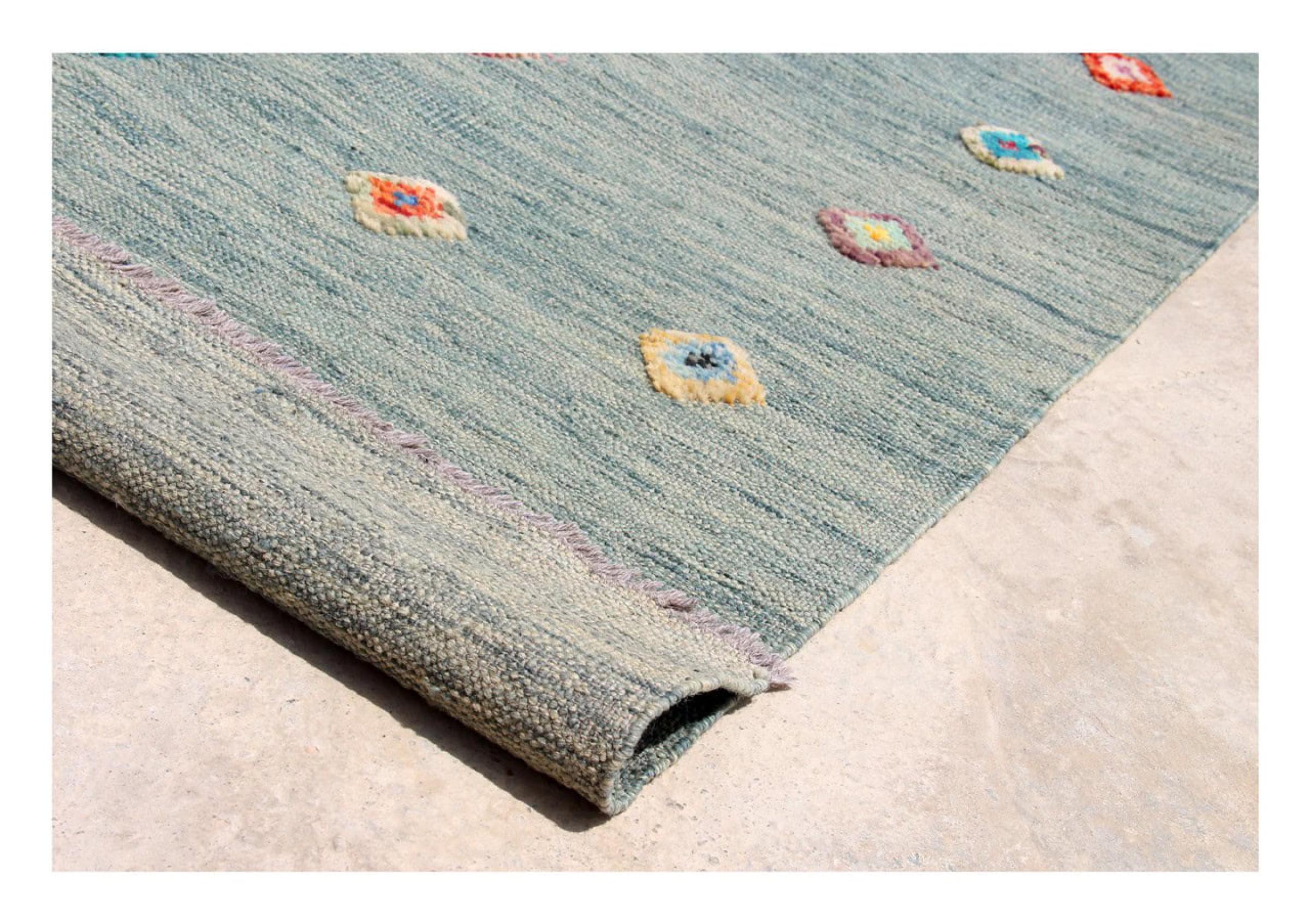 Esta alfombra fue hecha a mano en un telar como un tejido plano. Tejido plano es el término utilizado para describir las alfombras que no tienen pelo. Como el nombre promete, estas alfombras están tejidas y no anudadas. Esto resulta en una alfombra plana con una superficie estructurada. Los tejidos planos no son tan suaves y normalmente más delgados que las alfombras anudadas. Al mismo tiempo, su fabricación es mucho menos compleja y por lo general se pueden disponer por ambos lados (frontal y posterior). Sus patrones suelen ser geométricos, lo cual está determinado por el tejido.