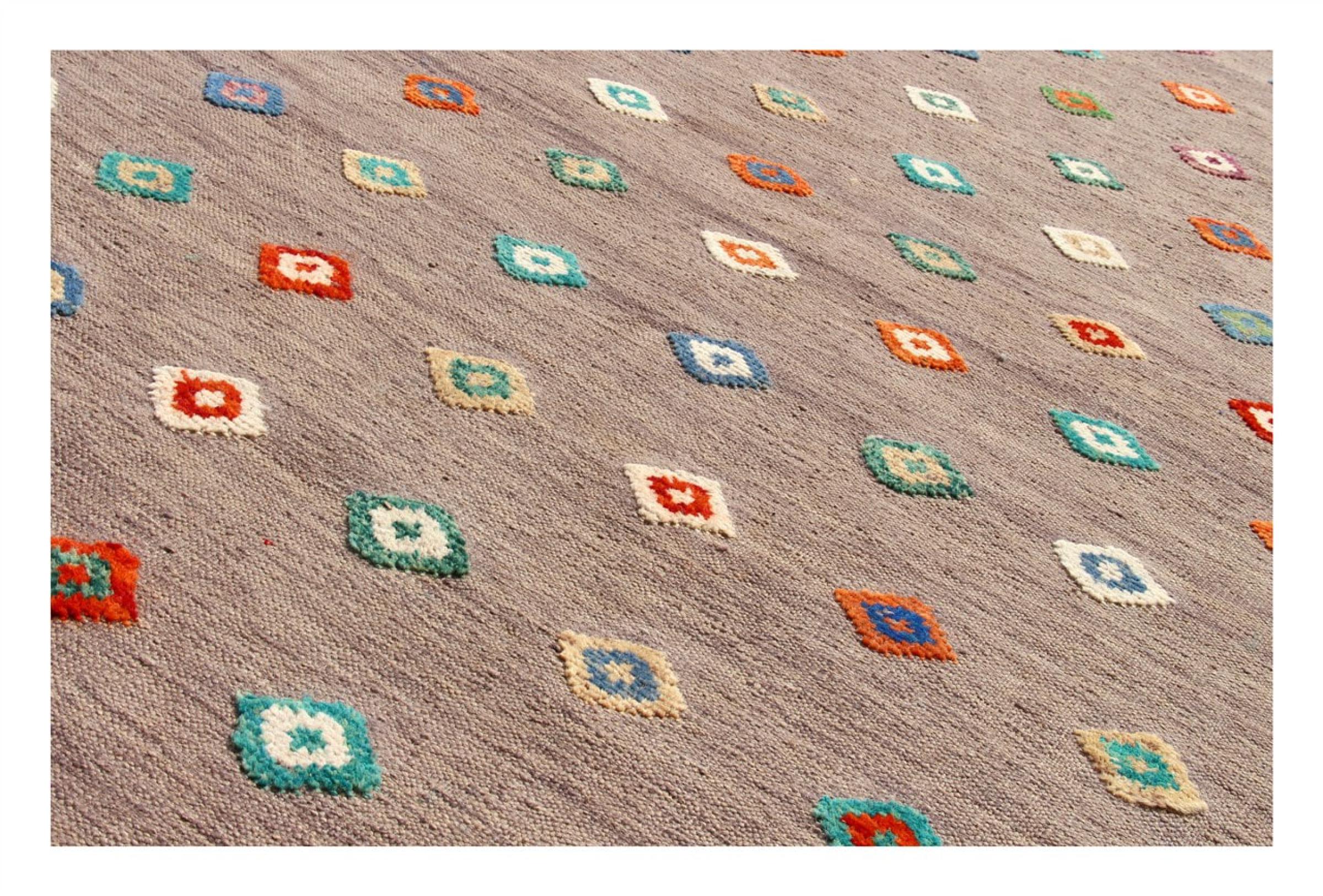 Esta alfombra fue hecha a mano en un telar como un tejido plano. Tejido plano es el término utilizado para describir las alfombras que no tienen pelo. Como el nombre promete, estas alfombras están tejidas y no anudadas. Esto resulta en una alfombra plana con una superficie estructurada. Los tejidos planos no son tan suaves y normalmente más delgados que las alfombras anudadas. Al mismo tiempo, su fabricación es mucho menos compleja y por lo general se pueden disponer por ambos lados (frontal y posterior). Sus patrones suelen ser geométricos, lo cual está determinado por el tejido.