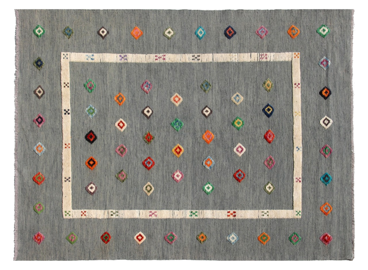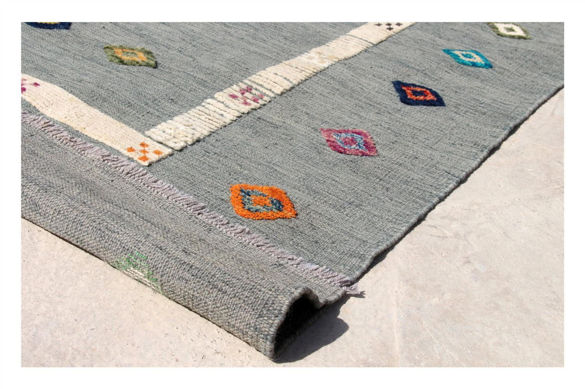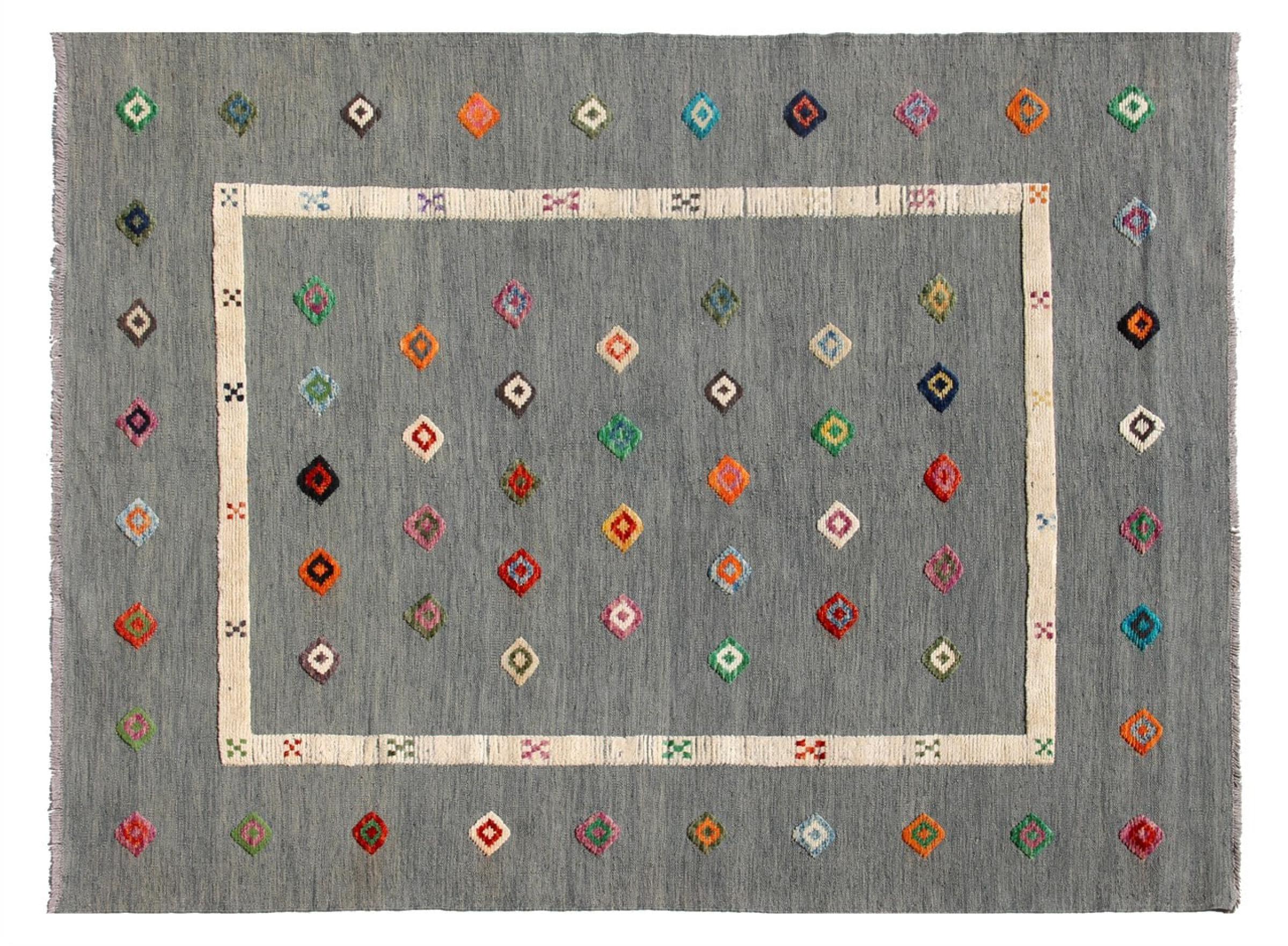 Esta alfombra fue hecha a mano en un telar como un tejido plano. Tejido plano es el término utilizado para describir las alfombras que no tienen pelo. Como el nombre promete, estas alfombras están tejidas y no anudadas. Esto resulta en una alfombra plana con una superficie estructurada. Los tejidos planos no son tan suaves y normalmente más delgados que las alfombras anudadas. Al mismo tiempo, su fabricación es mucho menos compleja y por lo general se pueden disponer por ambos lados (frontal y posterior). Sus patrones suelen ser geométricos, lo cual está determinado por el tejido.