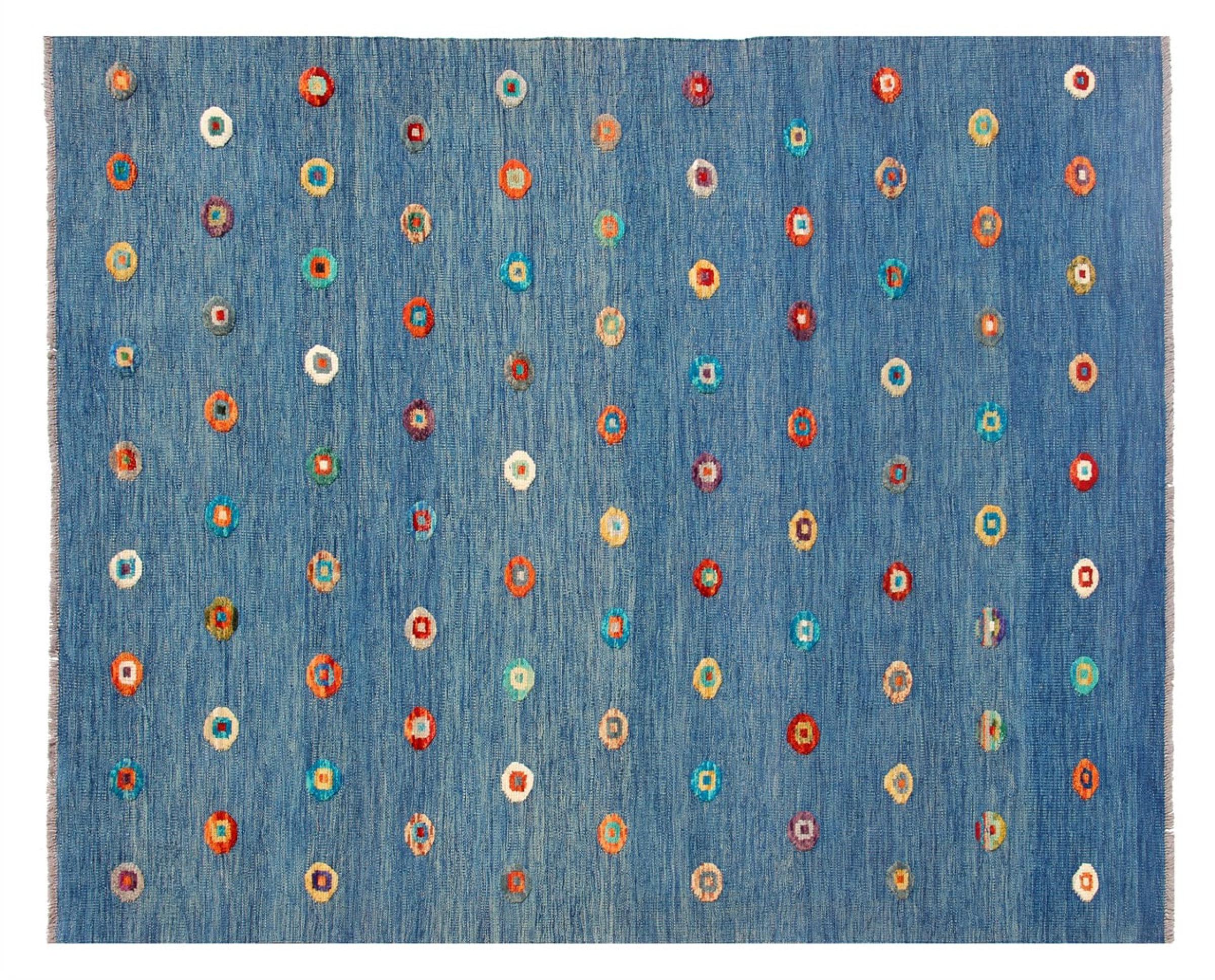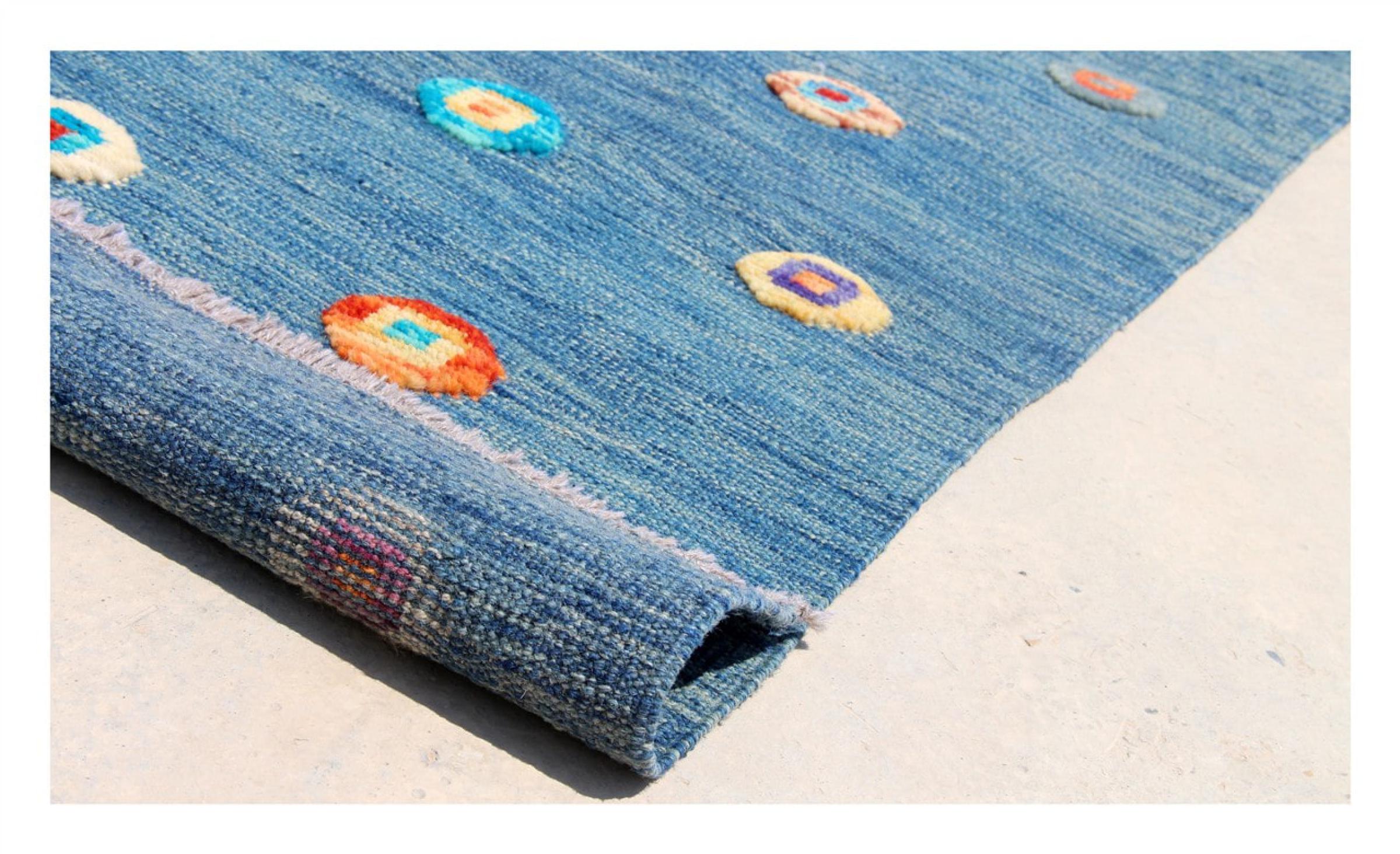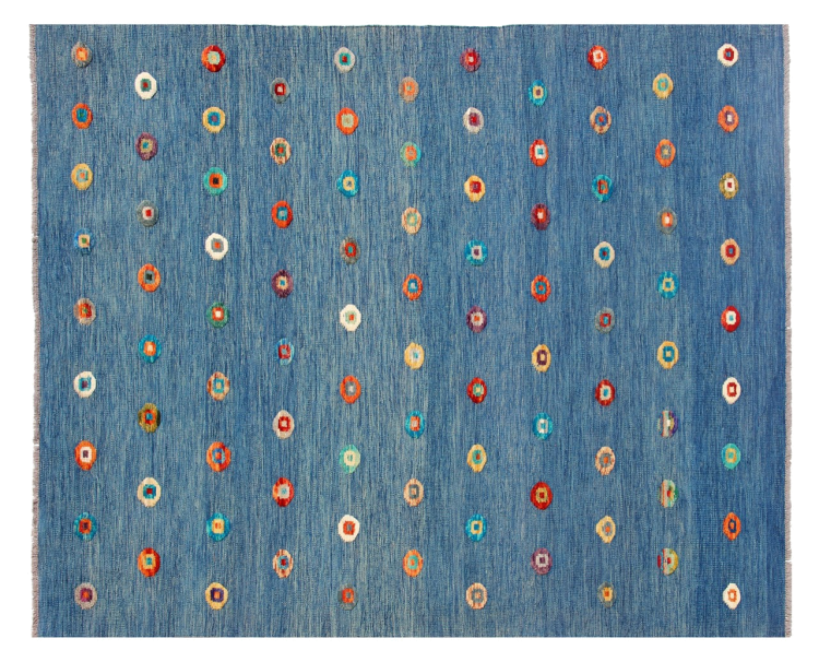Esta alfombra fue hecha a mano en un telar como un tejido plano. Tejido plano es el término utilizado para describir las alfombras que no tienen pelo. Como el nombre promete, estas alfombras están tejidas y no anudadas. Esto resulta en una alfombra plana con una superficie estructurada. Los tejidos planos no son tan suaves y normalmente más delgados que las alfombras anudadas. Al mismo tiempo, su fabricación es mucho menos compleja y por lo general se pueden disponer por ambos lados (frontal y posterior). Sus patrones suelen ser geométricos, lo cual está determinado por el tejido.