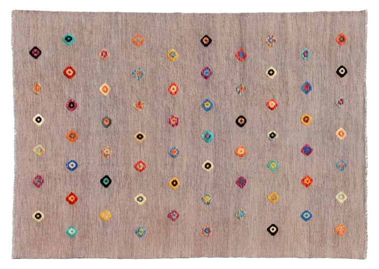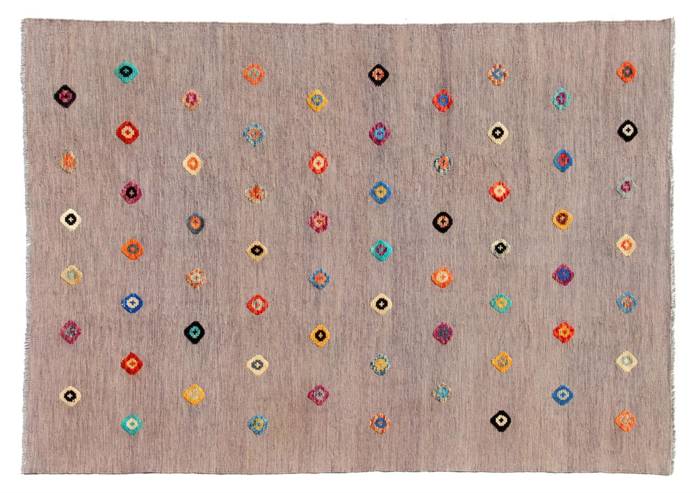 Esta alfombra fue hecha a mano en un telar como un tejido plano. Tejido plano es el término utilizado para describir las alfombras que no tienen pelo. Como el nombre promete, estas alfombras están tejidas y no anudadas. Esto resulta en una alfombra plana con una superficie estructurada. Los tejidos planos no son tan suaves y normalmente más delgados que las alfombras anudadas. Al mismo tiempo, su fabricación es mucho menos compleja y por lo general se pueden disponer por ambos lados (frontal y posterior). Sus patrones suelen ser geométricos, lo cual está determinado por el tejido.