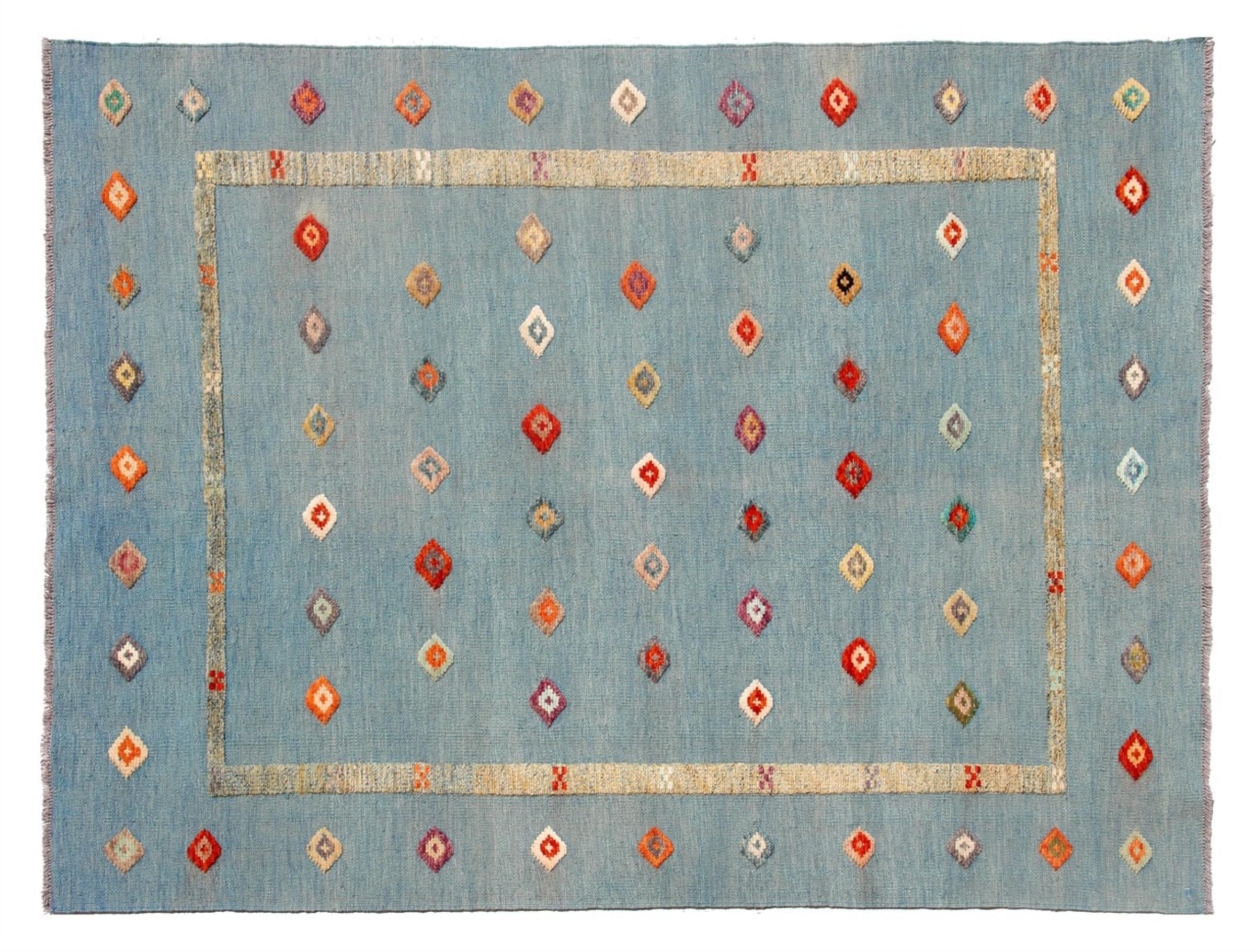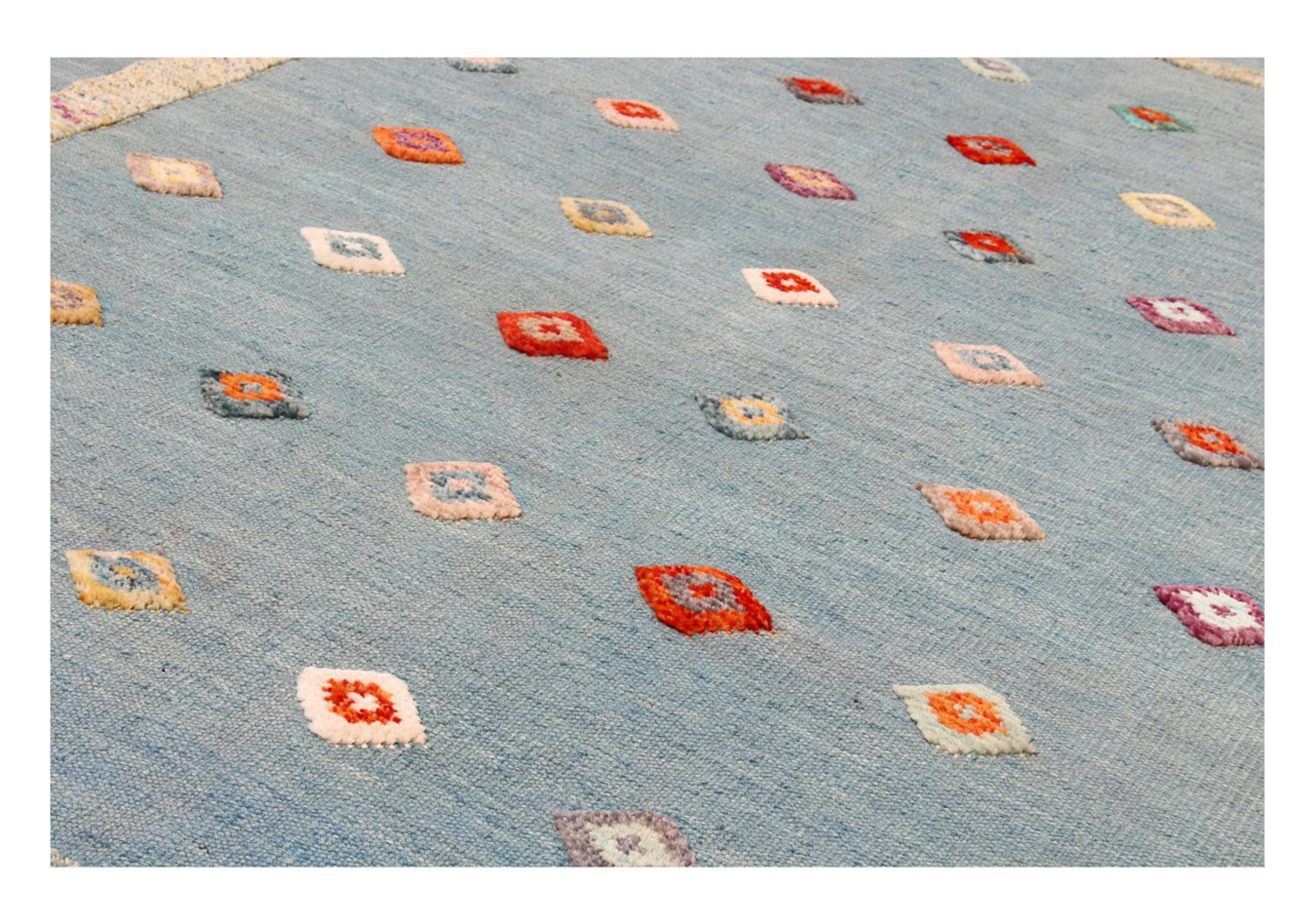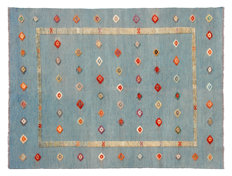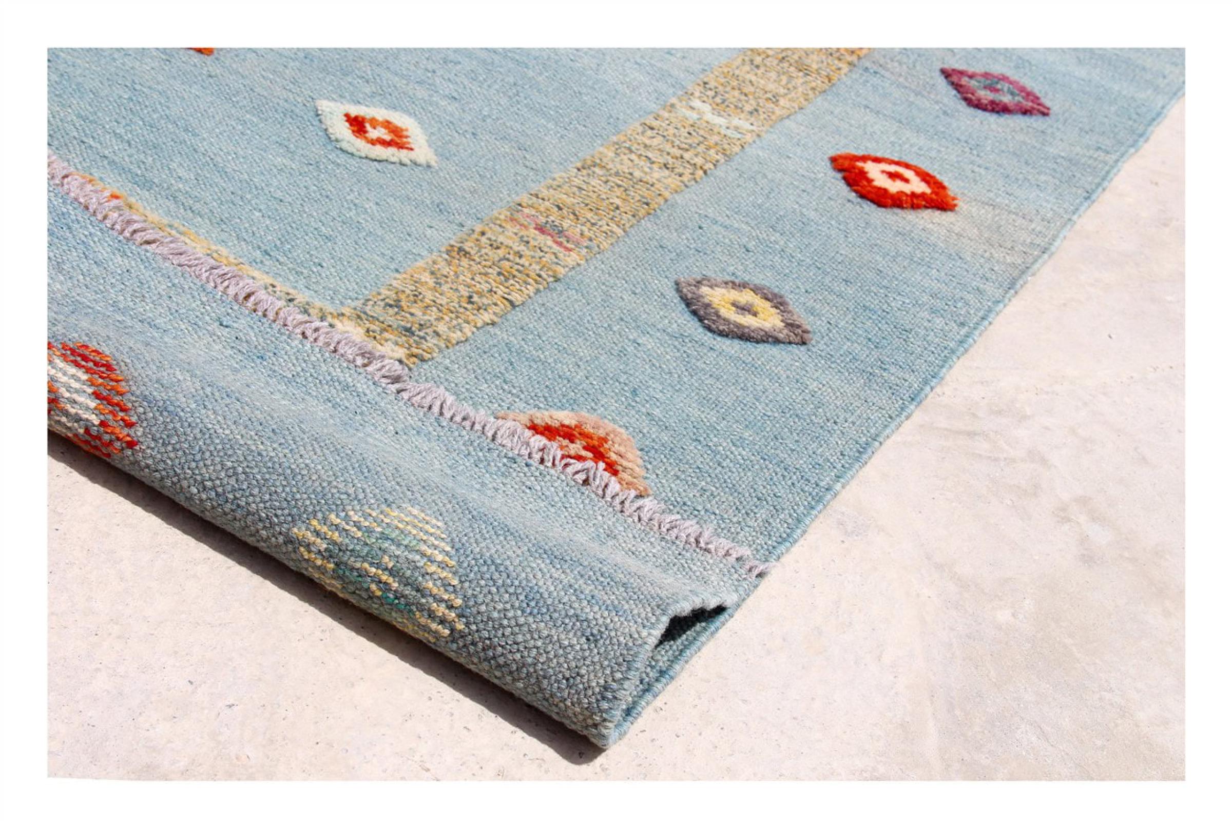 Esta alfombra fue hecha a mano en un telar como un tejido plano. Tejido plano es el término utilizado para describir las alfombras que no tienen pelo. Como el nombre promete, estas alfombras están tejidas y no anudadas. Esto resulta en una alfombra plana con una superficie estructurada. Los tejidos planos no son tan suaves y normalmente más delgados que las alfombras anudadas. Al mismo tiempo, su fabricación es mucho menos compleja y por lo general se pueden disponer por ambos lados (frontal y posterior). Sus patrones suelen ser geométricos, lo cual está determinado por el tejido.