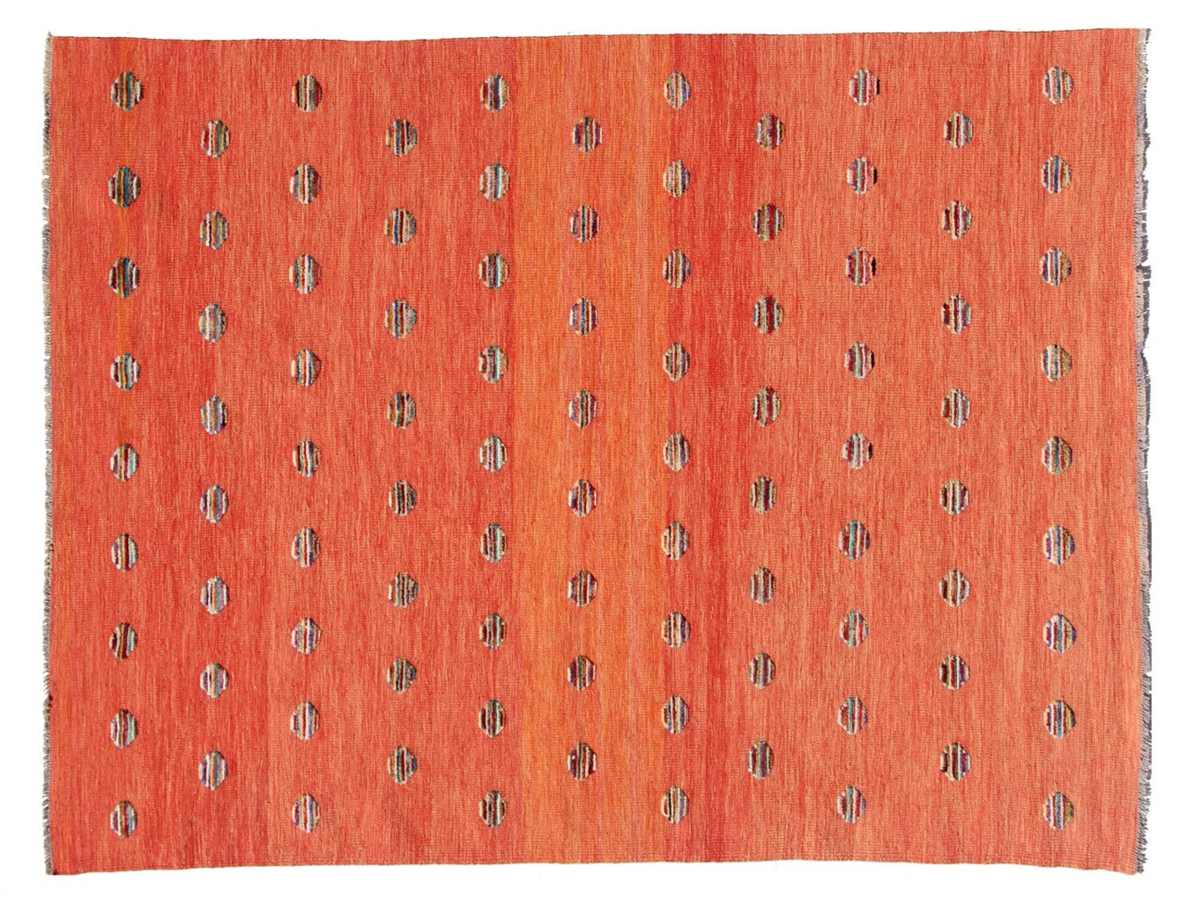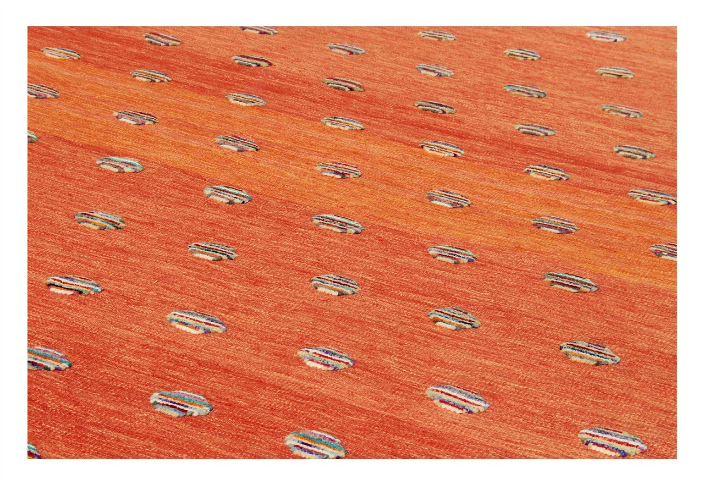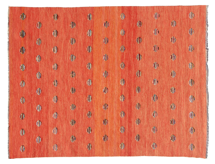 Esta alfombra fue hecha a mano en un telar como un tejido plano. Tejido plano es el término utilizado para describir las alfombras que no tienen pelo. Como el nombre promete, estas alfombras están tejidas y no anudadas. Esto resulta en una alfombra plana con una superficie estructurada. Los tejidos planos no son tan suaves y normalmente más delgados que las alfombras anudadas. Al mismo tiempo, su fabricación es mucho menos compleja y por lo general se pueden disponer por ambos lados (frontal y posterior). Sus patrones suelen ser geométricos, lo cual está determinado por el tejido.