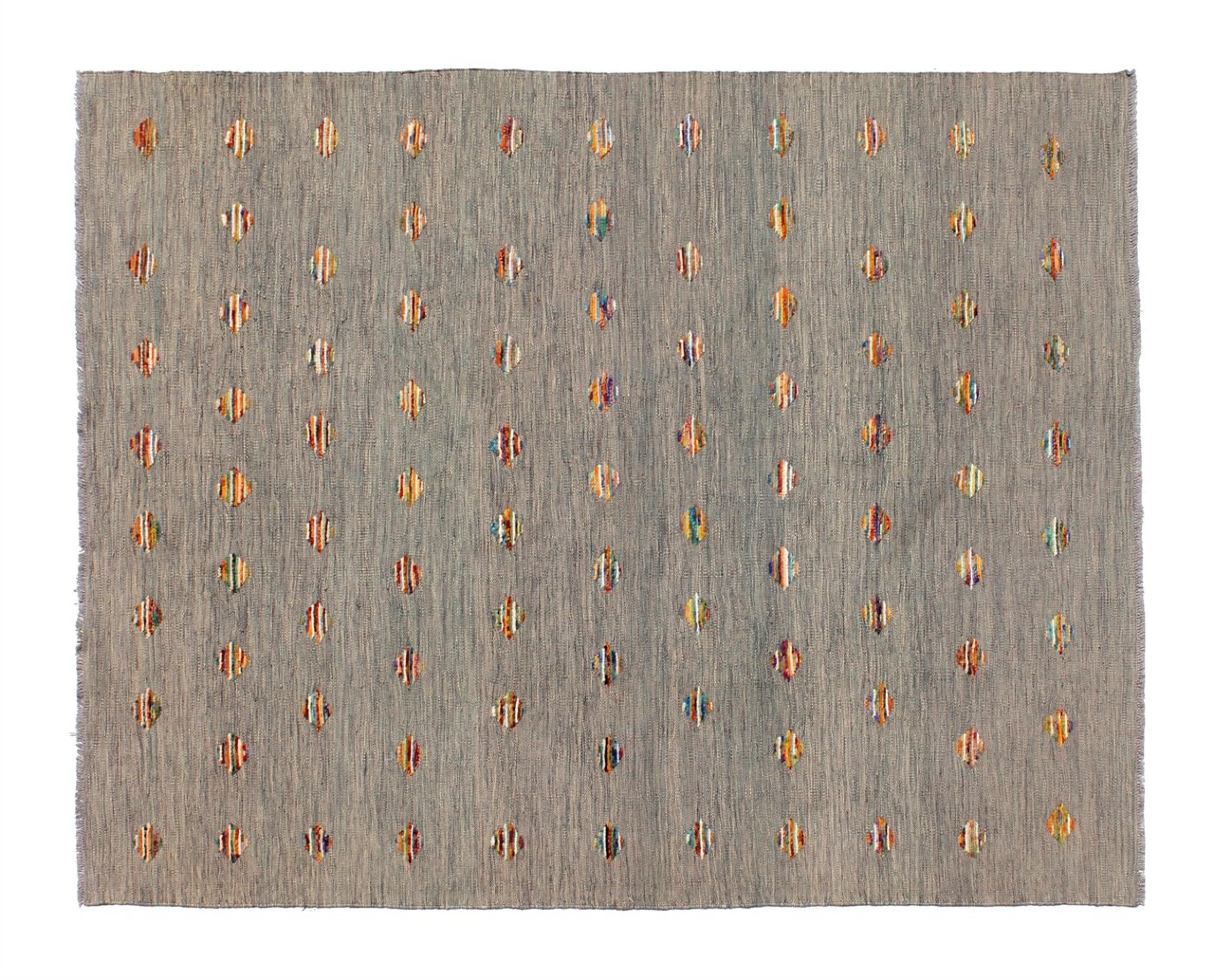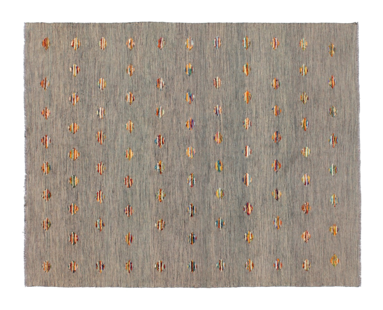 Esta alfombra fue hecha a mano en un telar como un tejido plano. Tejido plano es el término utilizado para describir las alfombras que no tienen pelo. Como el nombre promete, estas alfombras están tejidas y no anudadas. Esto resulta en una alfombra plana con una superficie estructurada. Los tejidos planos no son tan suaves y normalmente más delgados que las alfombras anudadas. Al mismo tiempo, su fabricación es mucho menos compleja y por lo general se pueden disponer por ambos lados (frontal y posterior). Sus patrones suelen ser geométricos, lo cual está determinado por el tejido.