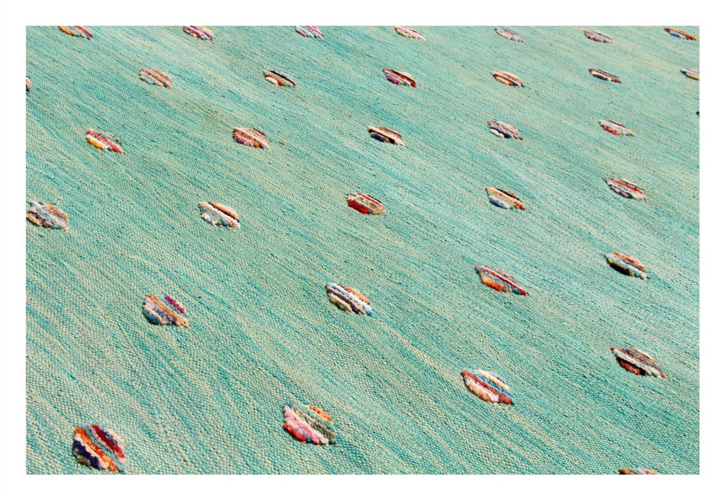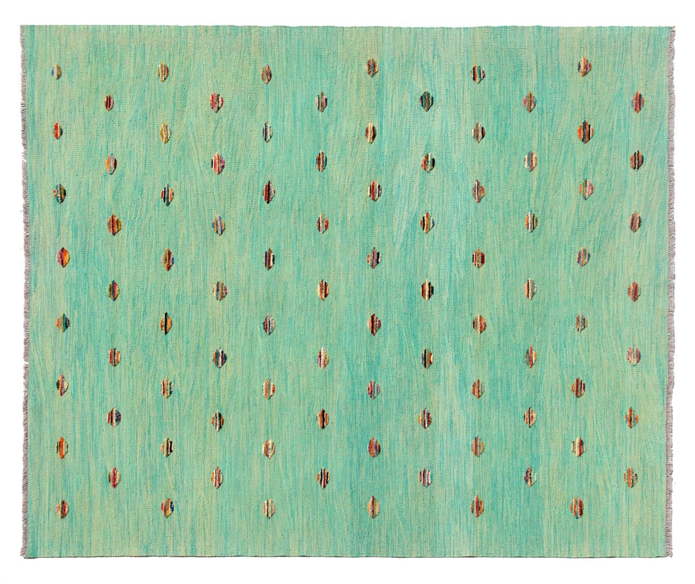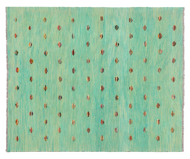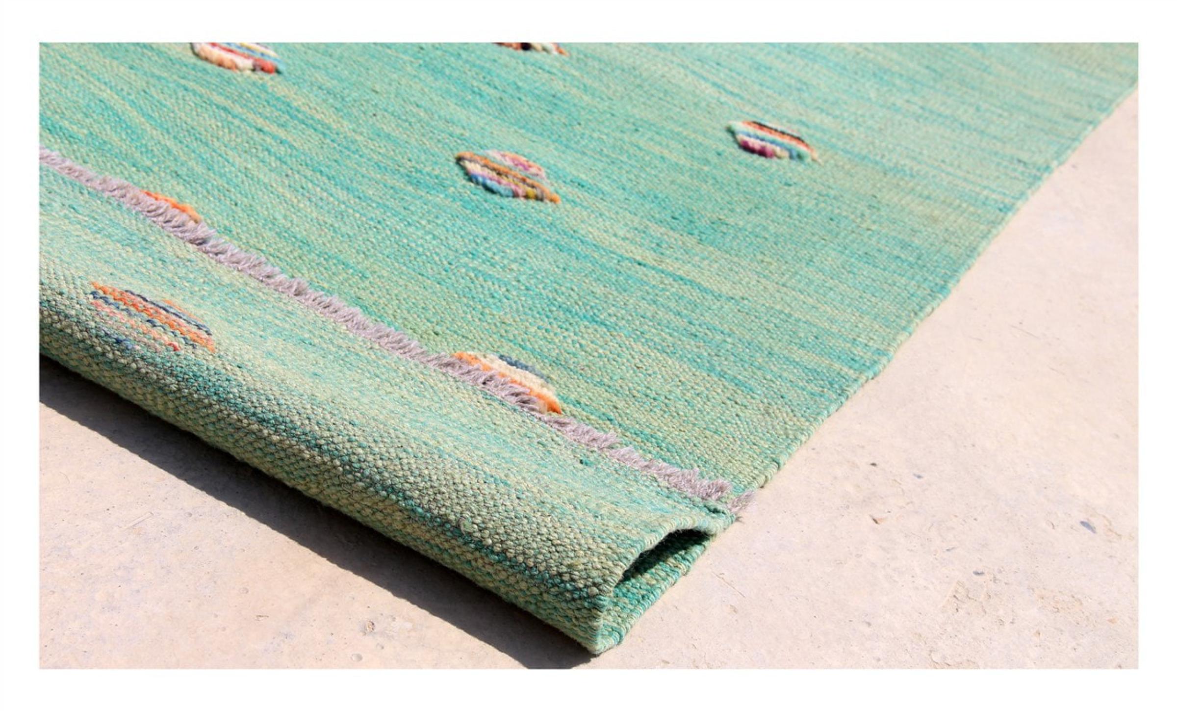 Esta alfombra fue hecha a mano en un telar como un tejido plano. Tejido plano es el término utilizado para describir las alfombras que no tienen pelo. Como el nombre promete, estas alfombras están tejidas y no anudadas. Esto resulta en una alfombra plana con una superficie estructurada. Los tejidos planos no son tan suaves y normalmente más delgados que las alfombras anudadas. Al mismo tiempo, su fabricación es mucho menos compleja y por lo general se pueden disponer por ambos lados (frontal y posterior). Sus patrones suelen ser geométricos, lo cual está determinado por el tejido.