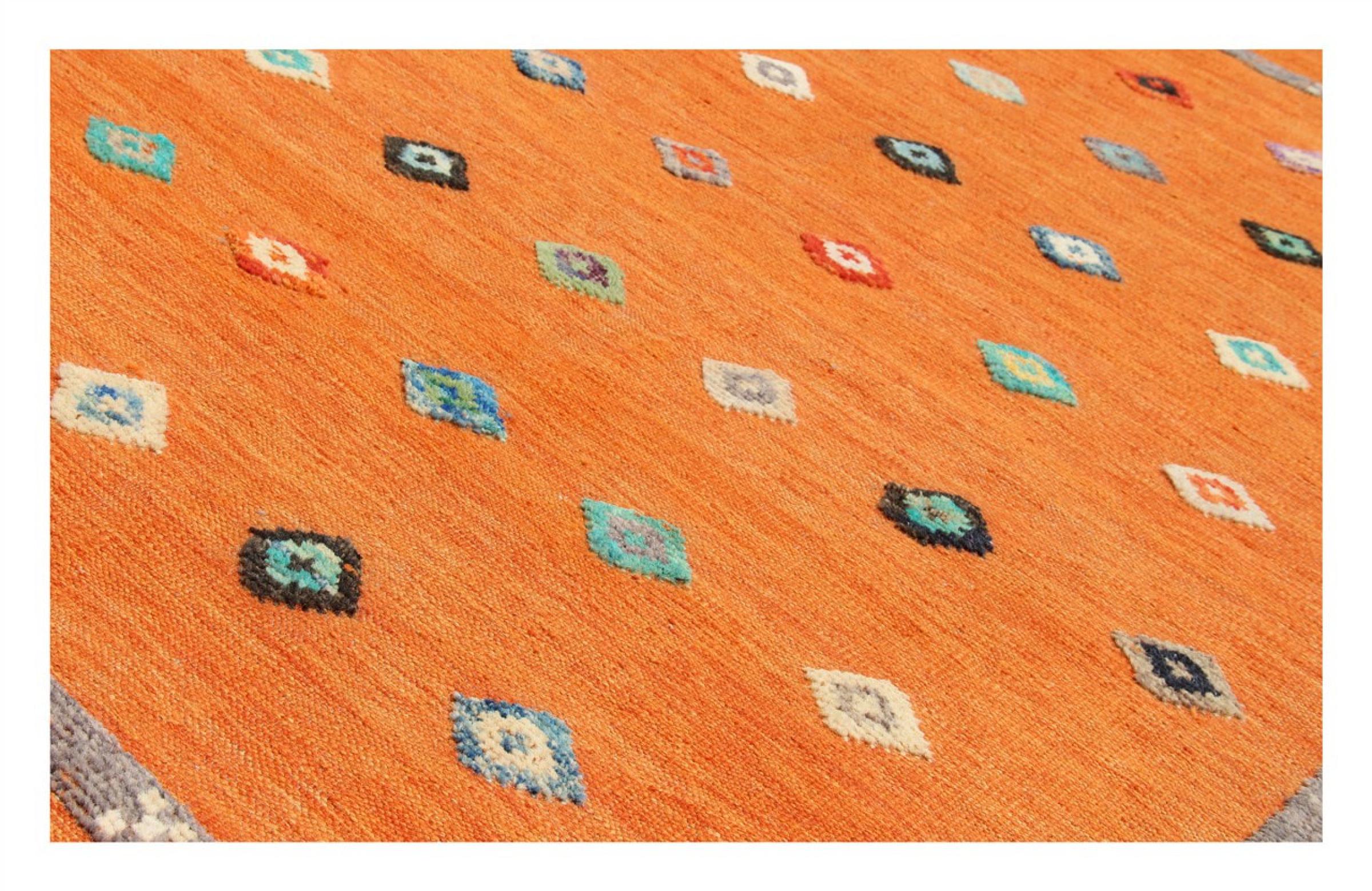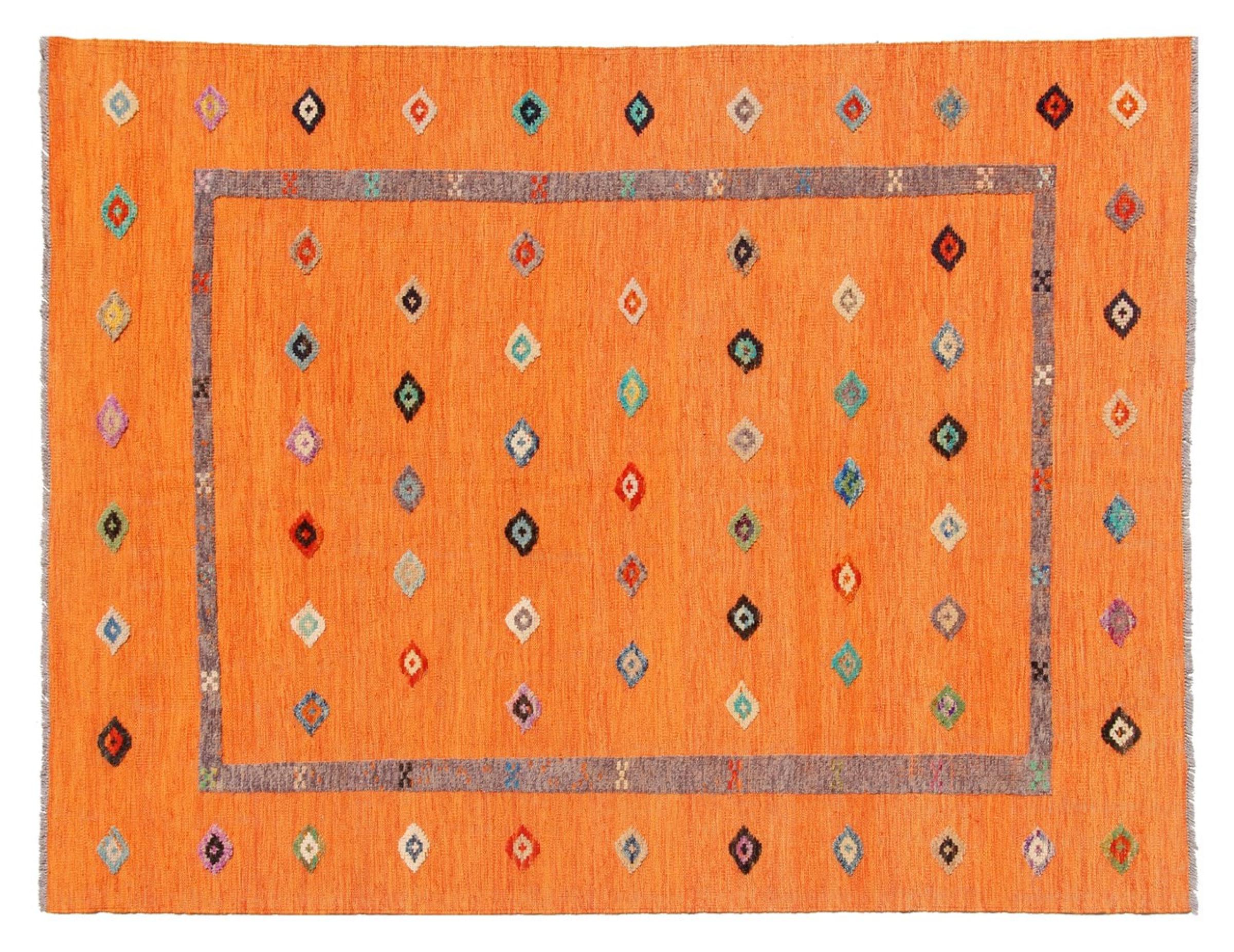 Esta alfombra fue hecha a mano en un telar como un tejido plano. Tejido plano es el término utilizado para describir las alfombras que no tienen pelo. Como el nombre promete, estas alfombras están tejidas y no anudadas. Esto resulta en una alfombra plana con una superficie estructurada. Los tejidos planos no son tan suaves y normalmente más delgados que las alfombras anudadas. Al mismo tiempo, su fabricación es mucho menos compleja y por lo general se pueden disponer por ambos lados (frontal y posterior). Sus patrones suelen ser geométricos, lo cual está determinado por el tejido.