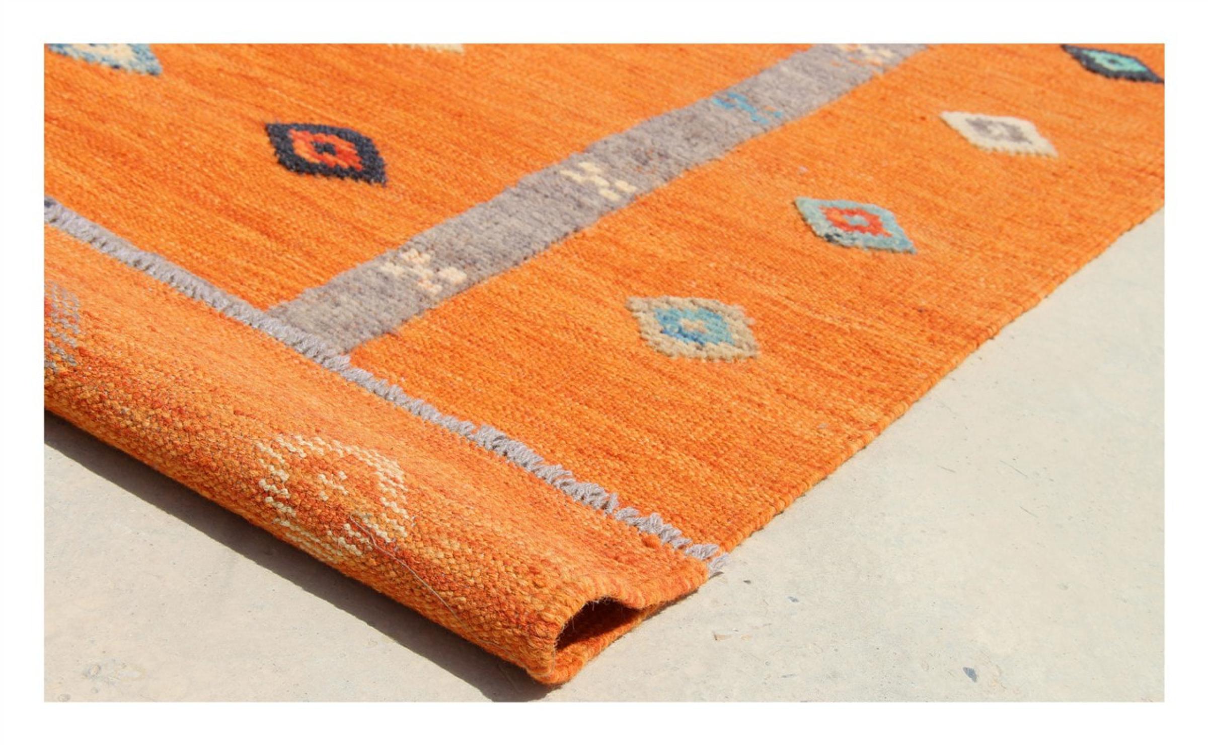 Estas alfombras kilim muestran una diferencia decisiva con las alfombras anudadas a mano - son tejidas a mano. Por lo tanto, no tienen un montón alto de lana y son a menudo más planos y más ásperos que las alfombras de lana anudada. Su fabricación es menos elaborada y por eso suelen ser mucho más baratas. Como ventaja, las alfombras de kilim son también mucho más ligeras y pueden ser colocadas por delante y por detrás. Los kilims tejidos a mano provienen originalmente de la antigua Persia y ahora también se fabrican a menudo en el Afganistán. Tienen patrones bastante simples y directos, que se deben a su técnica de tejido.