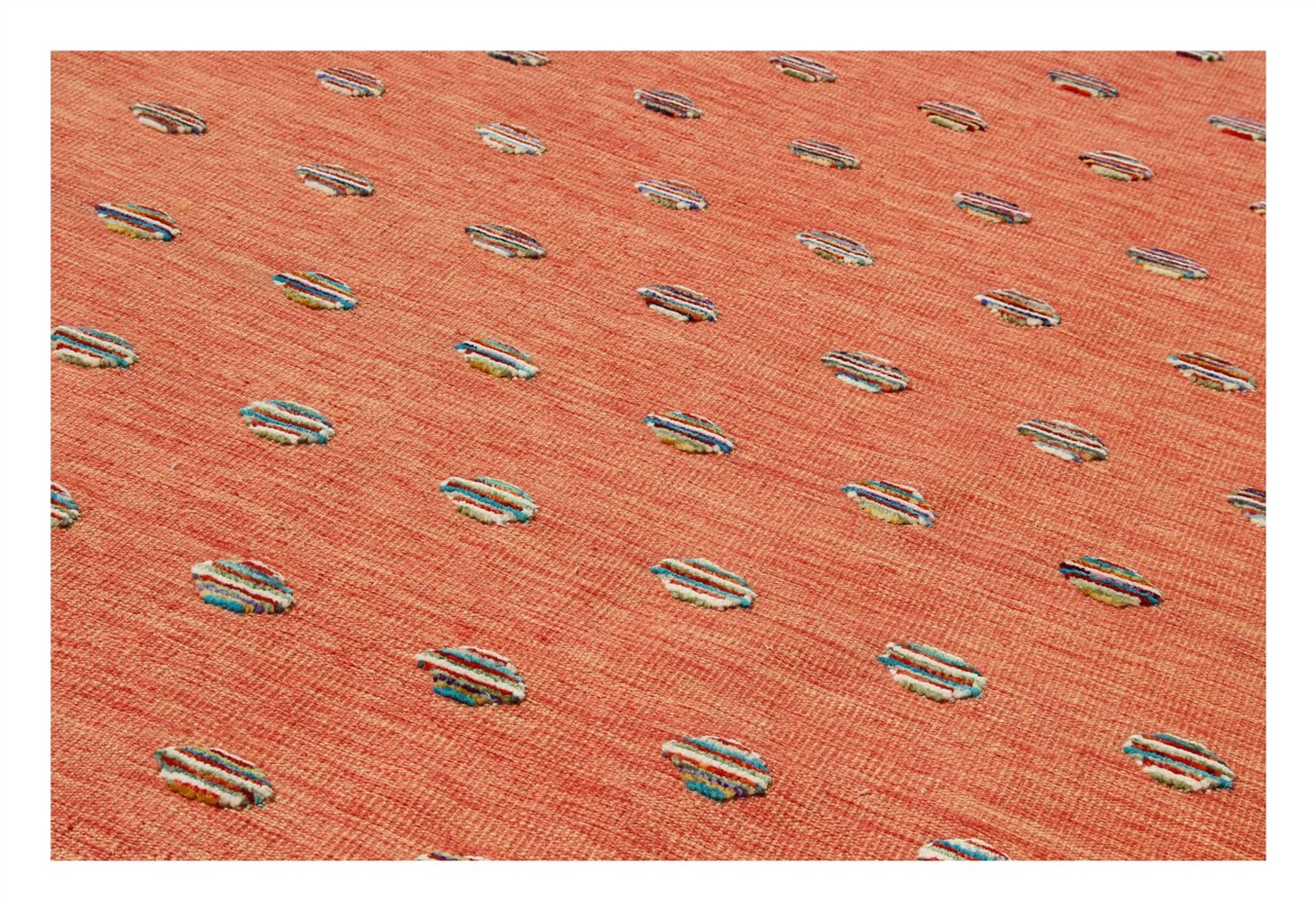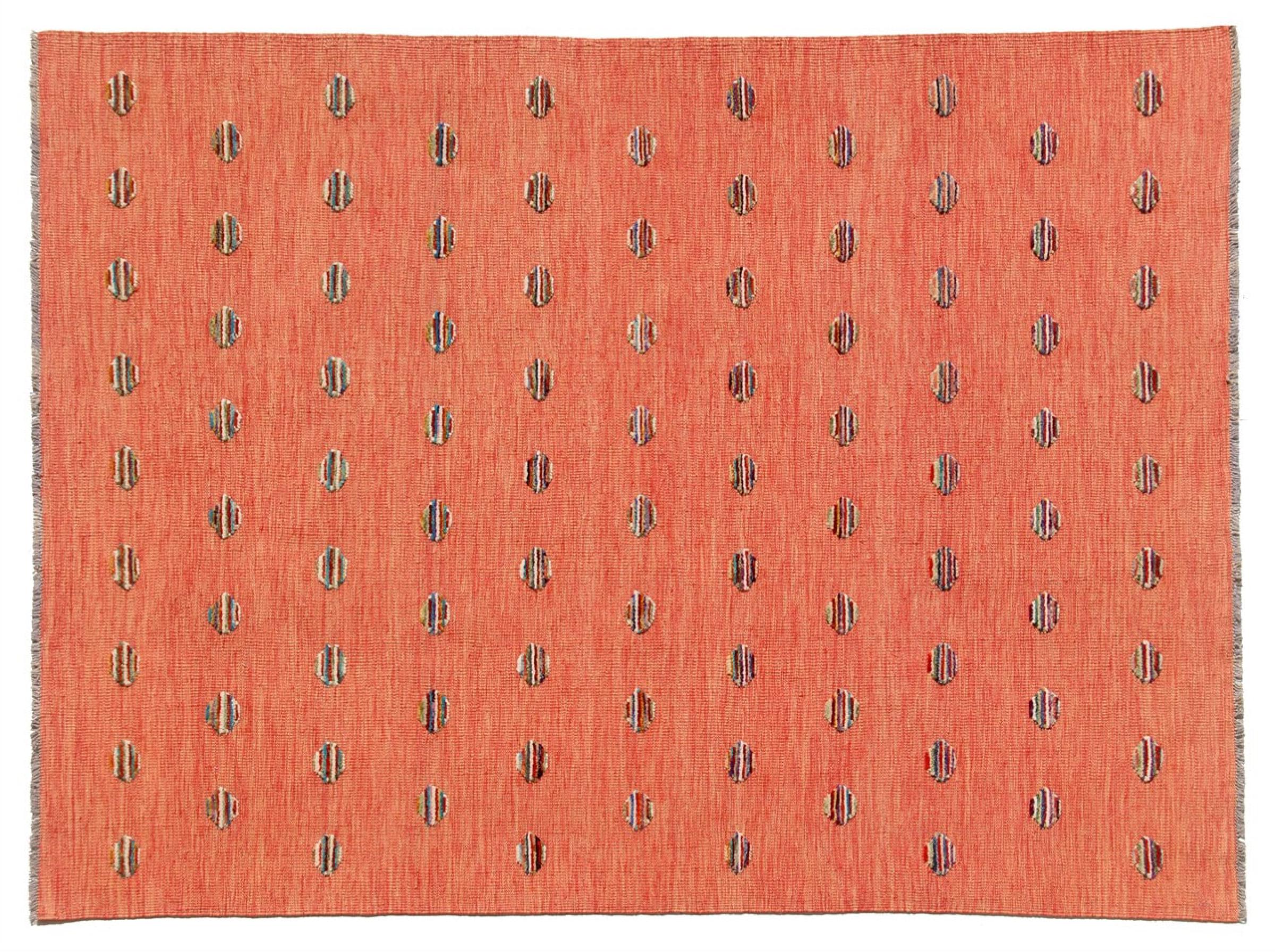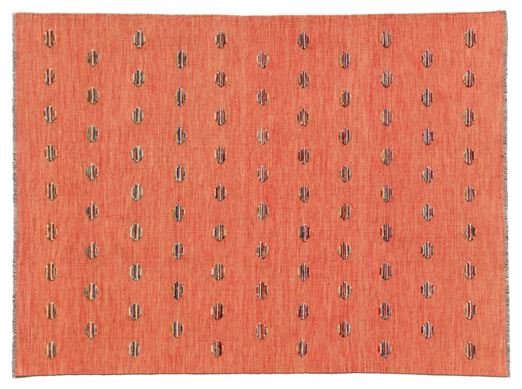 Esta alfombra fue hecha a mano en un telar como un tejido plano. Tejido plano es el término utilizado para describir las alfombras que no tienen pelo. Como el nombre promete, estas alfombras están tejidas y no anudadas. Esto resulta en una alfombra plana con una superficie estructurada. Los tejidos planos no son tan suaves y normalmente más delgados que las alfombras anudadas. Al mismo tiempo, su fabricación es mucho menos compleja y por lo general se pueden disponer por ambos lados (frontal y posterior). Sus patrones suelen ser geométricos, lo cual está determinado por el tejido.
