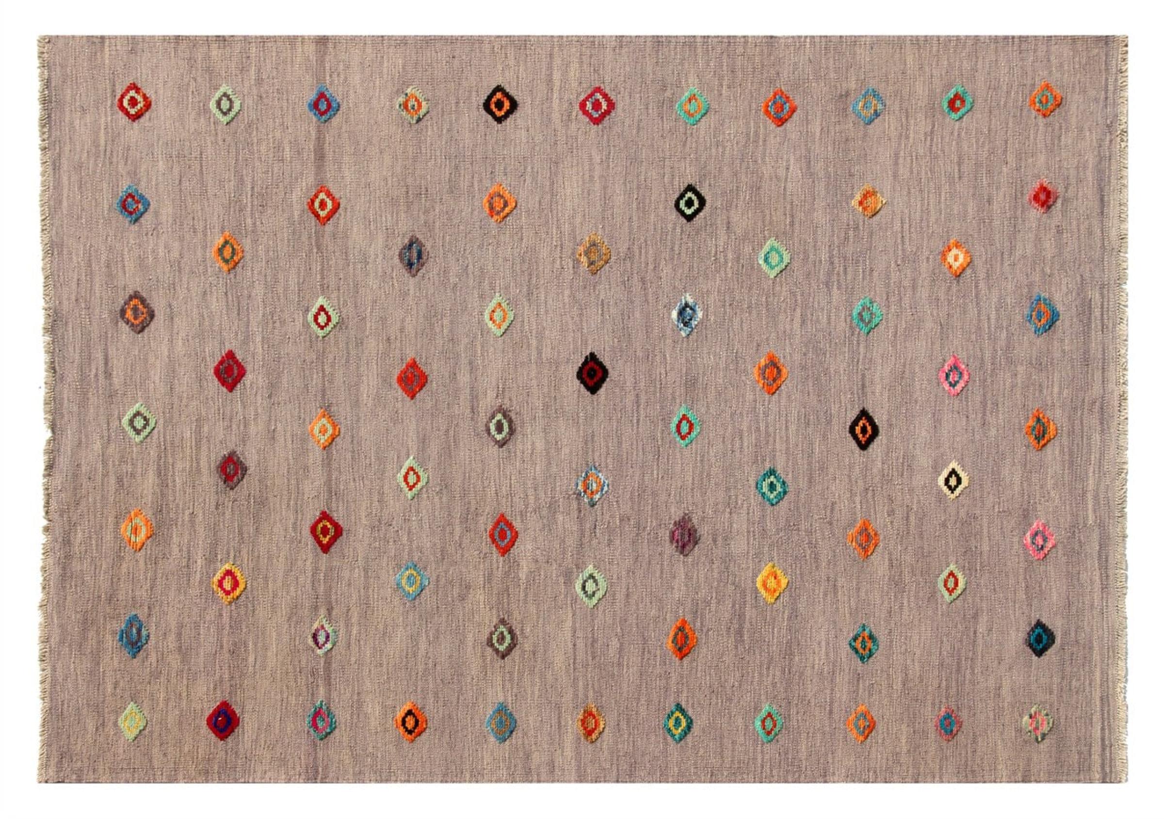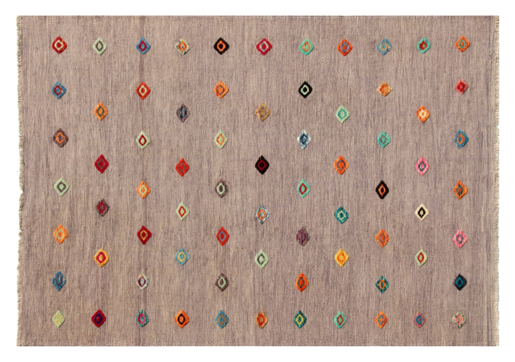 Esta alfombra fue hecha a mano en un telar como un tejido plano. Tejido plano es el término utilizado para describir las alfombras que no tienen pelo. Como el nombre promete, estas alfombras están tejidas y no anudadas. Esto resulta en una alfombra plana con una superficie estructurada. Los tejidos planos no son tan suaves y normalmente más delgados que las alfombras anudadas. Al mismo tiempo, su fabricación es mucho menos compleja y por lo general se pueden disponer por ambos lados (frontal y posterior). Sus patrones suelen ser geométricos, lo cual está determinado por el tejido.