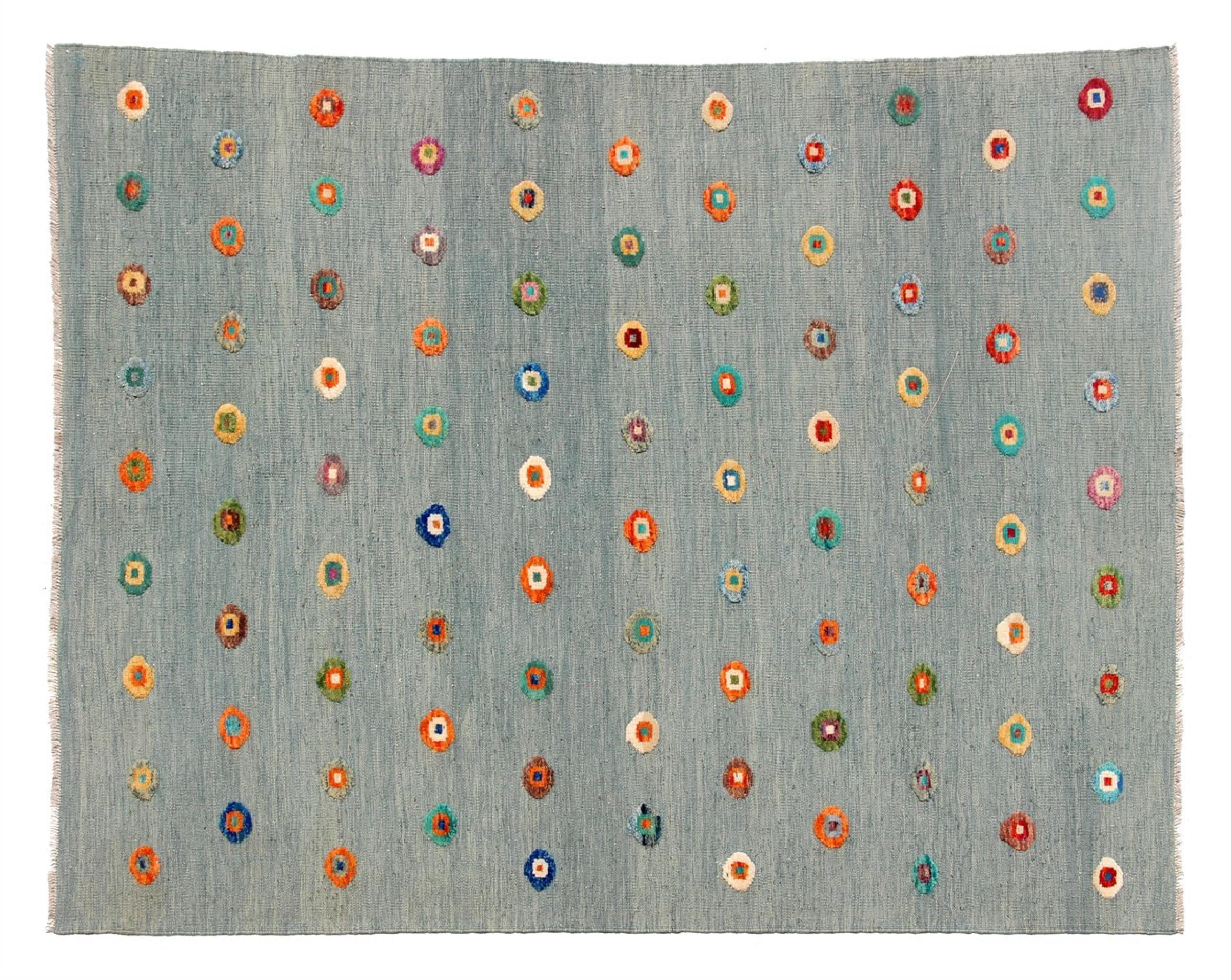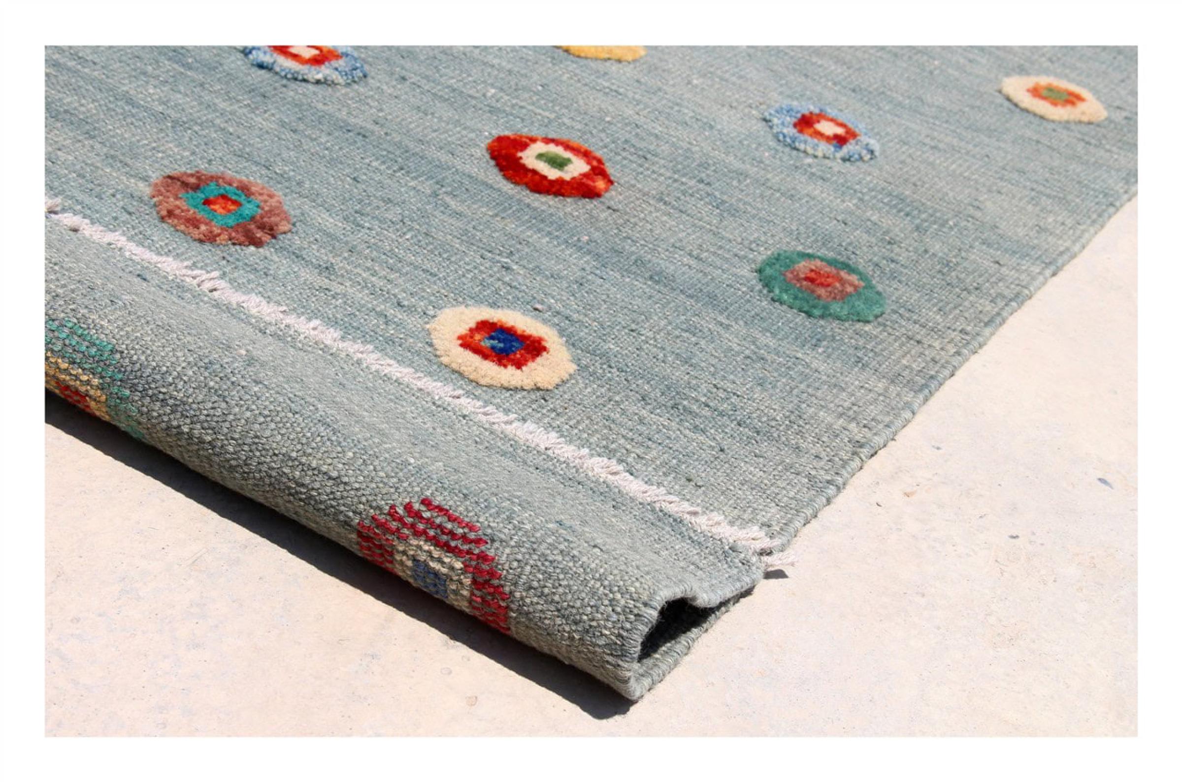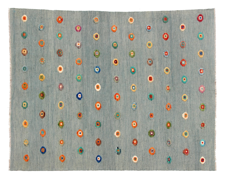 Esta alfombra fue hecha a mano en un telar como un tejido plano. Tejido plano es el término utilizado para describir las alfombras que no tienen pelo. Como el nombre promete, estas alfombras están tejidas y no anudadas. Esto resulta en una alfombra plana con una superficie estructurada. Los tejidos planos no son tan suaves y normalmente más delgados que las alfombras anudadas. Al mismo tiempo, su fabricación es mucho menos compleja y por lo general se pueden disponer por ambos lados (frontal y posterior). Sus patrones suelen ser geométricos, lo cual está determinado por el tejido.