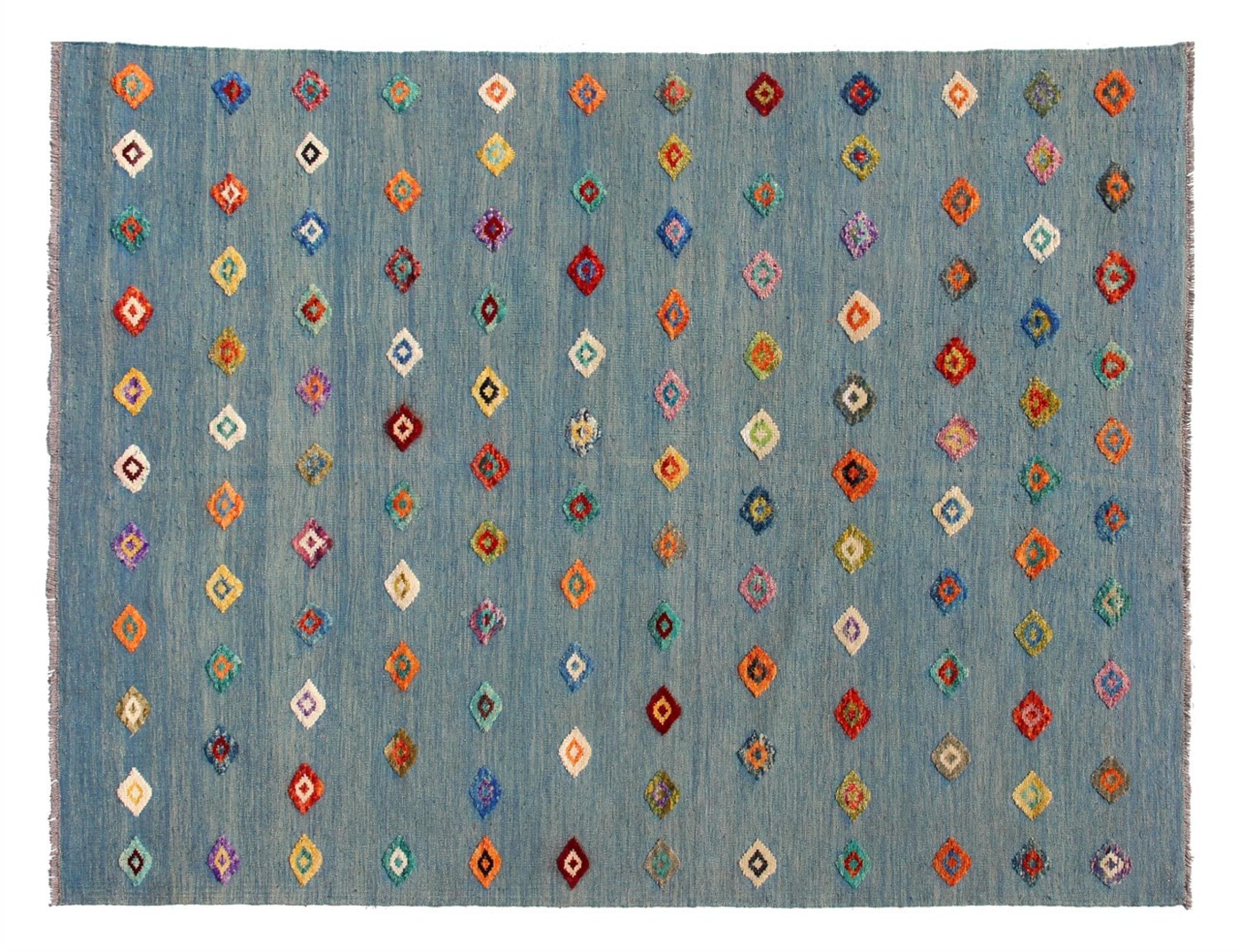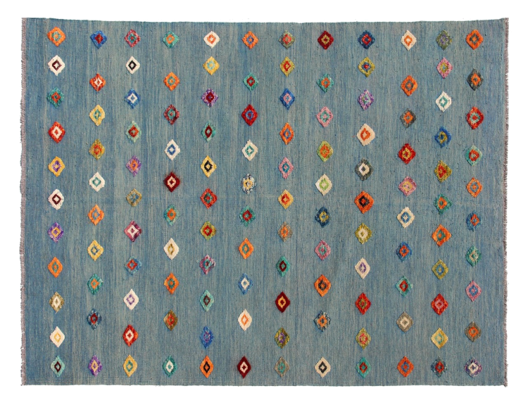 Esta alfombra fue hecha a mano en un telar como un tejido plano. Tejido plano es el término utilizado para describir las alfombras que no tienen pelo. Como el nombre promete, estas alfombras están tejidas y no anudadas. Esto resulta en una alfombra plana con una superficie estructurada. Los tejidos planos no son tan suaves y normalmente más delgados que las alfombras anudadas. Al mismo tiempo, su fabricación es mucho menos compleja y por lo general se pueden disponer por ambos lados (frontal y posterior). Sus patrones suelen ser geométricos, lo cual está determinado por el tejido.