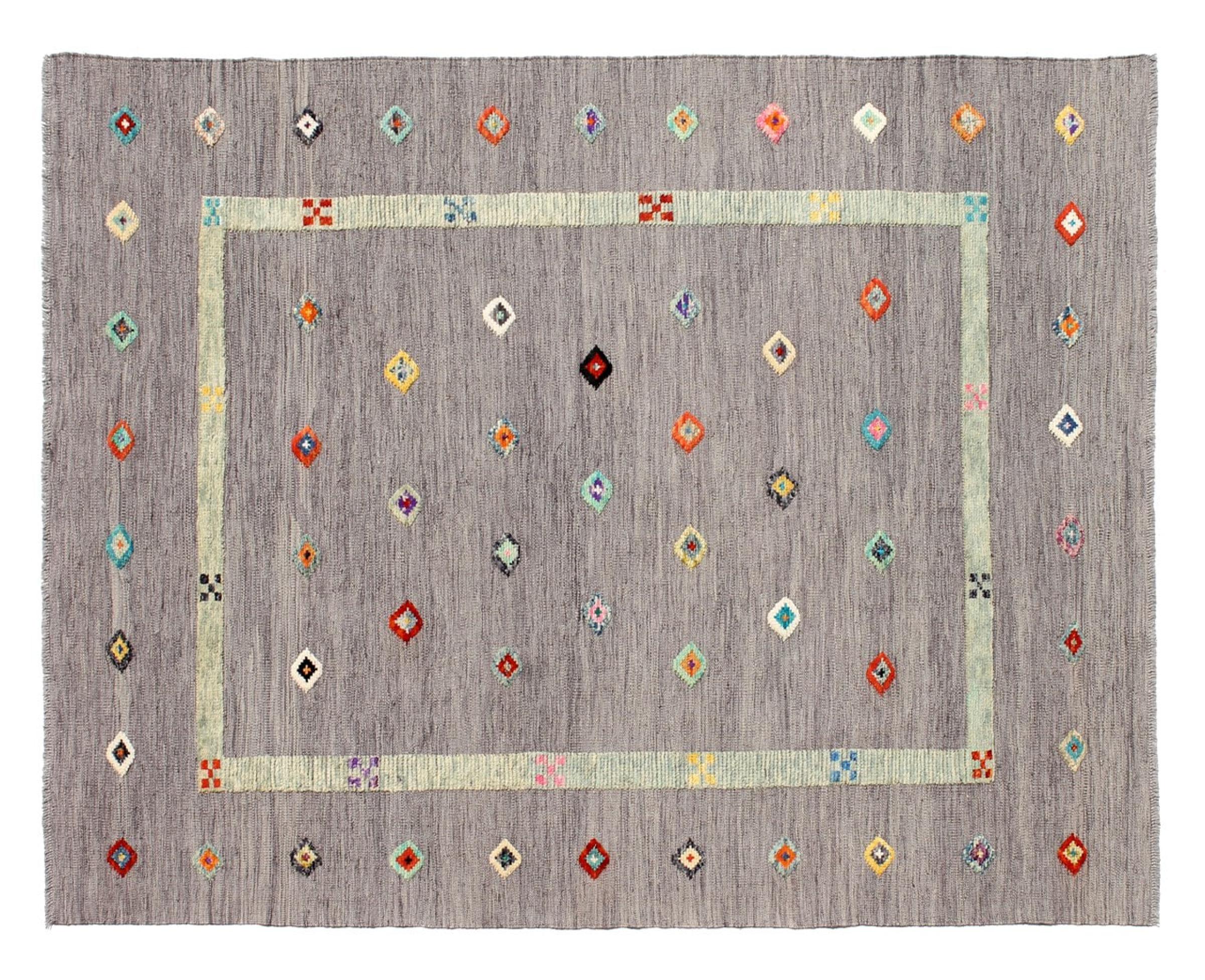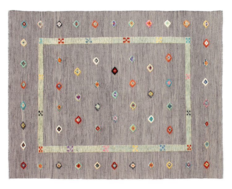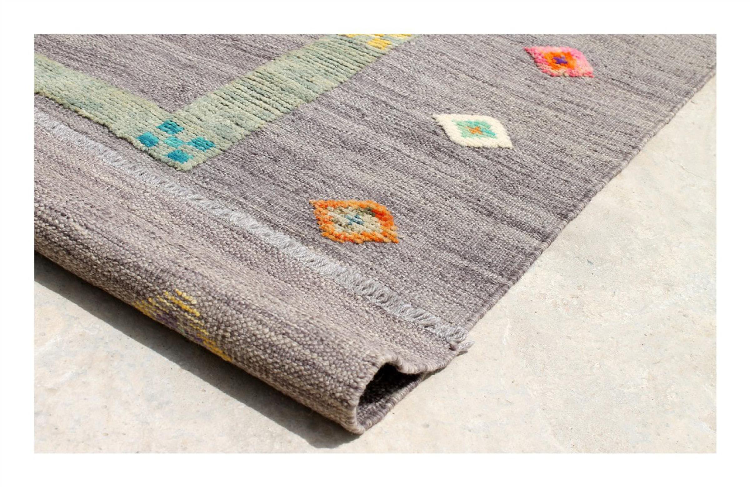 Esta alfombra fue hecha a mano en un telar como un tejido plano. Tejido plano es el término utilizado para describir las alfombras que no tienen pelo. Como el nombre promete, estas alfombras están tejidas y no anudadas. Esto resulta en una alfombra plana con una superficie estructurada. Los tejidos planos no son tan suaves y normalmente más delgados que las alfombras anudadas. Al mismo tiempo, su fabricación es mucho menos compleja y por lo general se pueden disponer por ambos lados (frontal y posterior). Sus patrones suelen ser geométricos, lo cual está determinado por el tejido.