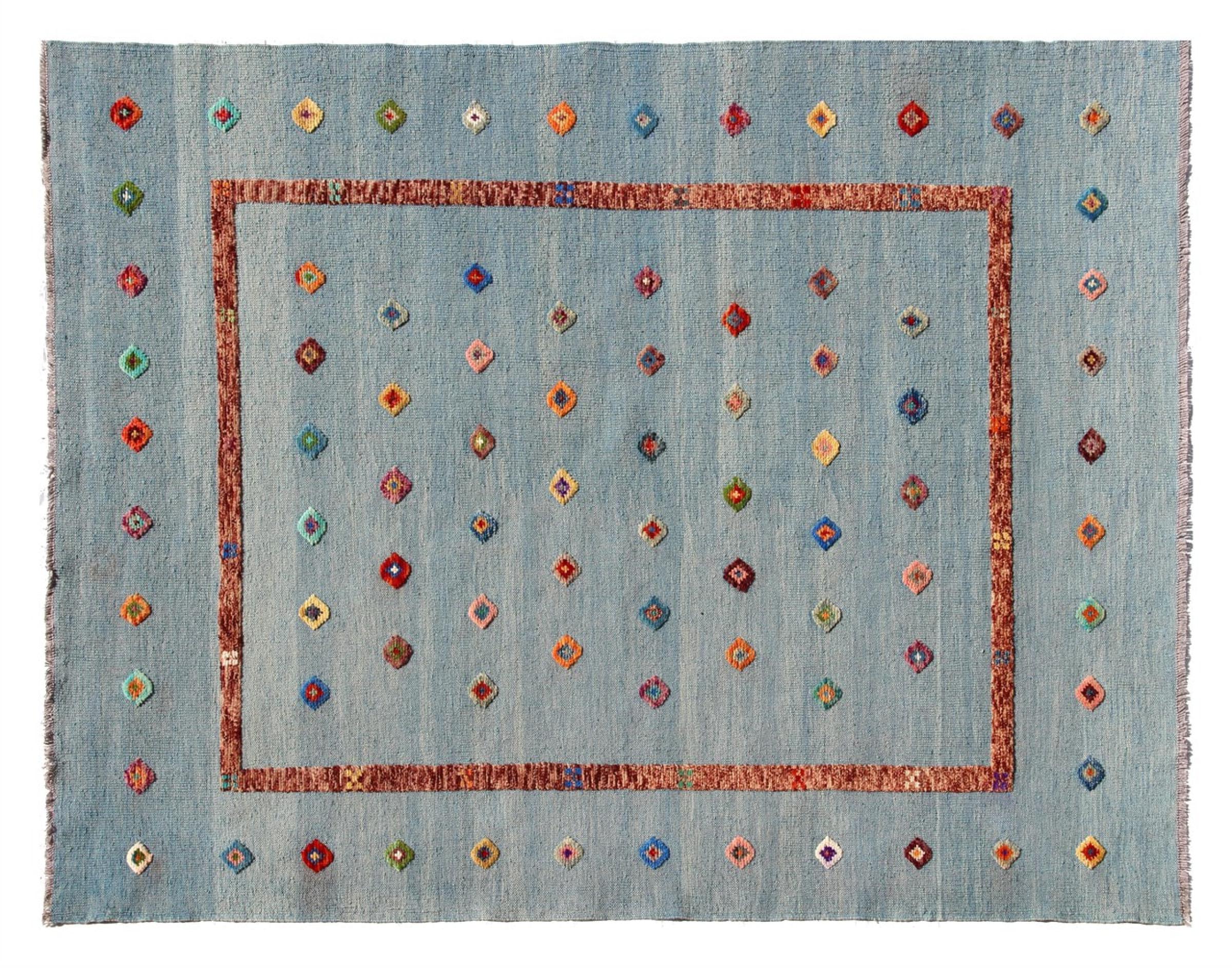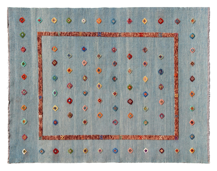 Esta alfombra fue hecha a mano en un telar como un tejido plano. Tejido plano es el término utilizado para describir las alfombras que no tienen pelo. Como el nombre promete, estas alfombras están tejidas y no anudadas. Esto resulta en una alfombra plana con una superficie estructurada. Los tejidos planos no son tan suaves y normalmente más delgados que las alfombras anudadas. Al mismo tiempo, su fabricación es mucho menos compleja y por lo general se pueden disponer por ambos lados (frontal y posterior). Sus patrones suelen ser geométricos, lo cual está determinado por el tejido.
