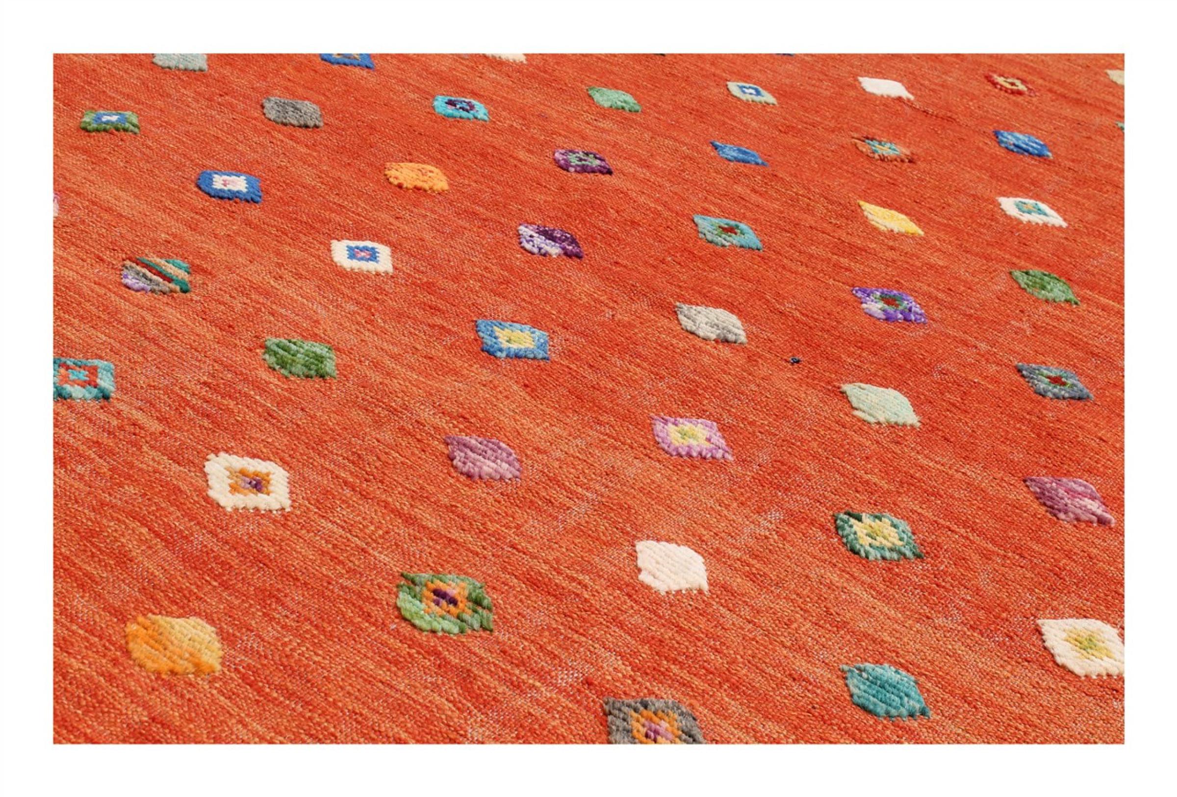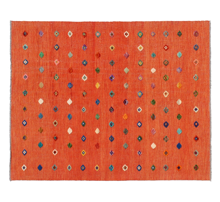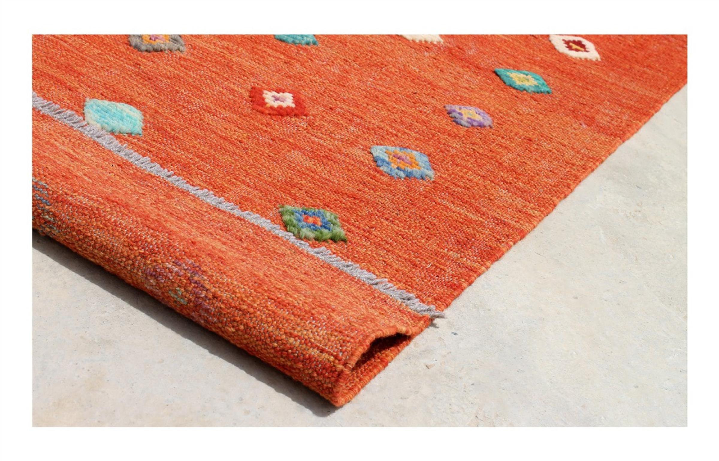 Esta alfombra fue hecha a mano en un telar como un tejido plano. Tejido plano es el término utilizado para describir las alfombras que no tienen pelo. Como el nombre promete, estas alfombras están tejidas y no anudadas. Esto resulta en una alfombra plana con una superficie estructurada. Los tejidos planos no son tan suaves y normalmente más delgados que las alfombras anudadas. Al mismo tiempo, su fabricación es mucho menos compleja y por lo general se pueden disponer por ambos lados (frontal y posterior). Sus patrones suelen ser geométricos, lo cual está determinado por el tejido.