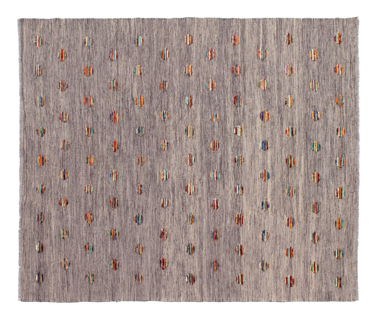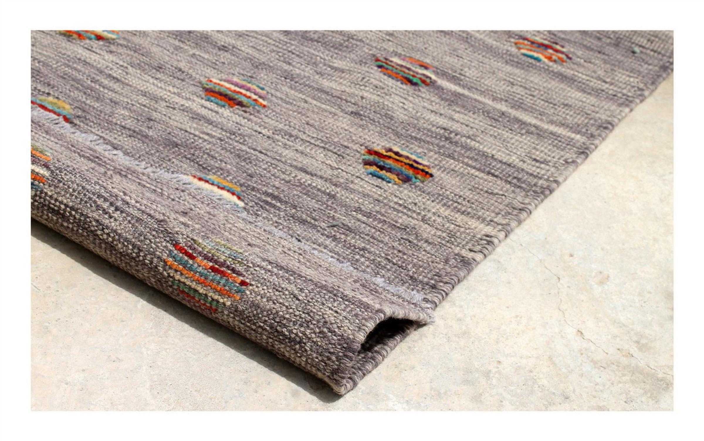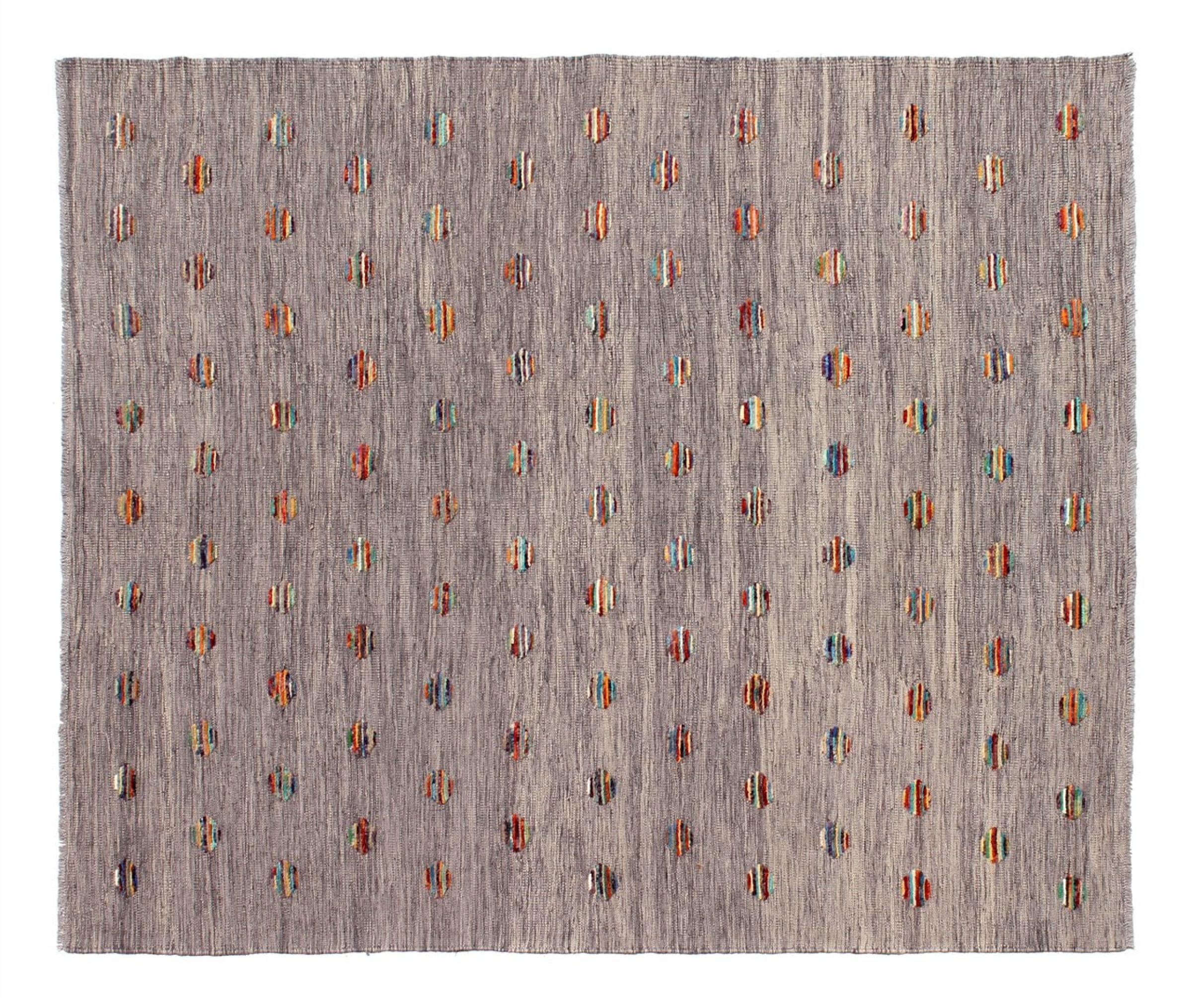 Esta alfombra fue hecha a mano en un telar como un tejido plano. Tejido plano es el término utilizado para describir las alfombras que no tienen pelo. Como el nombre promete, estas alfombras están tejidas y no anudadas. Esto resulta en una alfombra plana con una superficie estructurada. Los tejidos planos no son tan suaves y normalmente más delgados que las alfombras anudadas. Al mismo tiempo, su fabricación es mucho menos compleja y por lo general se pueden disponer por ambos lados (frontal y posterior). Sus patrones suelen ser geométricos, lo cual está determinado por el tejido.