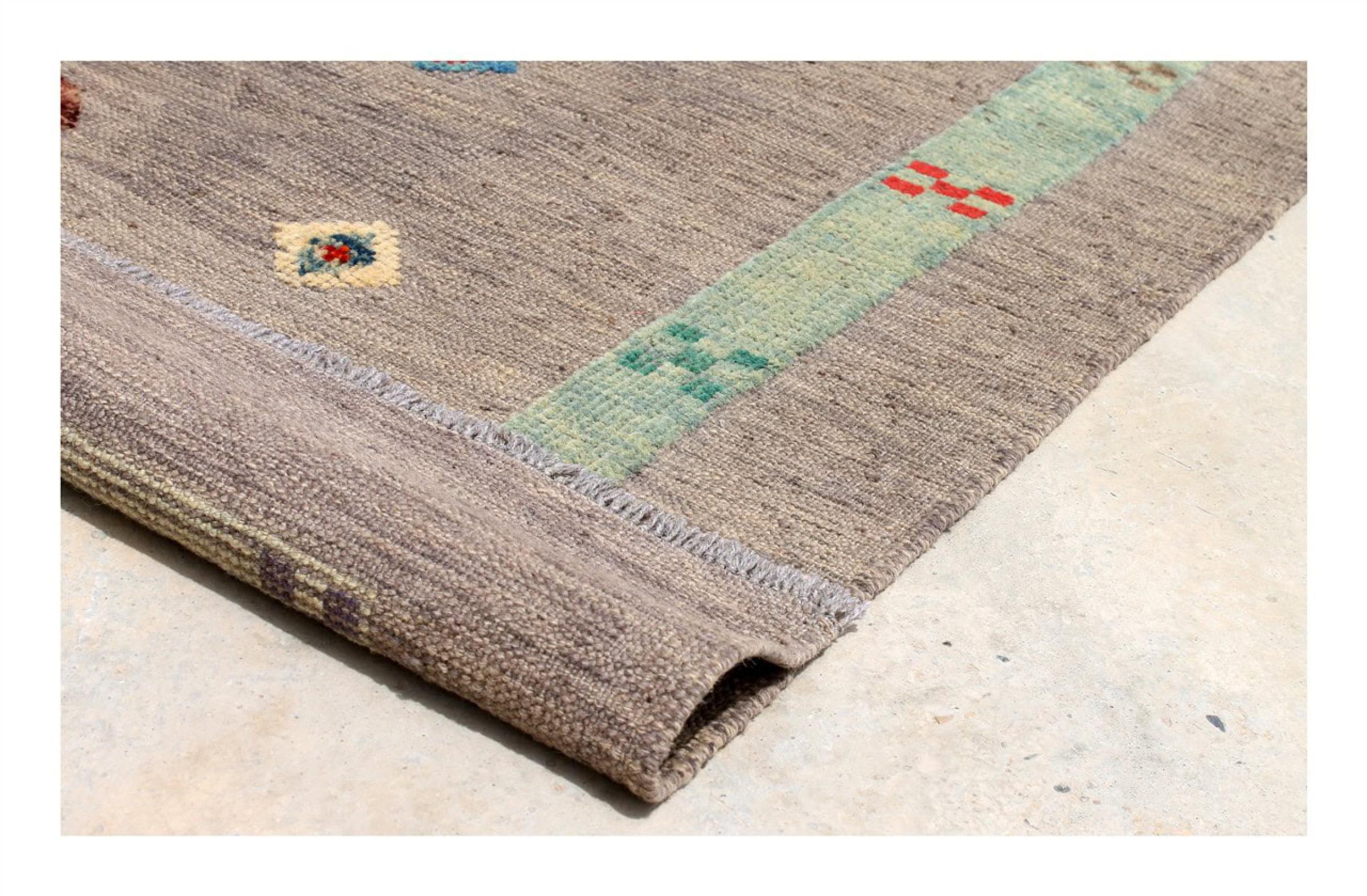 Esta alfombra fue hecha a mano en un telar como un tejido plano. Tejido plano es el término utilizado para describir las alfombras que no tienen pelo. Como el nombre promete, estas alfombras están tejidas y no anudadas. Esto resulta en una alfombra plana con una superficie estructurada. Los tejidos planos no son tan suaves y normalmente más delgados que las alfombras anudadas. Al mismo tiempo, su fabricación es mucho menos compleja y por lo general se pueden disponer por ambos lados (frontal y posterior). Sus patrones suelen ser geométricos, lo cual está determinado por el tejido.