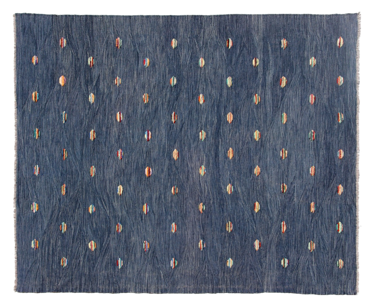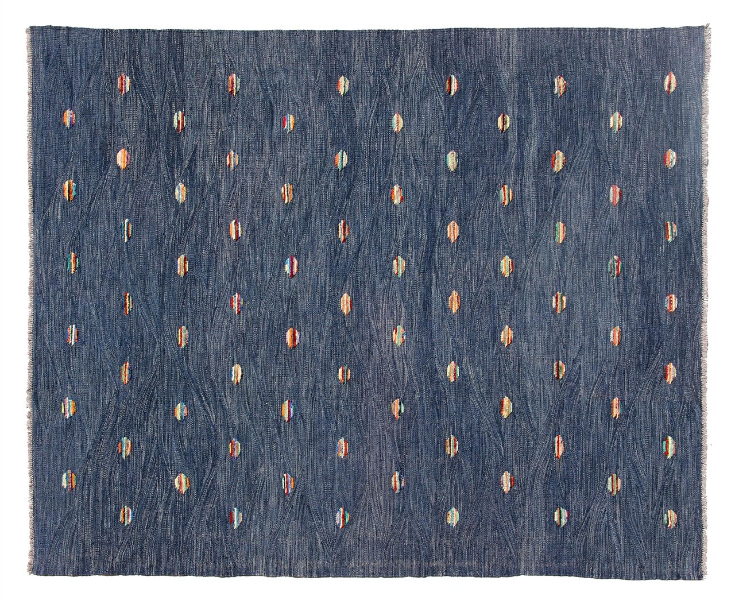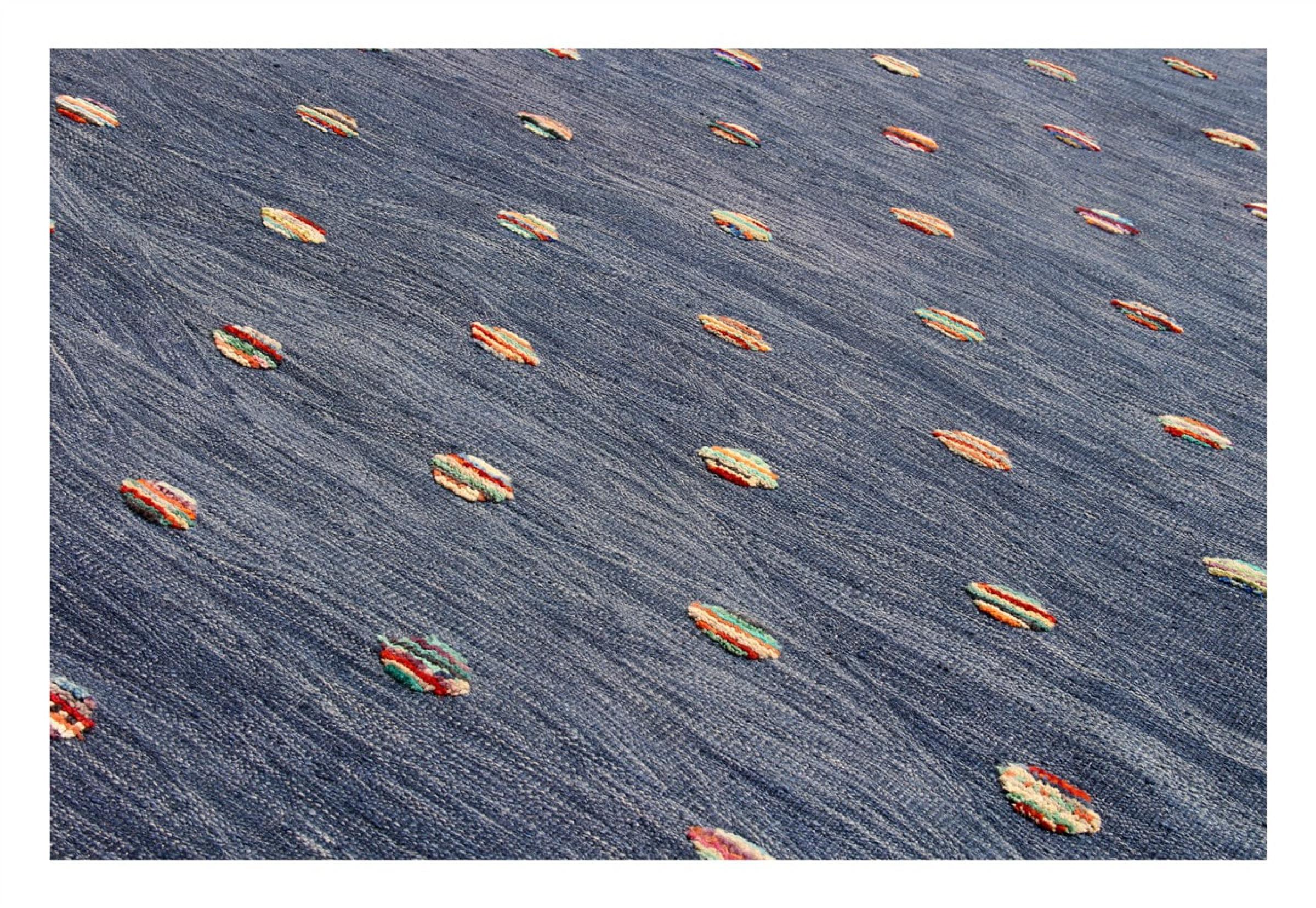 Esta alfombra fue hecha a mano en un telar como un tejido plano. Tejido plano es el término utilizado para describir las alfombras que no tienen pelo. Como el nombre promete, estas alfombras están tejidas y no anudadas. Esto resulta en una alfombra plana con una superficie estructurada. Los tejidos planos no son tan suaves y normalmente más delgados que las alfombras anudadas. Al mismo tiempo, su fabricación es mucho menos compleja y por lo general se pueden disponer por ambos lados (frontal y posterior). Sus patrones suelen ser geométricos, lo cual está determinado por el tejido.