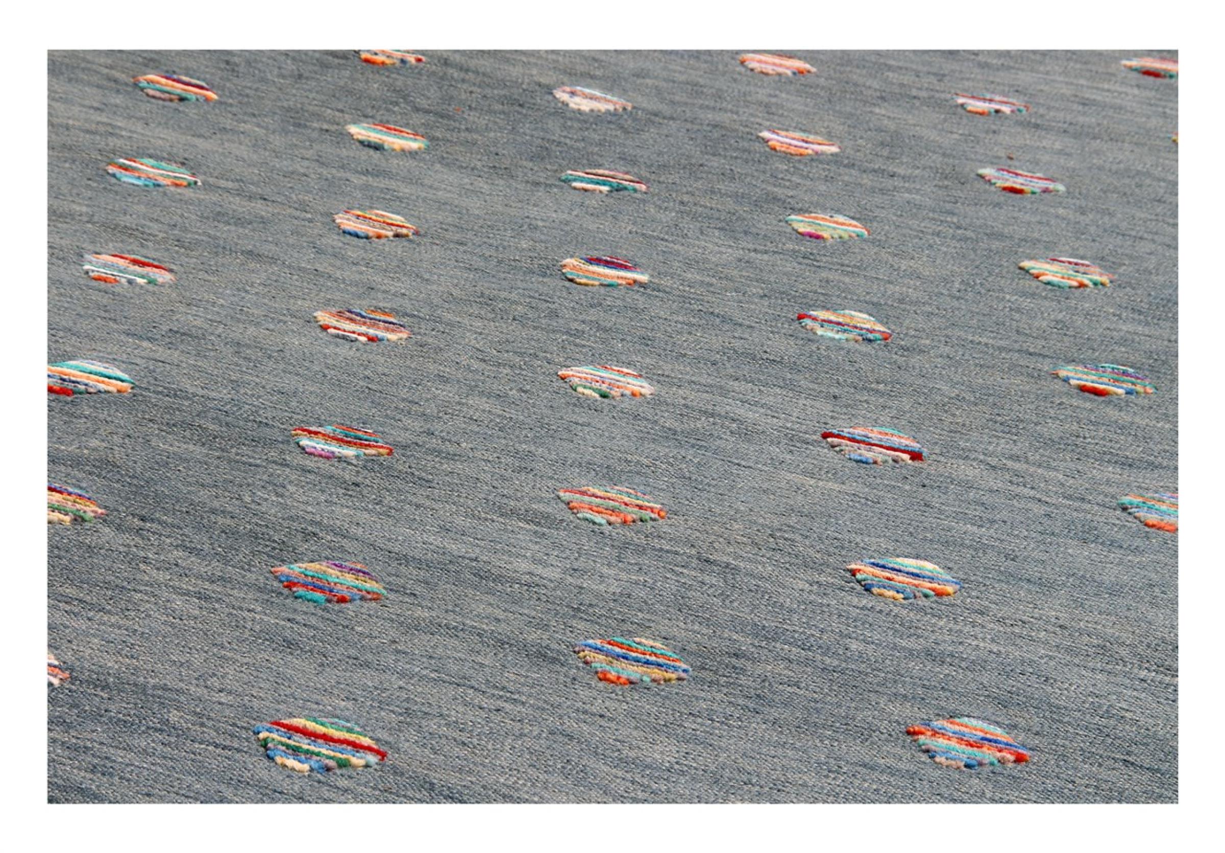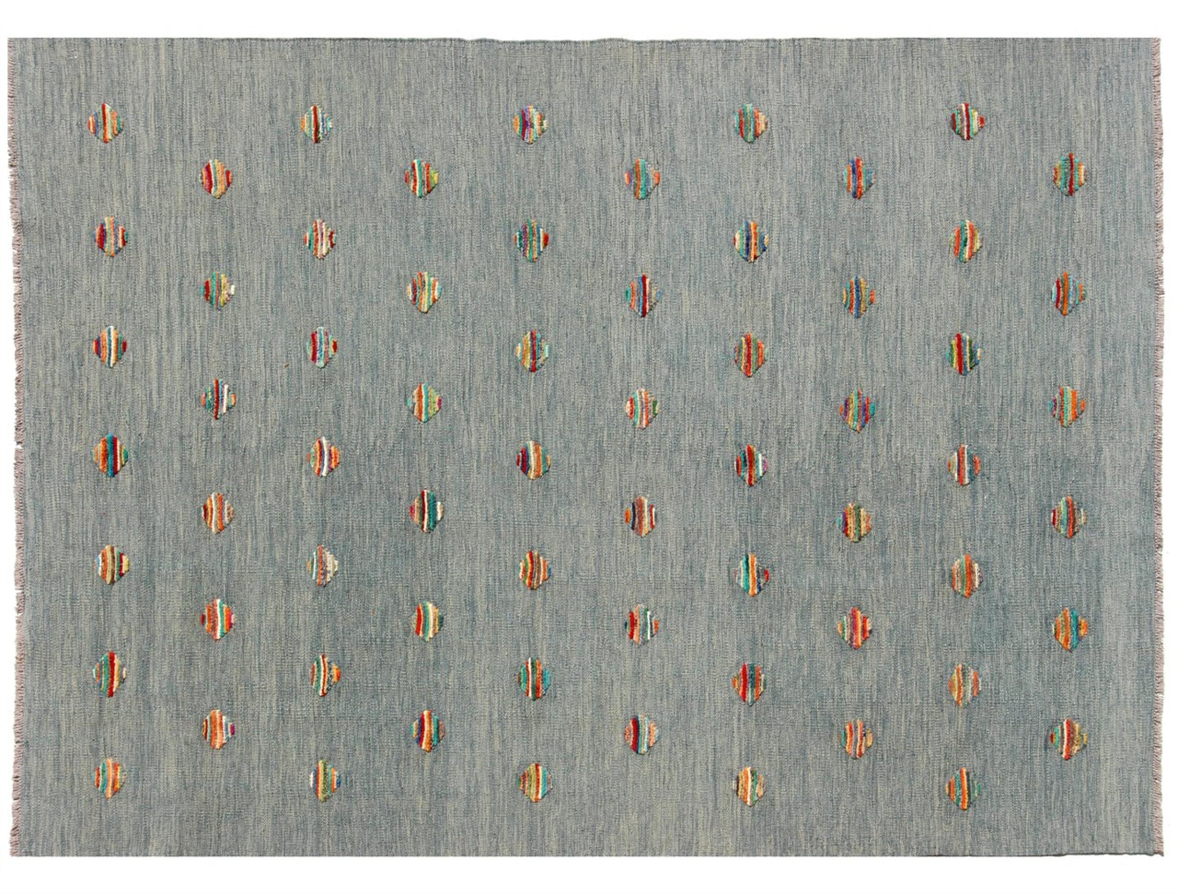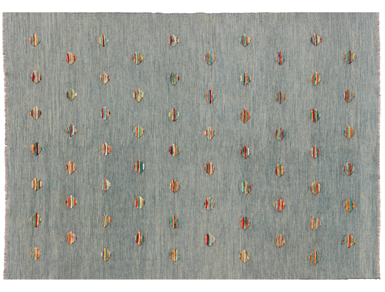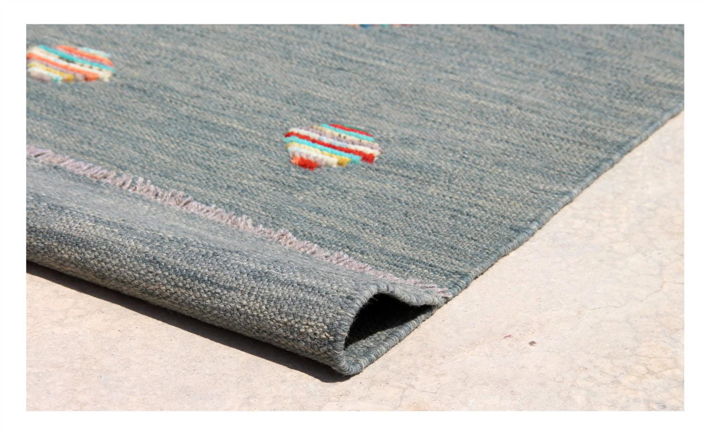 Esta alfombra fue hecha a mano en un telar como un tejido plano. Tejido plano es el término utilizado para describir las alfombras que no tienen pelo. Como el nombre promete, estas alfombras están tejidas y no anudadas. Esto resulta en una alfombra plana con una superficie estructurada. Los tejidos planos no son tan suaves y normalmente más delgados que las alfombras anudadas. Al mismo tiempo, su fabricación es mucho menos compleja y por lo general se pueden disponer por ambos lados (frontal y posterior). Sus patrones suelen ser geométricos, lo cual está determinado por el tejido.